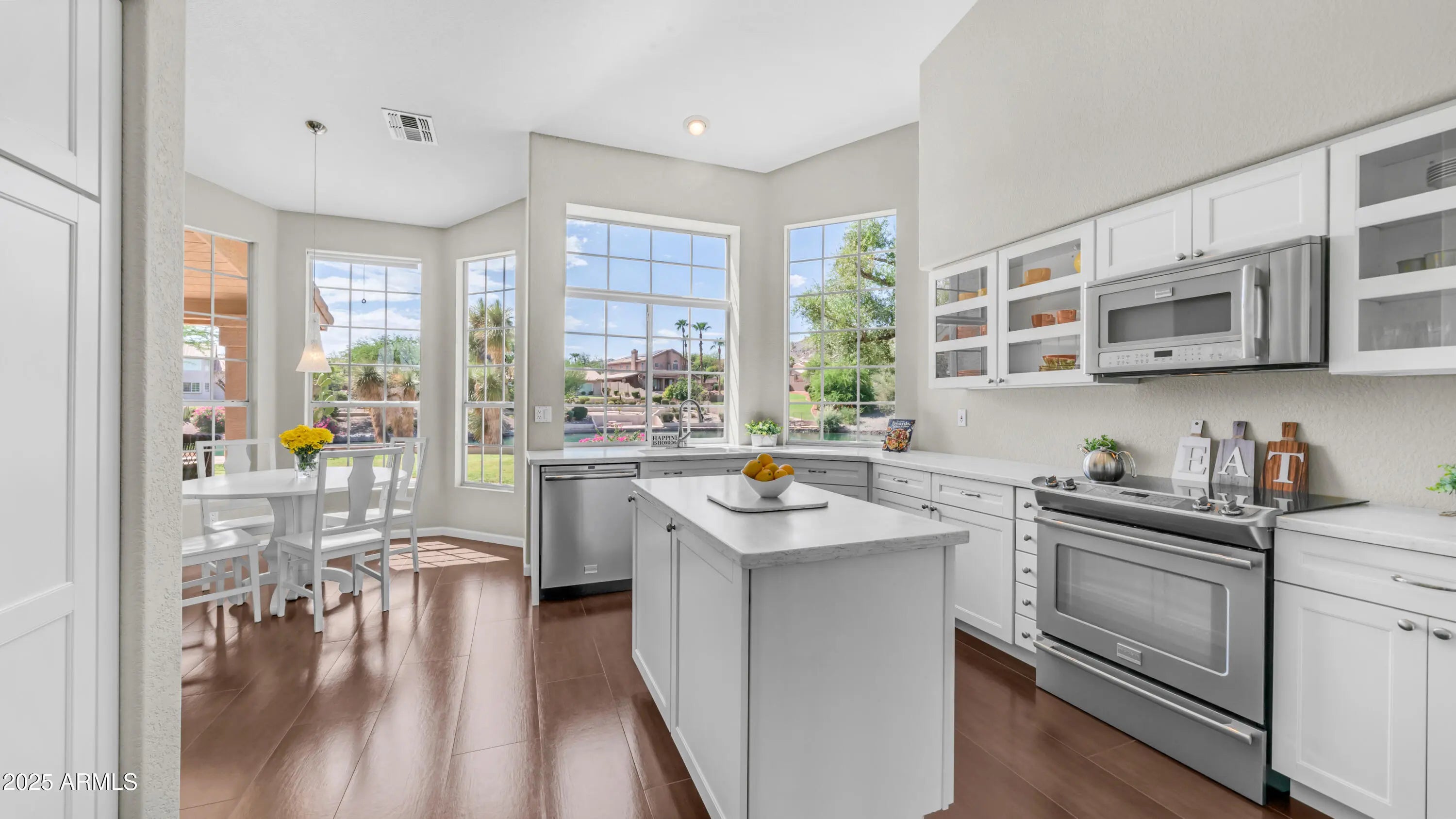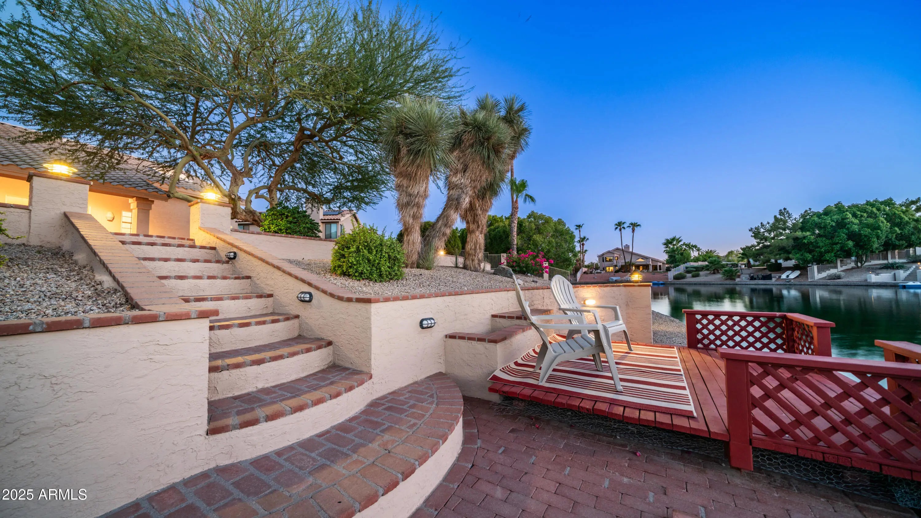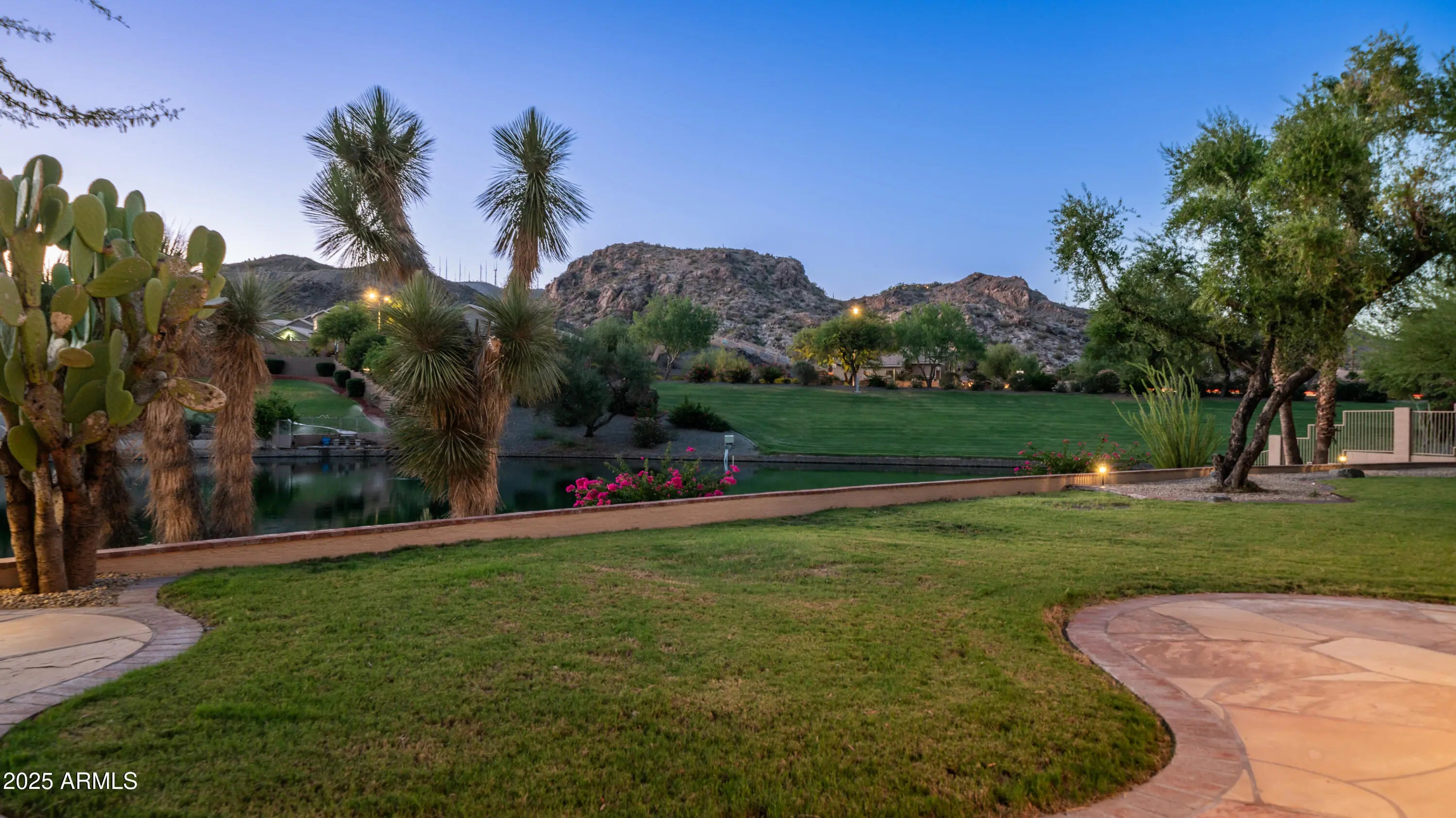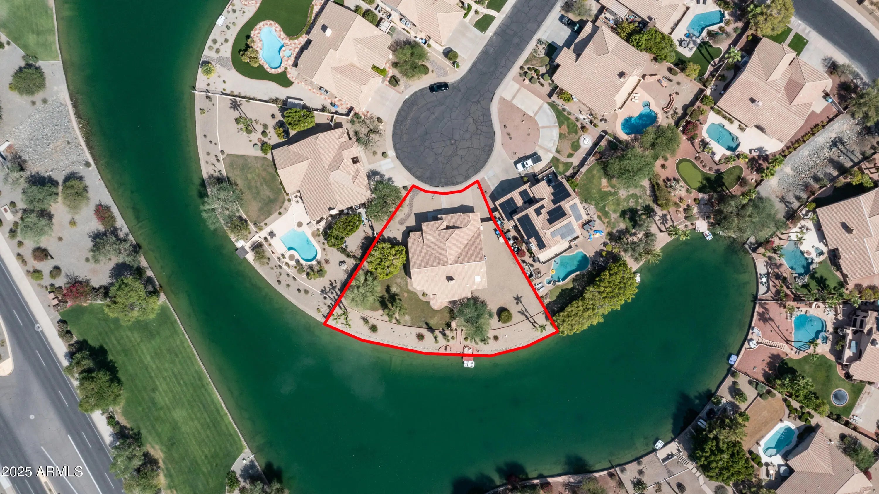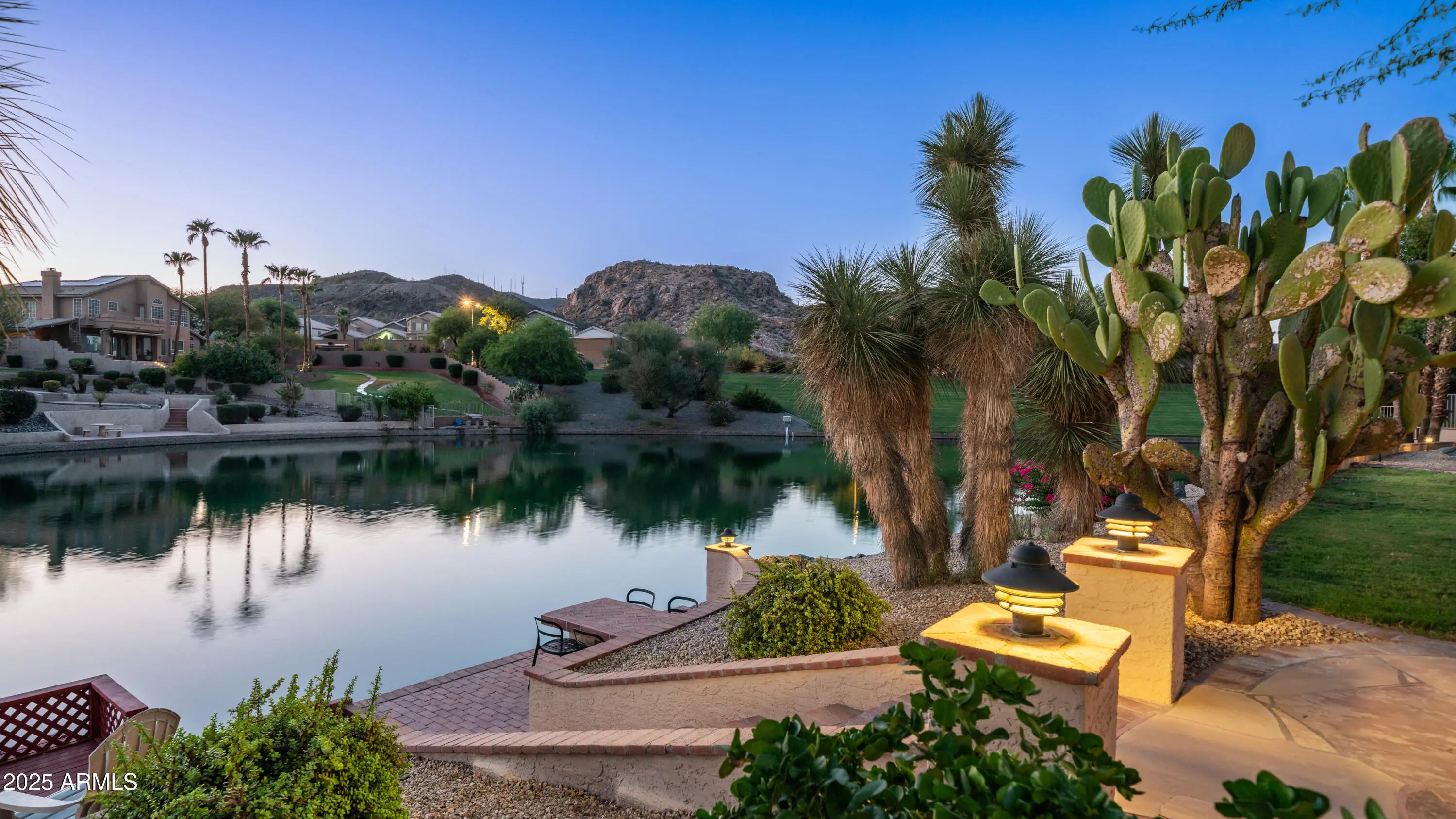 Discover a once-in-a-lifetime opportunity to own one of the largest lakefront lots in Canyon Springs. This exceptional single-story home is immaculately maintained and nestled on an expansive cul-de-sac lot, offering serene waterfront views, unmatched privacy, and exclusive access to a lakeside lifestyle. Step outside to your private dock, complete with a fire pit and a pedal boat, providing effortless access to tranquil waters and the ultimate lake experience. Enter a world of luxury and comfort in this thoughtfully designed home. Neutral tile floors flow seamlessly through the main living areas, while plush carpeting adds warmth to select spaces. The heart of the home features an updated kitchen that dazzles with custom cabinetry, gleaming Corian countertops, and a spacious island with abundant storageperfect for casual dining or sophisticated entertaining. The primary suite serves as a private retreat, offering direct access to the backyard and an updated bathroom that boasts custom cabinetry, dual vanities, sleek countertops, and a spa-like oversized shower. The fully outfitted custom closet combines thoughtful organization with elevated design, blending form and function effortlessly. Two generously sized secondary bedrooms and an updated secondary bath, featuring a custom tiled shower and ample storage, ensure comfort for family or guests. Additional features include a large laundry room and a spacious 3-car garage, complete with cabinets and fresh epoxy-coated floors. 3rd bedroom is currently being used as a den. Pictures are virtually staged. Enjoy stunning lakefront views and incredible mountain scenery in the highly sought-after Ahwatukee Foothills area.