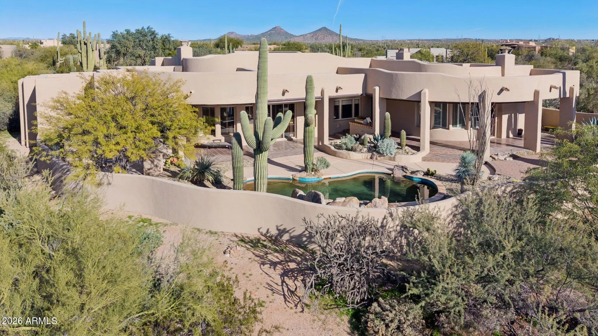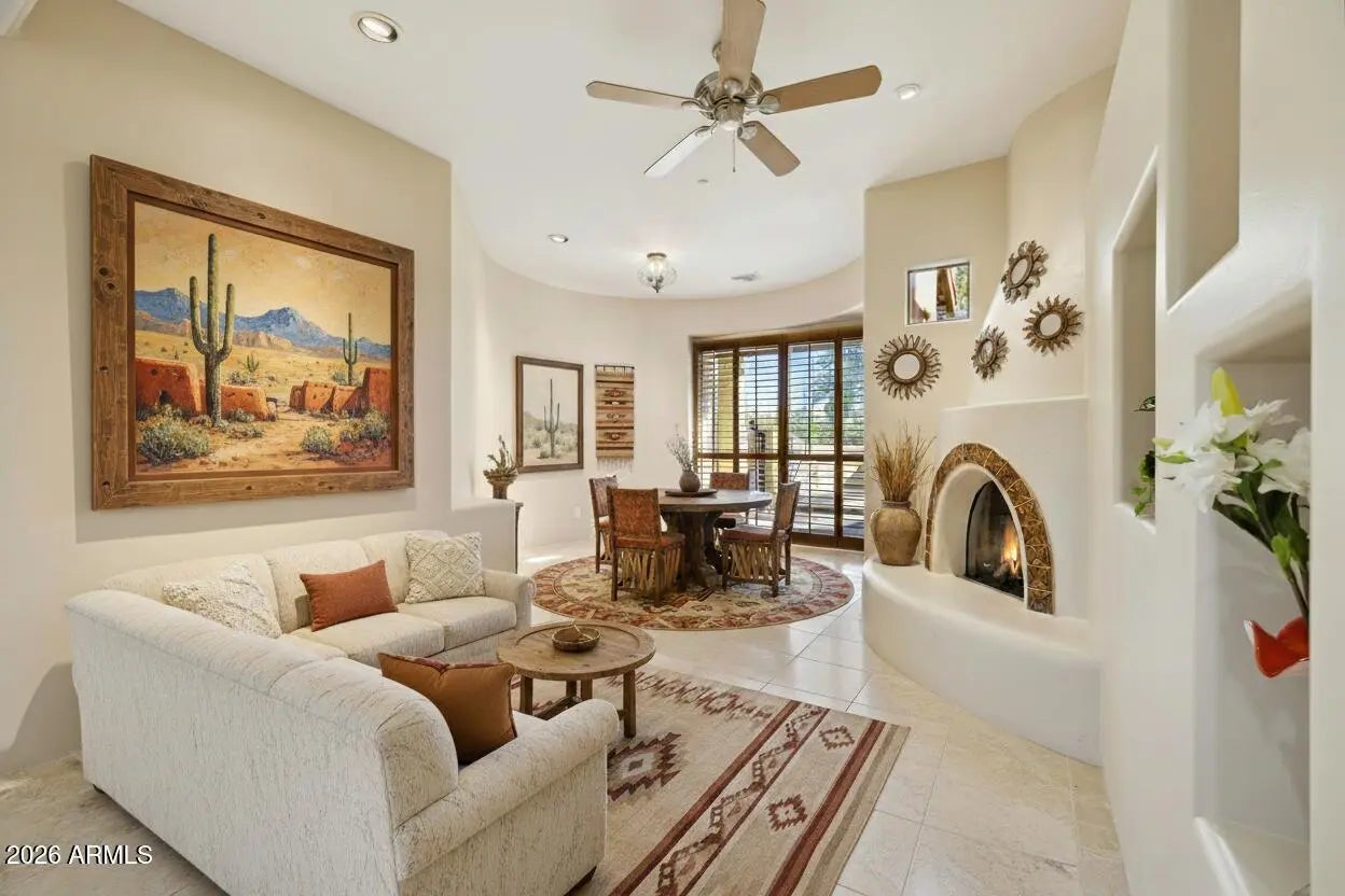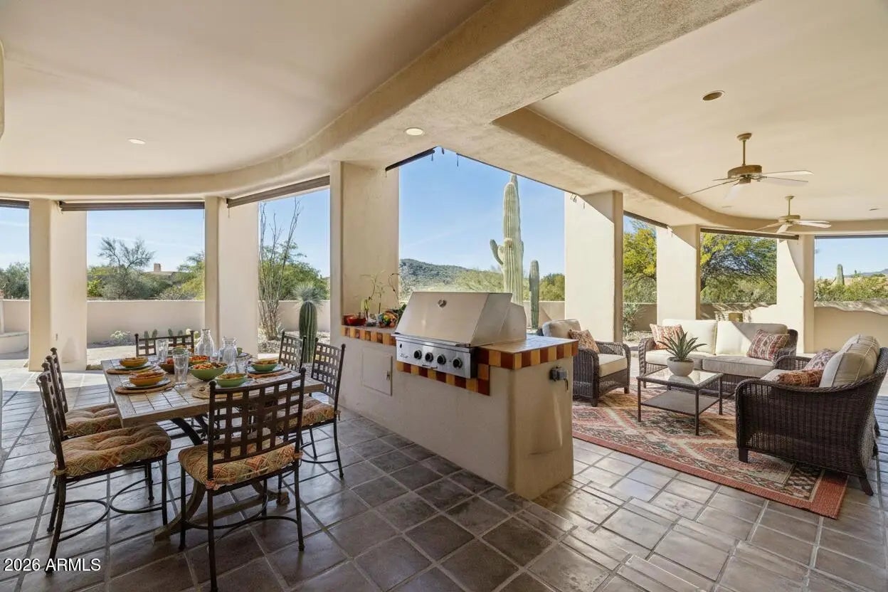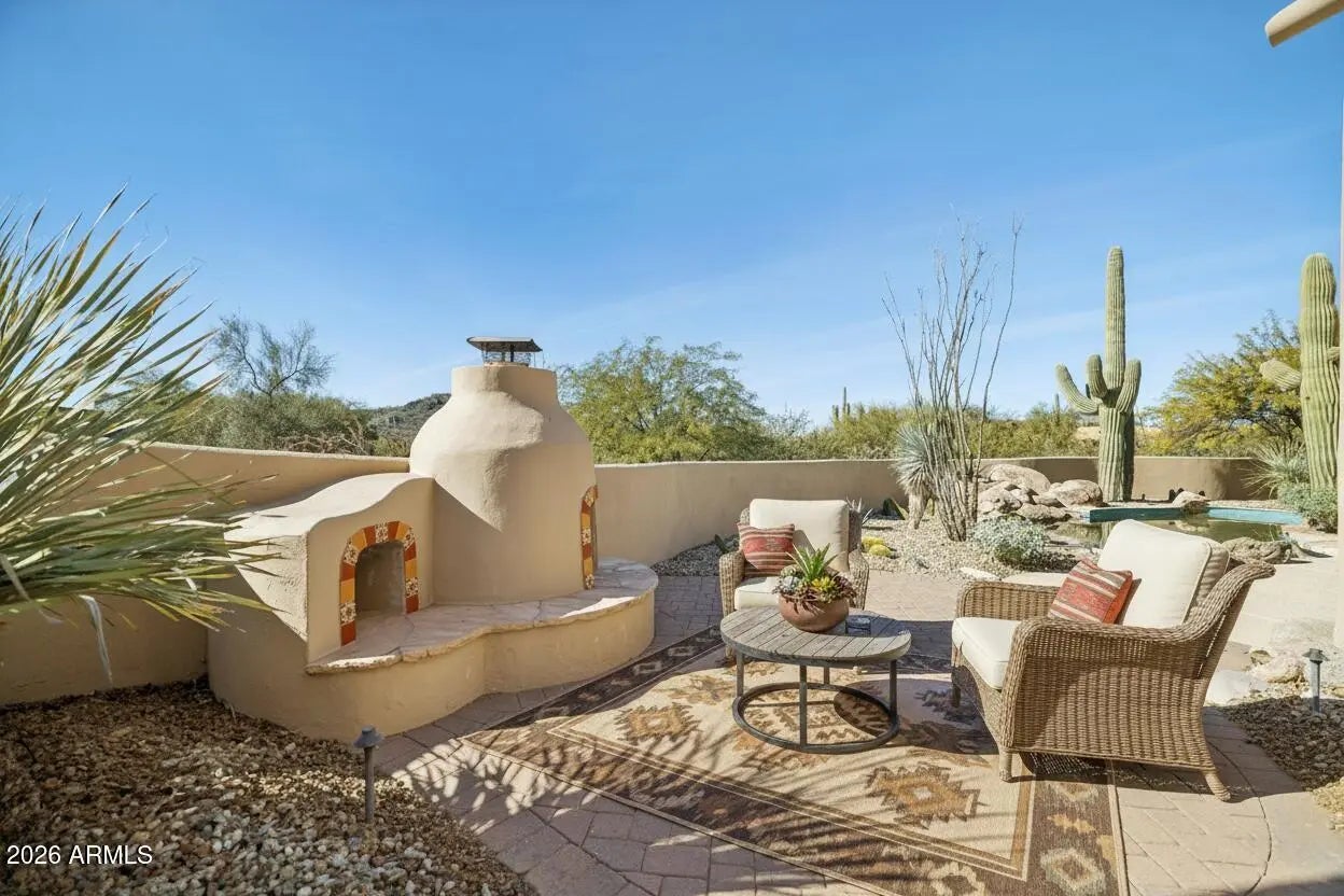 Nestled on an expansive 1.1-acre interior lot within the prestigious guard-gated enclave of Sincuidados, this striking 3,811-square-foot estate redefines luxurious desert living. Sweeping, unobstructed vistas frame the dramatic Southwest landscape from every window, creating a daily spectacle of sunrises, sunsets, and starlit skies that feels like a private nature show. Thoughtfully designed for both comfort and sophistication, the residence offers four generously appointed bedrooms, three and a half bathrooms, and a very private office space. A connecting Zen den links the serenity of the primary suite with the kitchen and main living areas, while a spacious 4 car garage provides room for vehicles, & desert adventure toys. Rich wood & elegant travertine flooring flow throughout infusing each room with a warm, timeless ambiance that beautifully complements the home's authentic Southwest architectural character. The result is a refined yet inviting interior that feels both grand and effortlessly livable with unobstructed views of Lone Mountain with 3 hiking trails. At the heart of the home, the spectacular gourmet chef's kitchen serves as a true culinary sanctuary. Handcrafted Rysso-Peters custom cabinetry, luxurious granite countertops, and a premium stainless steel appliance suite including Sub-Zero, Dacor, and Asko combine high design with everyday functionality. A professional-style six-burner gas range, dual ovens, recessed microwave, and convenient pot filler elevate every meal from simple weeknight dinners to elaborate entertaining. Wine enthusiasts will savor the 90-bottle Sub-Zero wine chiller, seamlessly integrated into the custom cabinetry to create a showpiece worthy of any serious collector. Four distinctive fireplaces, each adorned with artistic tile accents, are thoughtfully positioned throughout the home to encourage intimate gatherings and quiet moments. One graces the expansive primary suite, wrapping the space in soft, ambient glow on cool desert evenings Across the main living areas, these fireplaces add layers of texture, character, and warmth, transforming the residence into a sanctuary that feels uniquely personal in every season. The outdoor living experience is nothing short of resort-caliber, blurring the line between home and private desert retreat. A sparkling pool with tranquil waterfall creates a soothing soundscape, inviting you to lounge, entertain, or simply unwind beneath the open Sonoran sky. An architectural spiral staircase rises to an elevated rooftop deck, where endless desert horizons and vast night skies provide a dramatic backdrop for sunset cocktails, stargazing, or unforgettable evenings with guests. Set within Sincuidados, one of North Scottsdale's most coveted guard-gated communities, residents enjoy a rare blend of privacy, natural beauty, and refined amenities, with expansive one-plus-acre lots, protected Sonoran Desert landscape, community hiking trails, and a clubhouse with tennis and pickleball courts. This is more than a home it is an elevated Southwest lifestyle, seamlessly uniting sophisticated elegance, modern convenience, and the timeless allure of the desert in an extraordinary Sincuidados estate.