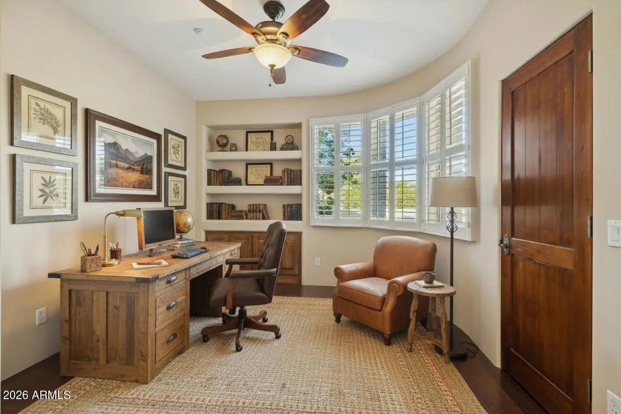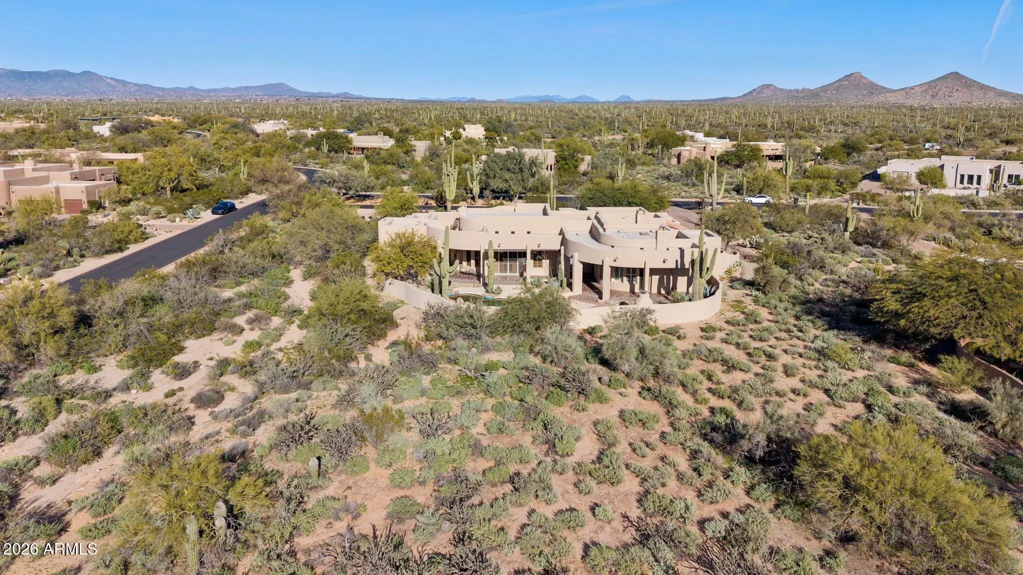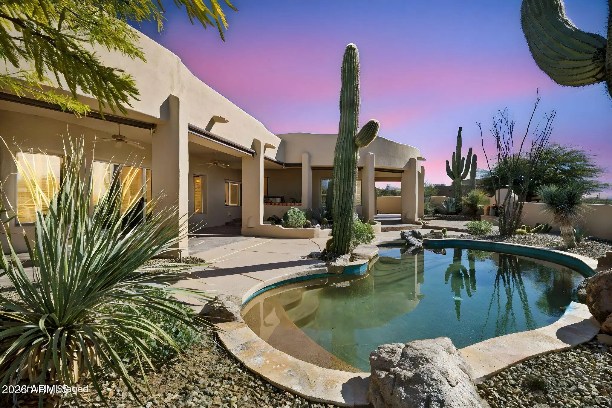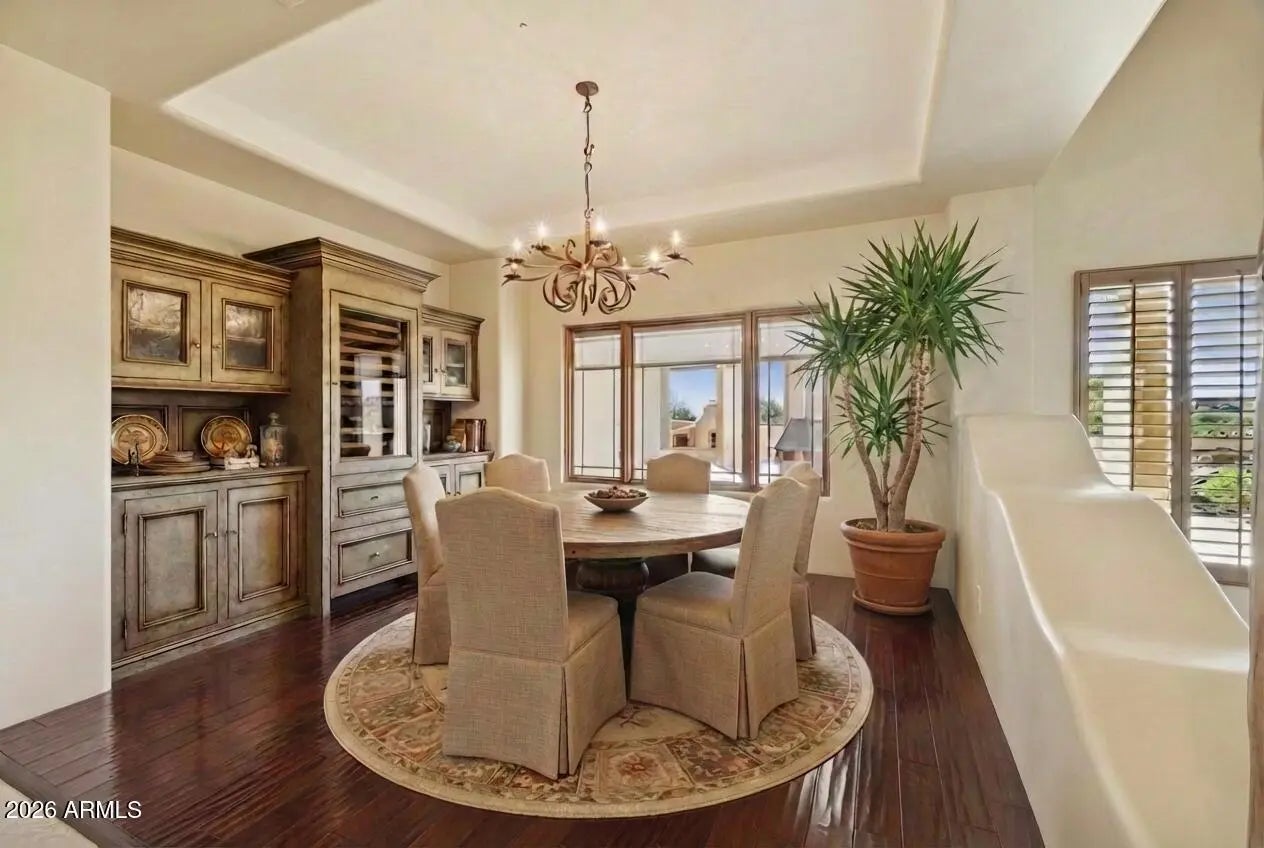 Nestled on an expansive 1.1-acre interior lot within the prestigious guard-gated enclave of Sincuidados, this striking 3,811-square-foot estate redefines luxurious desert living. Sweeping, unobstructed vistas frame the dramatic Southwest landscape from every window, creating a daily spectacle of sunrises, sunsets, and starlit skies that feels like a private nature show. Thoughtfully designed for both comfort and sophistication, the residence offers four generously appointed bedrooms, three and a half bathrooms, and a very private office space. A connecting Zen den links the serenity of the primary suite with the kitchen and main living areas, while a spacious 4 car garage provides room for vehicles, & desert adventure toys. Rich wood & elegant travertine flooring flow throughout infusing each room with a warm, timeless ambiance that beautifully complements the home's authentic Southwest architectural character. The result is a refined yet inviting interior that feels both grand and effortlessly livable with unobstructed views of Lone Mountain with 3 hiking trails. At the heart of the home, the spectacular gourmet chef's kitchen serves as a true culinary sanctuary. Handcrafted Rysso-Peters custom cabinetry, luxurious granite countertops, and a premium stainless steel appliance suite including Sub-Zero, Dacor, and Asko combine high design with everyday functionality. A professional-style six-burner gas range, dual ovens, recessed microwave, and convenient pot filler elevate every meal from simple weeknight dinners to elaborate entertaining. Wine enthusiasts will savor the 90-bottle Sub-Zero wine chiller, seamlessly integrated into the custom cabinetry to create a showpiece worthy of any serious collector. Four distinctive fireplaces, each adorned with artistic tile accents, are thoughtfully positioned throughout the home to encourage intimate gatherings and quiet moments. One graces the expansive primary suite, wrapping the space in soft, ambient glow on cool desert evenings Across the main living areas, these fireplaces add layers of texture, character, and warmth, transforming the residence into a sanctuary that feels uniquely personal in every season. The outdoor living experience is nothing short of resort-caliber, blurring the line between home and private desert retreat. A sparkling pool with tranquil waterfall creates a soothing soundscape, inviting you to lounge, entertain, or simply unwind beneath the open Sonoran sky. An architectural spiral staircase rises to an elevated rooftop deck, where endless desert horizons and vast night skies provide a dramatic backdrop for sunset cocktails, stargazing, or unforgettable evenings with guests. Set within Sincuidados, one of North Scottsdale's most coveted guard-gated communities, residents enjoy a rare blend of privacy, natural beauty, and refined amenities, with expansive one-plus-acre lots, protected Sonoran Desert landscape, community hiking trails, and a clubhouse with tennis and pickleball courts. This is more than a home it is an elevated Southwest lifestyle, seamlessly uniting sophisticated elegance, modern convenience, and the timeless allure of the desert in an extraordinary Sincuidados estate.