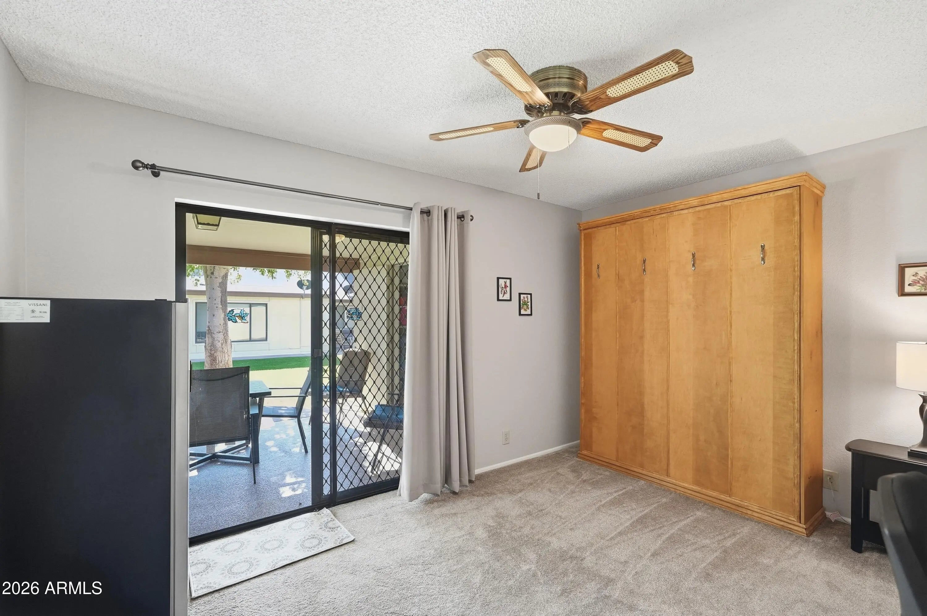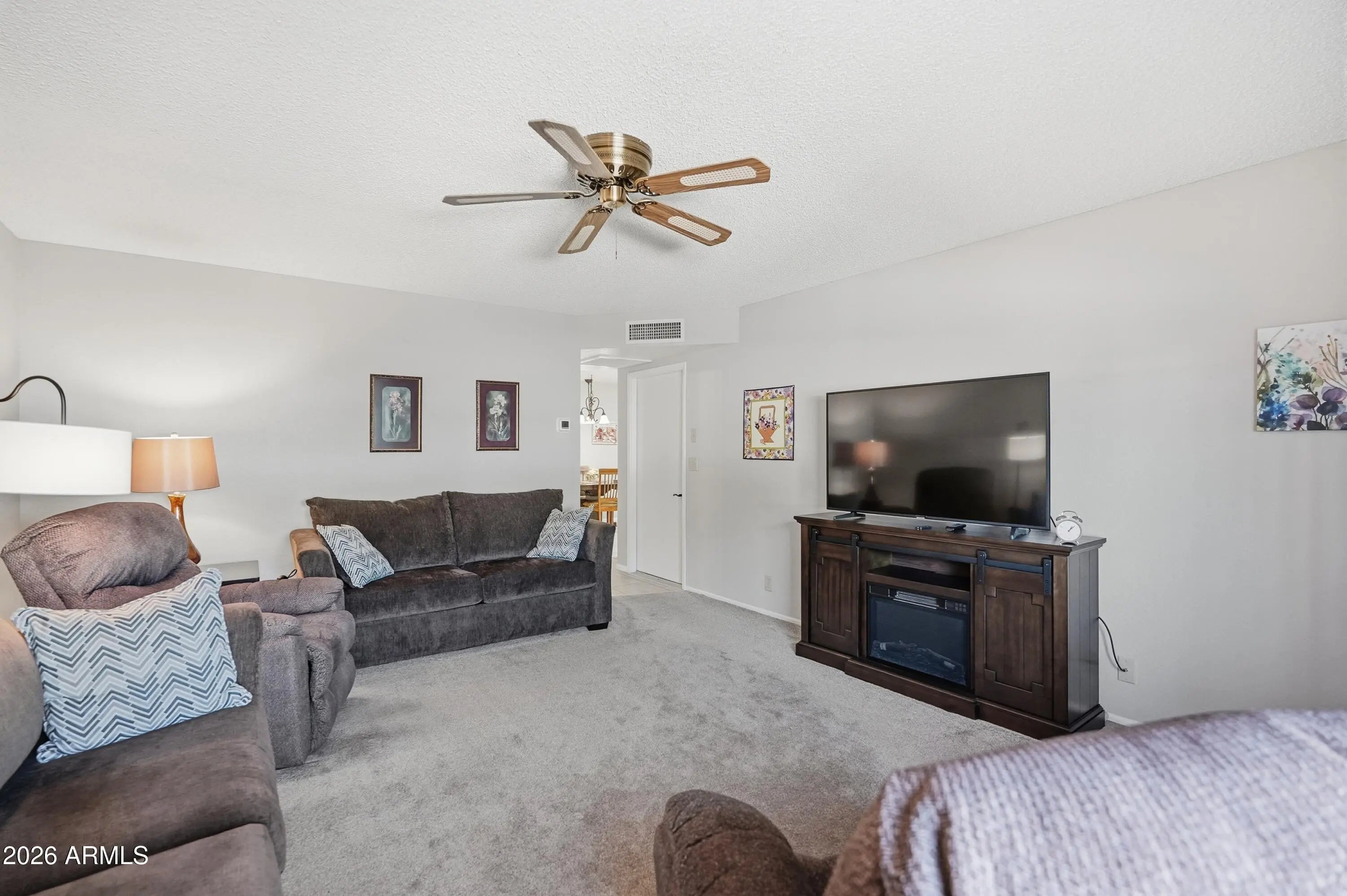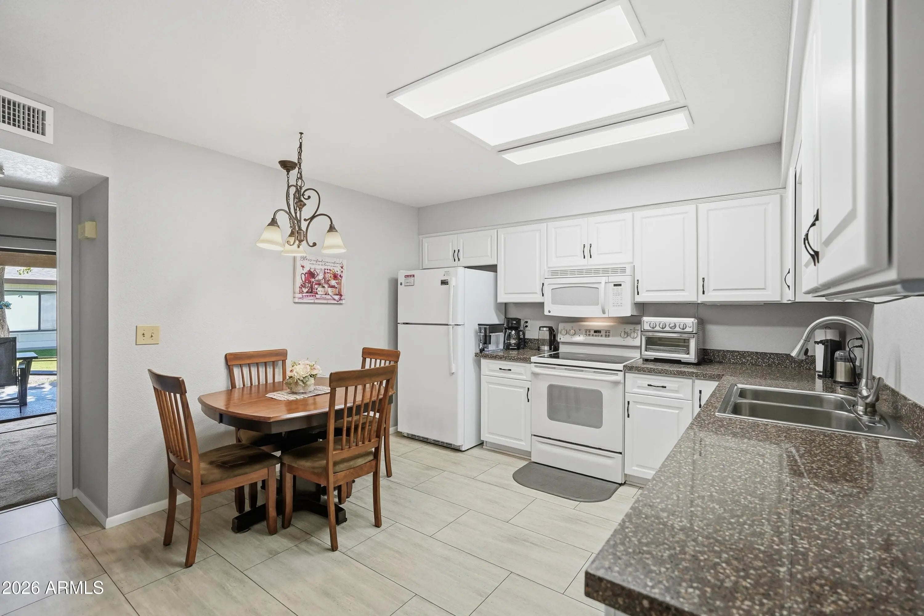 Just bring your toothbrush! This updated, fully furnished 2-bedroom, 2-bath condo is the perfect opportunity to enjoy the lock-and-leave Arizona lifestyle. Start your mornings with coffee on the charming north-facing front patio and unwind in the afternoons on the spacious, private south-facing back patio with views of the lush grassy common area—ideal for relaxing or outdoor dining. Inside, the bright and open living room flows seamlessly into the kitchen, which features an eat-in dining area for casual meals. The primary suite offers a private bathroom with walk-in shower and a generous walk-in closet. The versatile second room is currently set up as a multi-use space with a Murphy bed, office area, and closet, making it ideal as a guest room, home office, or second bedroom. This room opens directly to the sunny back patio, enhancing indoor-outdoor living. Washer, dryer, appliances and all furniture stay with the condo; it's all ready for you and making it easy to enjoy the SVE Life. Located in Sunland Village East, residents enjoy low annual HOA fees and an abundance of amenities truly an adult playground. Please note: the association does not allow pets.