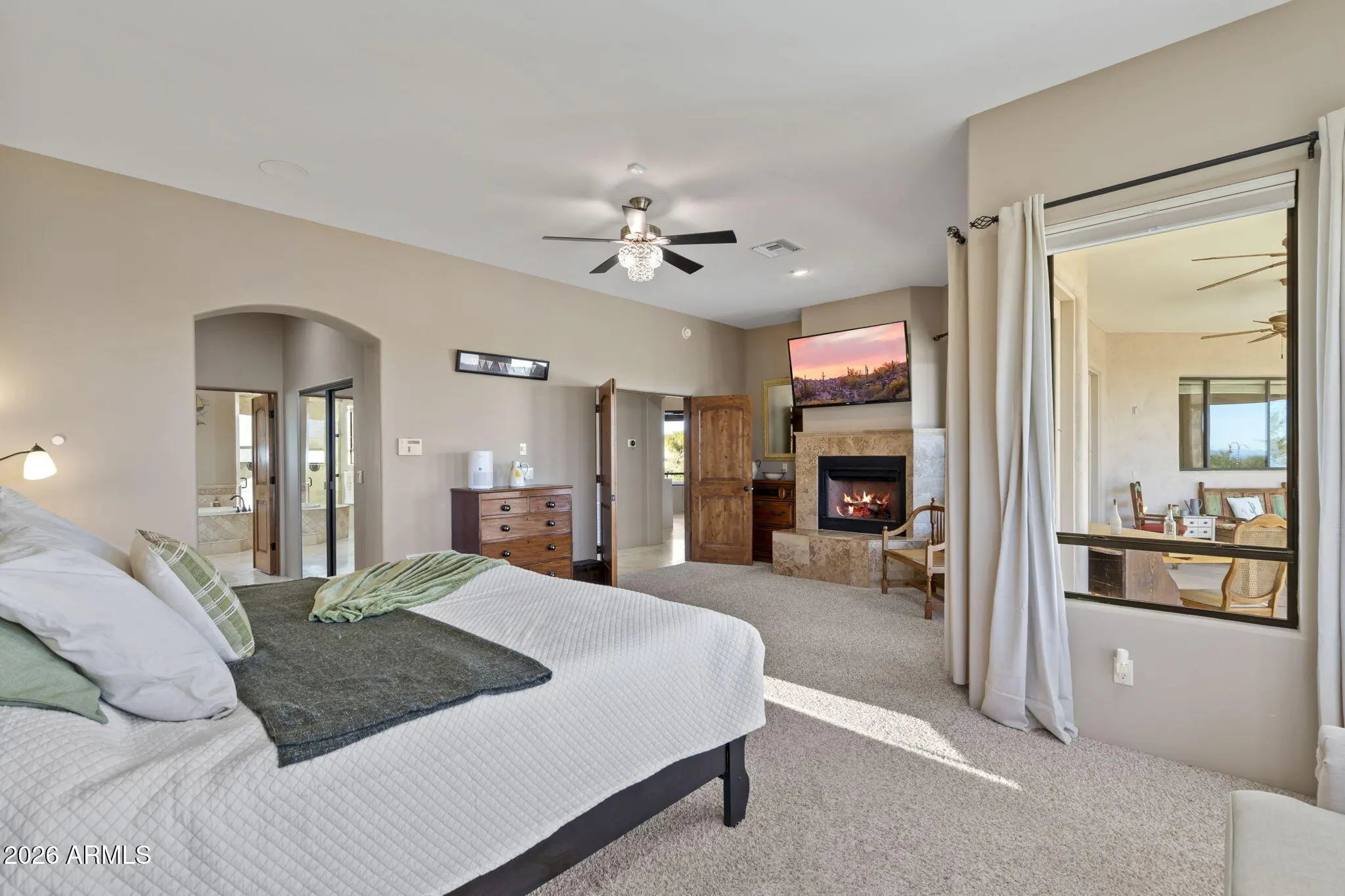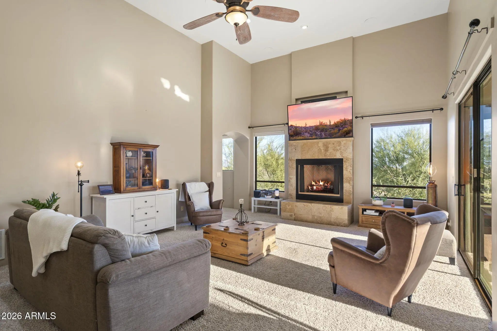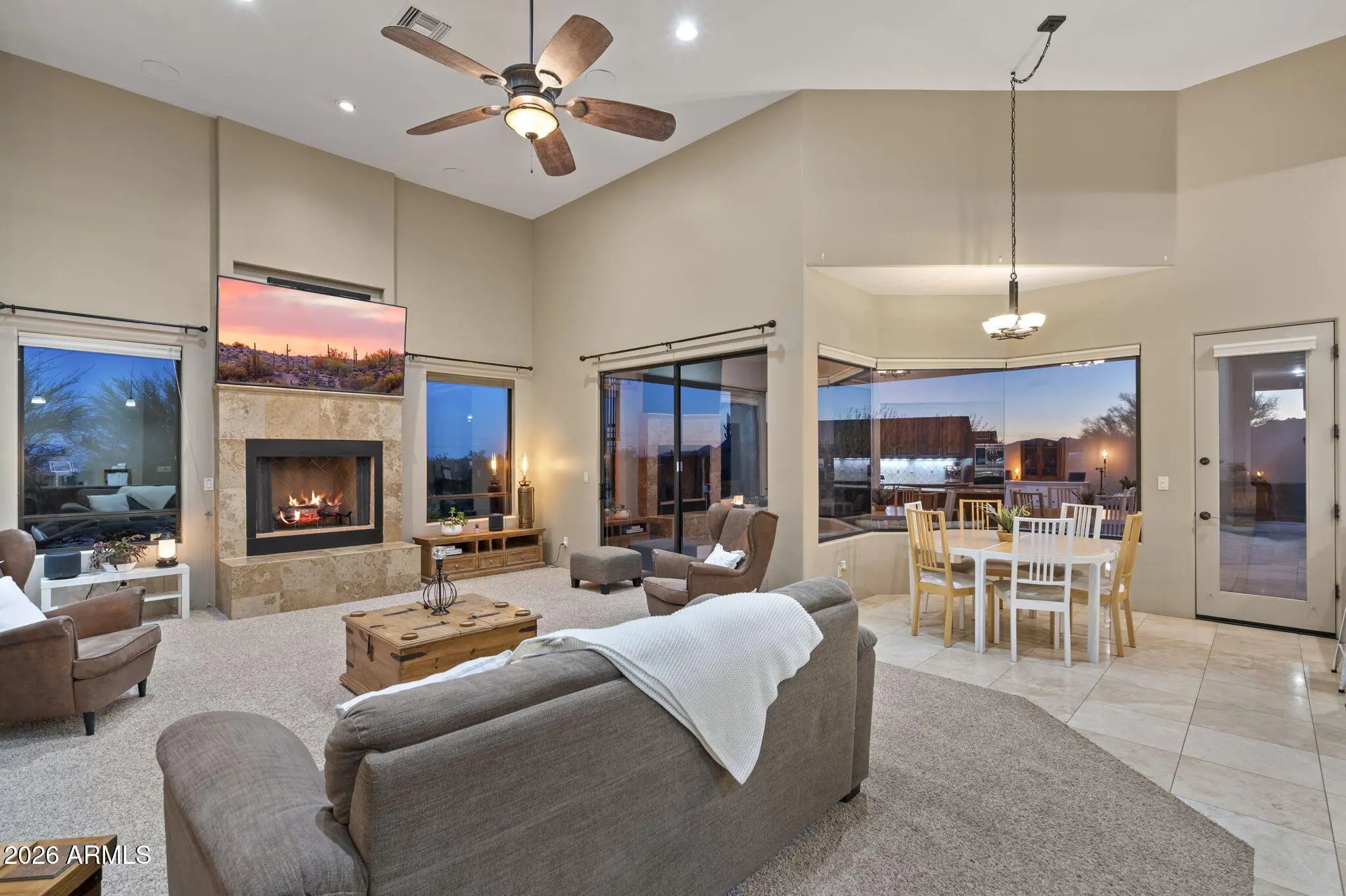 A private North Scottsdale desert retreat on a beautifully landscaped one-acre lot w sweeping mountain views and nearby hiking trails. The spacious split floor plan features soaring 15' ceilings and a large family room w step-down wet bar, ideal for entertaining. The gourmet kitchen offers granite countertops, stainless steel appliances, walk-in pantry, and generous island with breakfast bar. The primary suite includes a fireplace and spa-like bath w dual vanities and jetted tub. Enjoy eco-friendly living with approximately $70k in fully owned solar panels and battery backup, two brand-new HVAC systems, and a new heat-exchange water heater (2024). Additional highlights include wraparound patios, rooftop deck, two fireplaces, and a three-car garage. Roof updated in 2022.