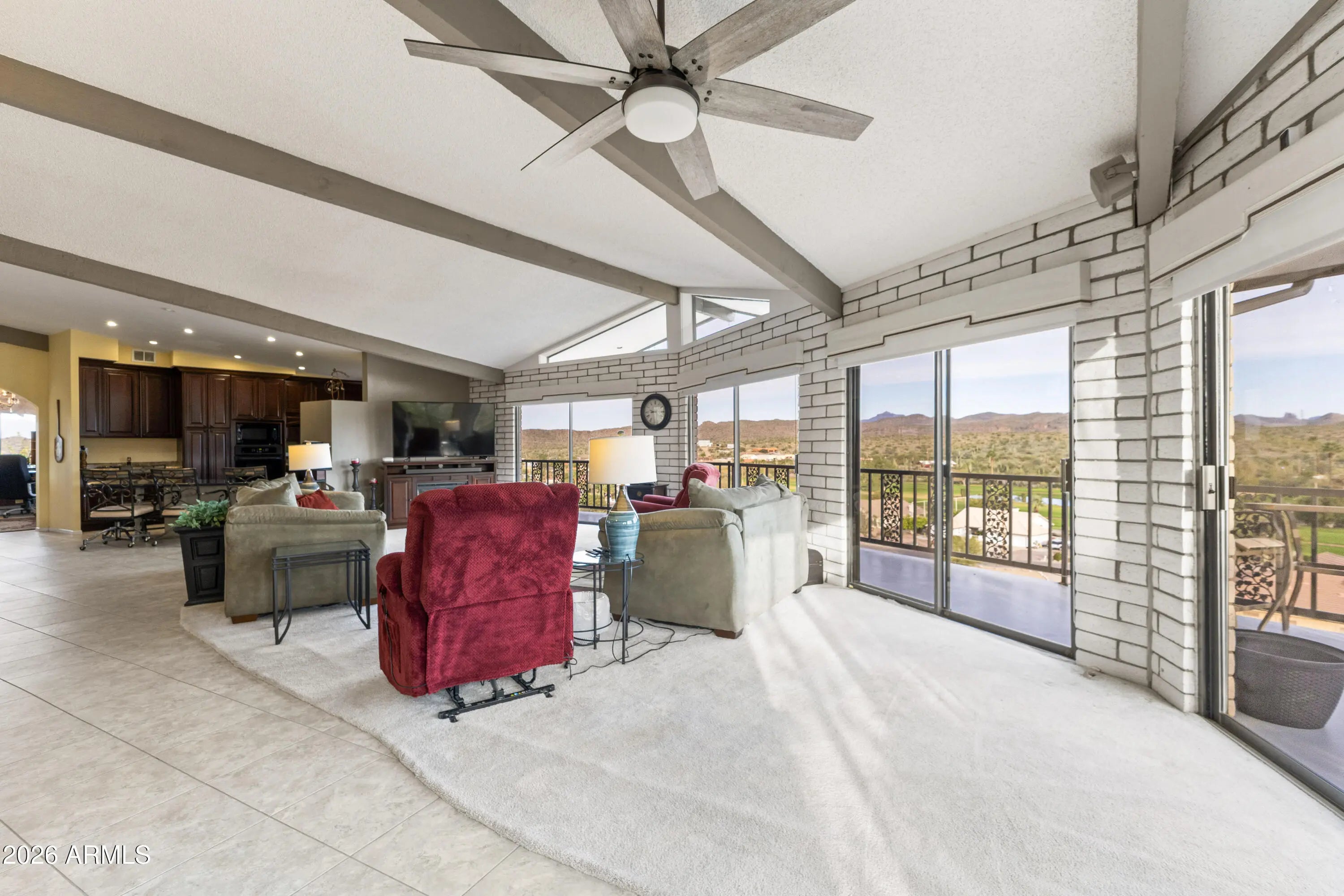Executive rental in Queen Valley offering open-concept living with exceptionally large rooms and a dramatic wall of windows showcasing panoramic golf course and mountain views. The main living level features the primary suite, expansive living room, and a well-appointed kitchen with all appliances, a massive walk-in pantry, and an additional storage/prep room with extensive cabinetry and counter space. Enjoy both formal dining and a casual eat-in kitchen. A private office opens to a sweeping, rounded full-length balcony—ideal for work-from-home living. Lower level is occupied; main level is exclusively for tenant use. Peaceful, resort-style setting perfect for executive or corporate rental.
