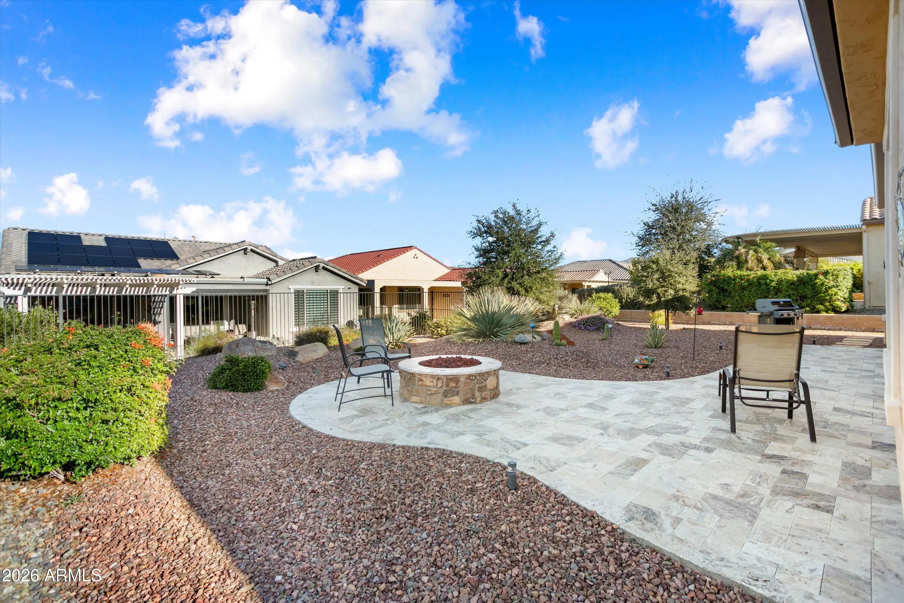 Wonderful opportunity with this popular Pursuit model located on the mountain side of Sun City Festival! This 2-bed, 2-bath with den home is located just a short walk from the Saguaro Recreation Center in the vibrant 55+ community of Sun City Festival. If you're looking for a move-in ready home, the furnishings are available for purchase. The interior is spacious and bright with tray ceilings in the foyer and great room. The kitchen is highlighted with coconut cabinets, light quartz countertops & glass backsplash over the smooth electric cooktop. You'll enjoy the dual basin Blanco granite sink, SS appliances, soft close full overlay doors and drawers, and undercabinet lighting. Luxury vinyl plank flooring covers the main living areas, with tiled bathrooms & laundry and carpeted bedrooms and den. And home automation controls the doors, HVAC, irrigation, and Hunter Douglas window coverings. The backyard is comfortable and private, featuring an extended travertine patio with a firepit. The 2.5-car tandem garage is insulated with an epoxy floor covering, and the 2020 EZGO golf cart is also available for purchase. This could be the luxurious, move-in ready home you've been looking for!