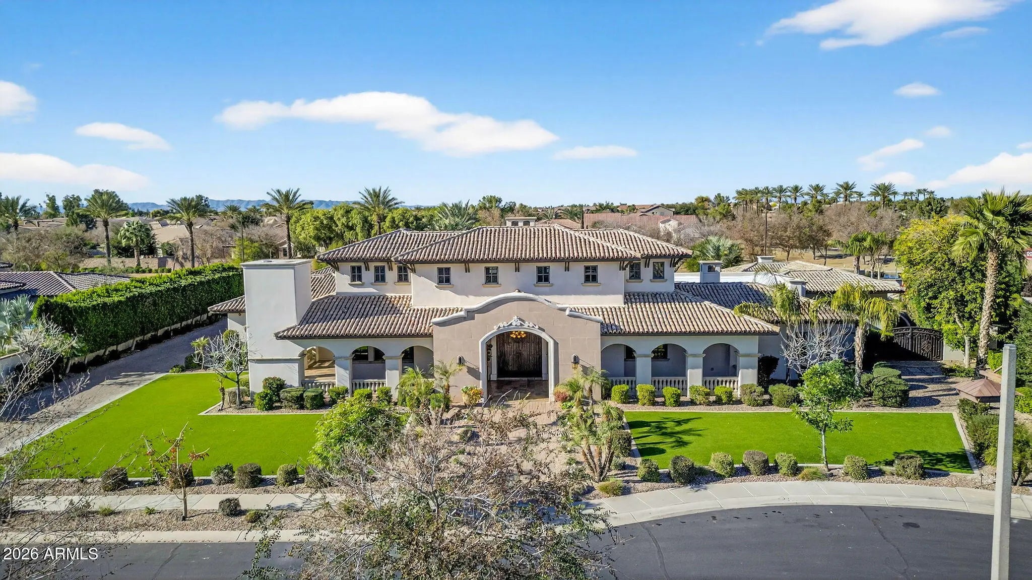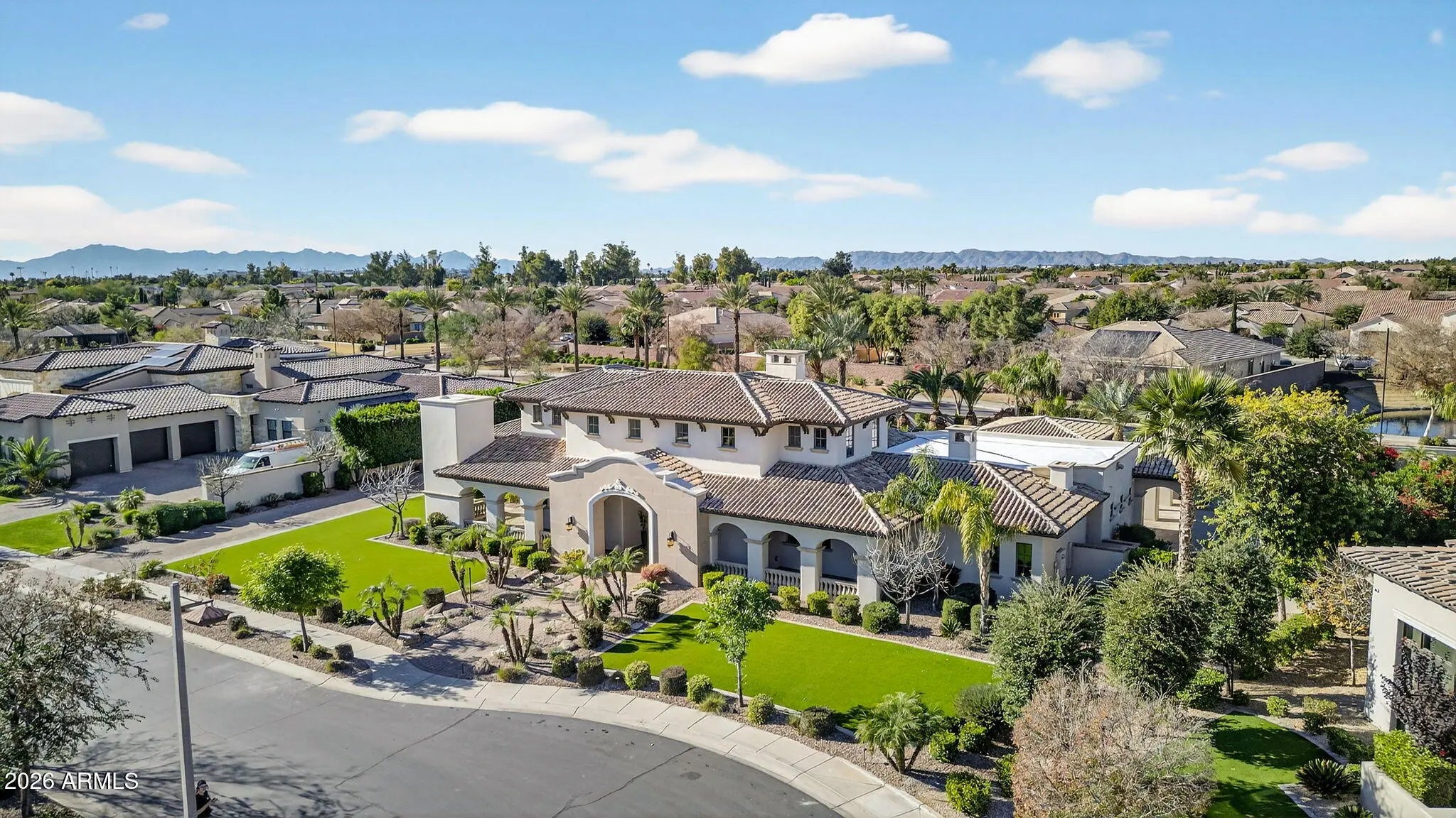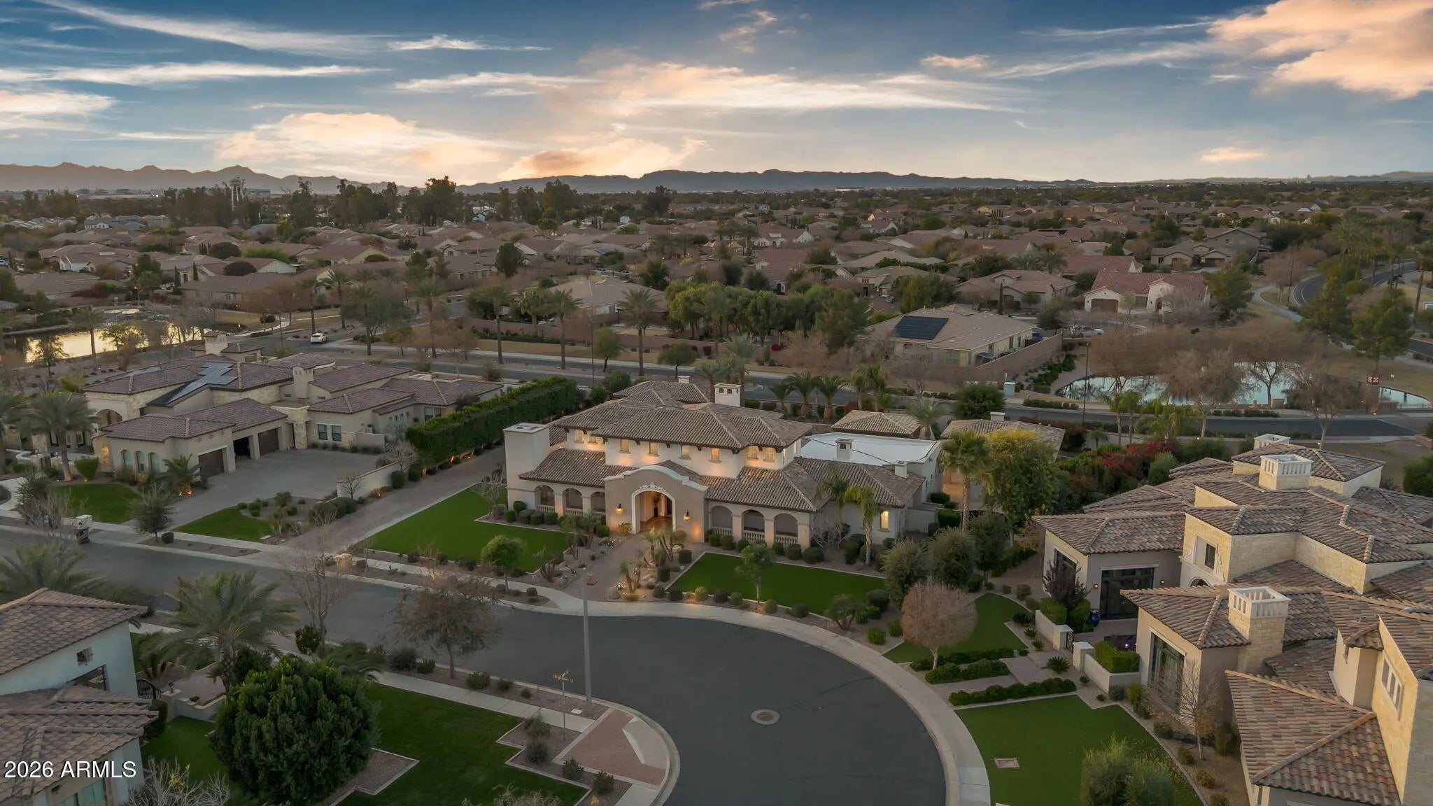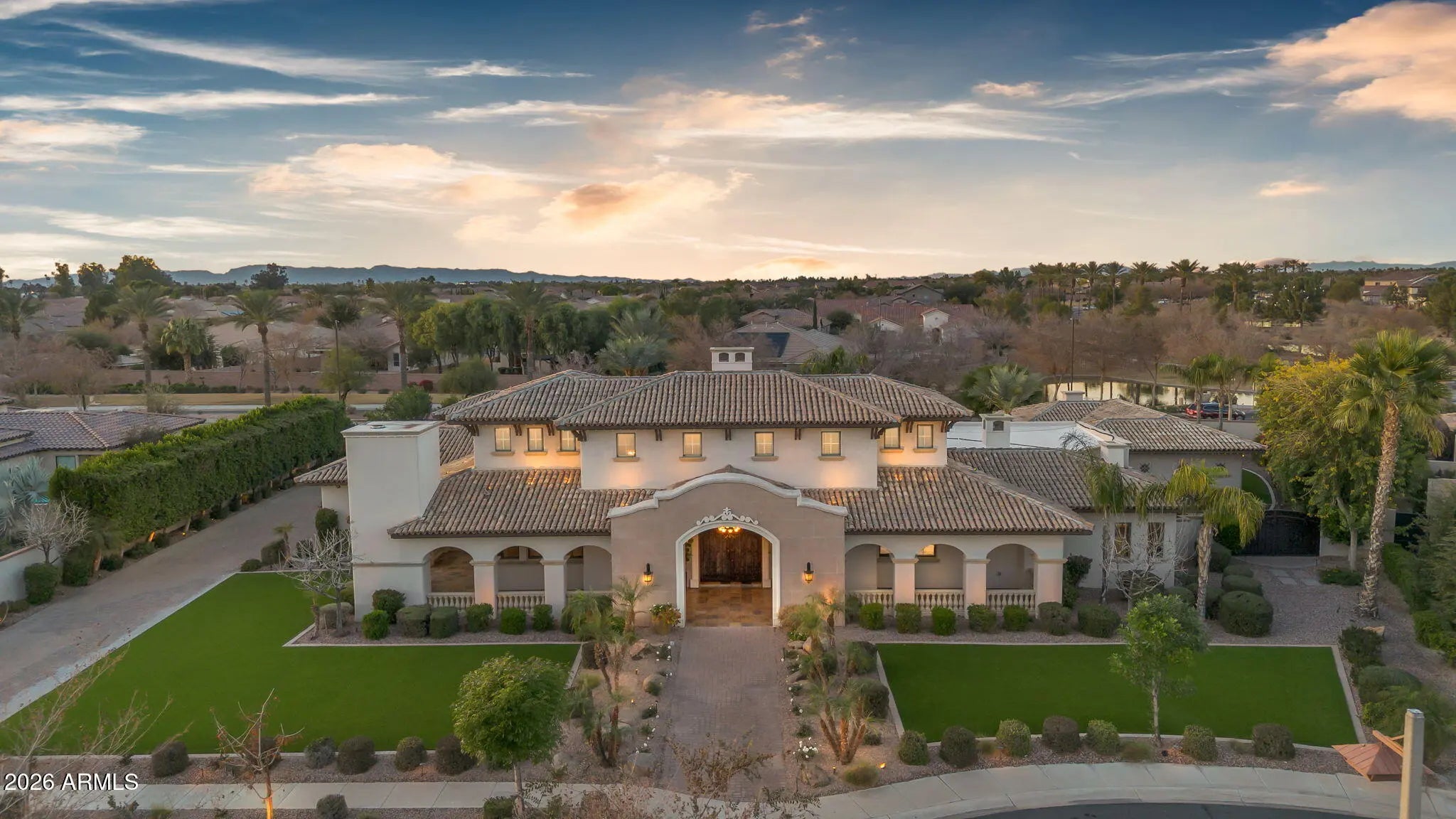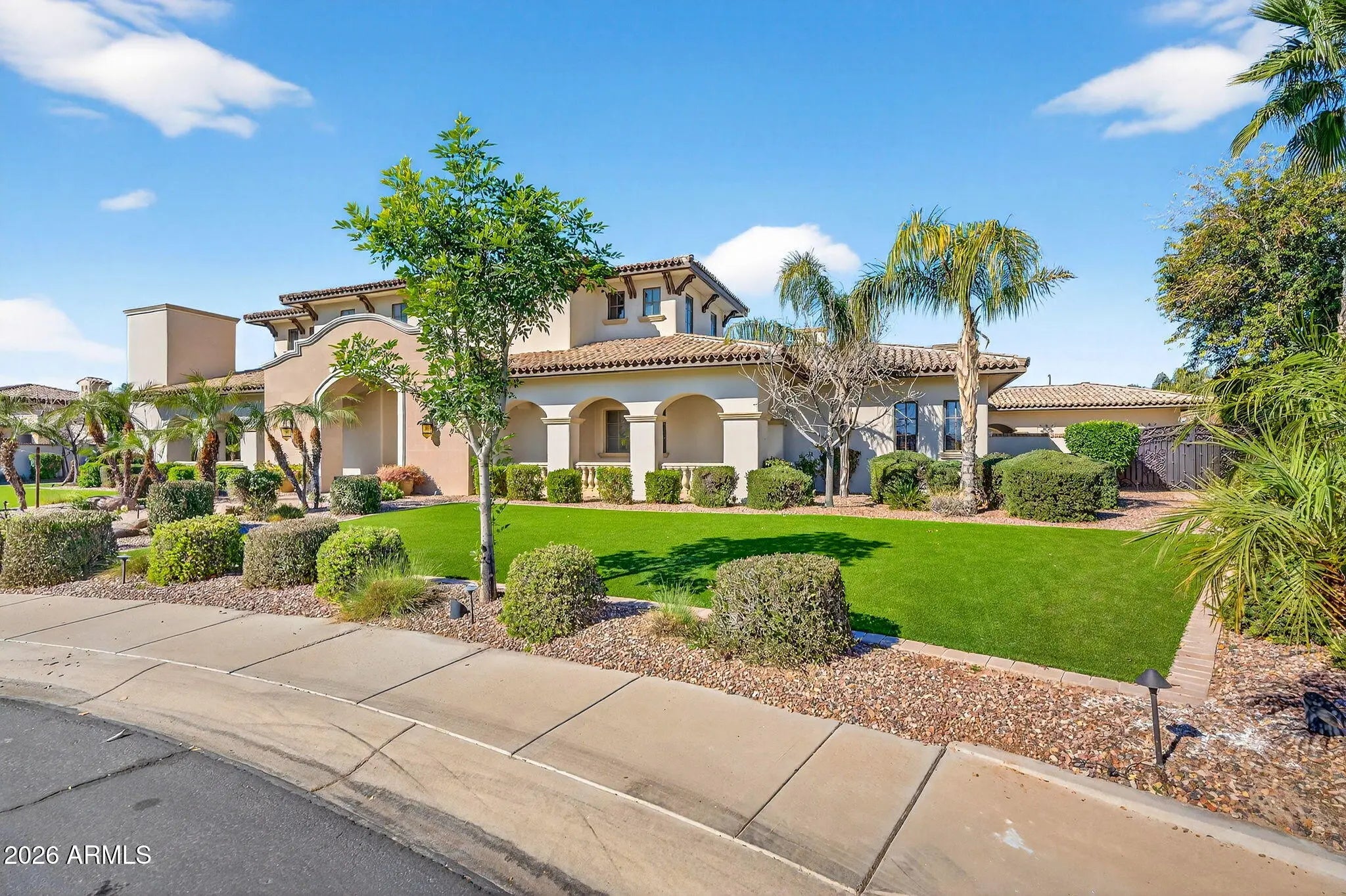 Discover this exceptional luxury residence in the gated Island at Fulton Ranch, one of Chandler's most sought-after lake communities. Situated in the heart of Fulton Ranch, this 6,000sf estate offers 6 bedrooms, 6.5 baths, and dual guest houses ideal for multigenerational living, extended guests, or private work-from-home suites. Thoughtfully designed for elevated living and seamless entertaining, the home features generous gathering spaces, soaring ceilings, and a fluid indoor-outdoor connection with ample outdoor covered square footage. The gourmet chef's kitchen showcases granite slab countertops, upgraded cabinetry, high-end appliances, and multiple ovens, while the formal living room is anchored by a Cantera-style fireplace complemented by additional fireplaces in the primary... ...bath, front courtyard, and rear yard. The primary wing offers a spa-style retreat with his-and-her vanities, marble counters, soaking tub, walk-in shower, and ample closet space with a 400sf addition off the master bedroom ideal for a professional grade studio, executive suite or private media room. Well appointed secondary bedrooms including a full bedroom and ensuite bath downstairs and dual guest houses with private ensuites and walk-in closets enhance flexibility and privacy for family or long-term stays. Outside, the resort-style backyard offers exceptional privacy and year-round enjoyment with a sparkling pool, in-ground spa, built-in BBQ, covered lounge spaces, and a spacious grassy lawn all set on an approximately 0.65-acre lot. Located within minutes of top-rated schools, upscale shopping, dining, and major East Valley employment and entertainment corridors, Fulton Ranch delivers a serene lakeside lifestyle without compromising convenience. Don't miss this rare opportunity to own in the exclusive gated enclave of Chandler's premier Fulton Ranch neighborhood!