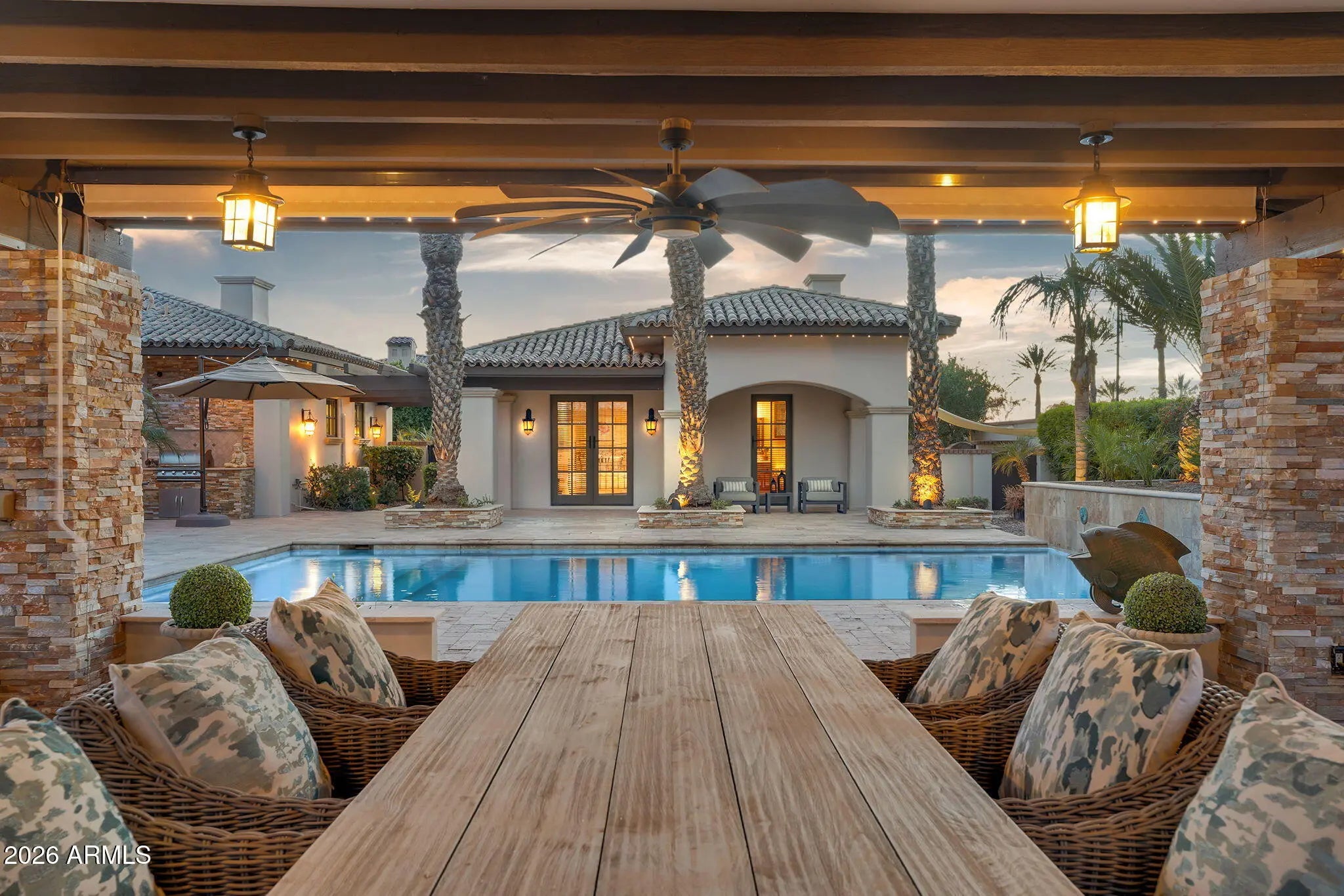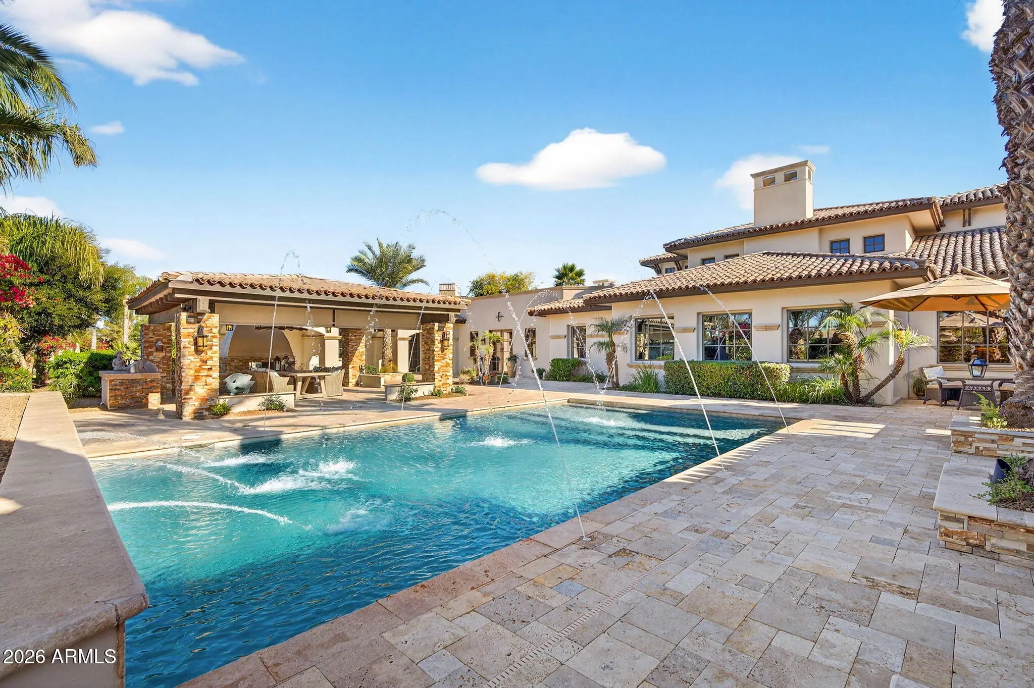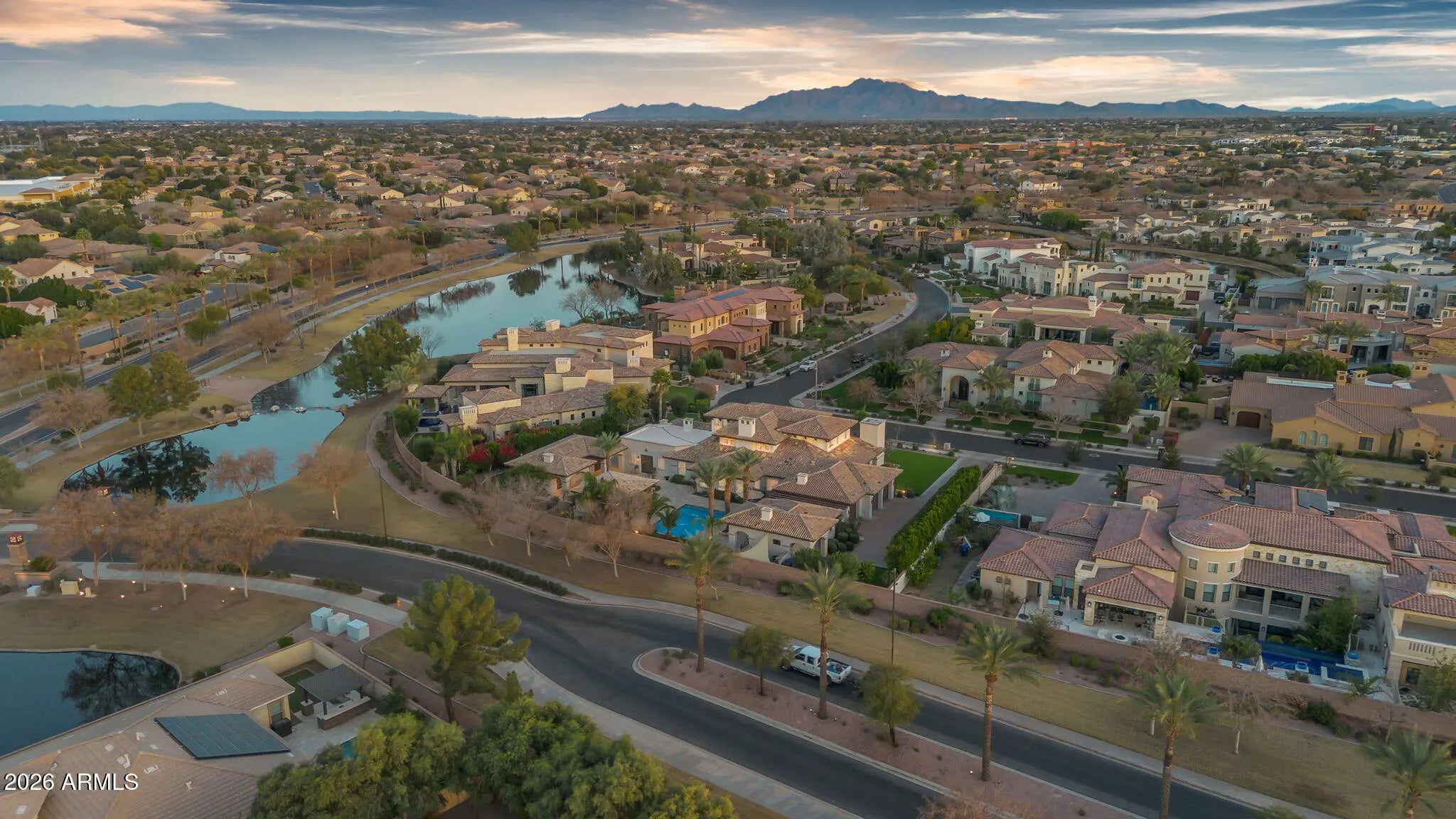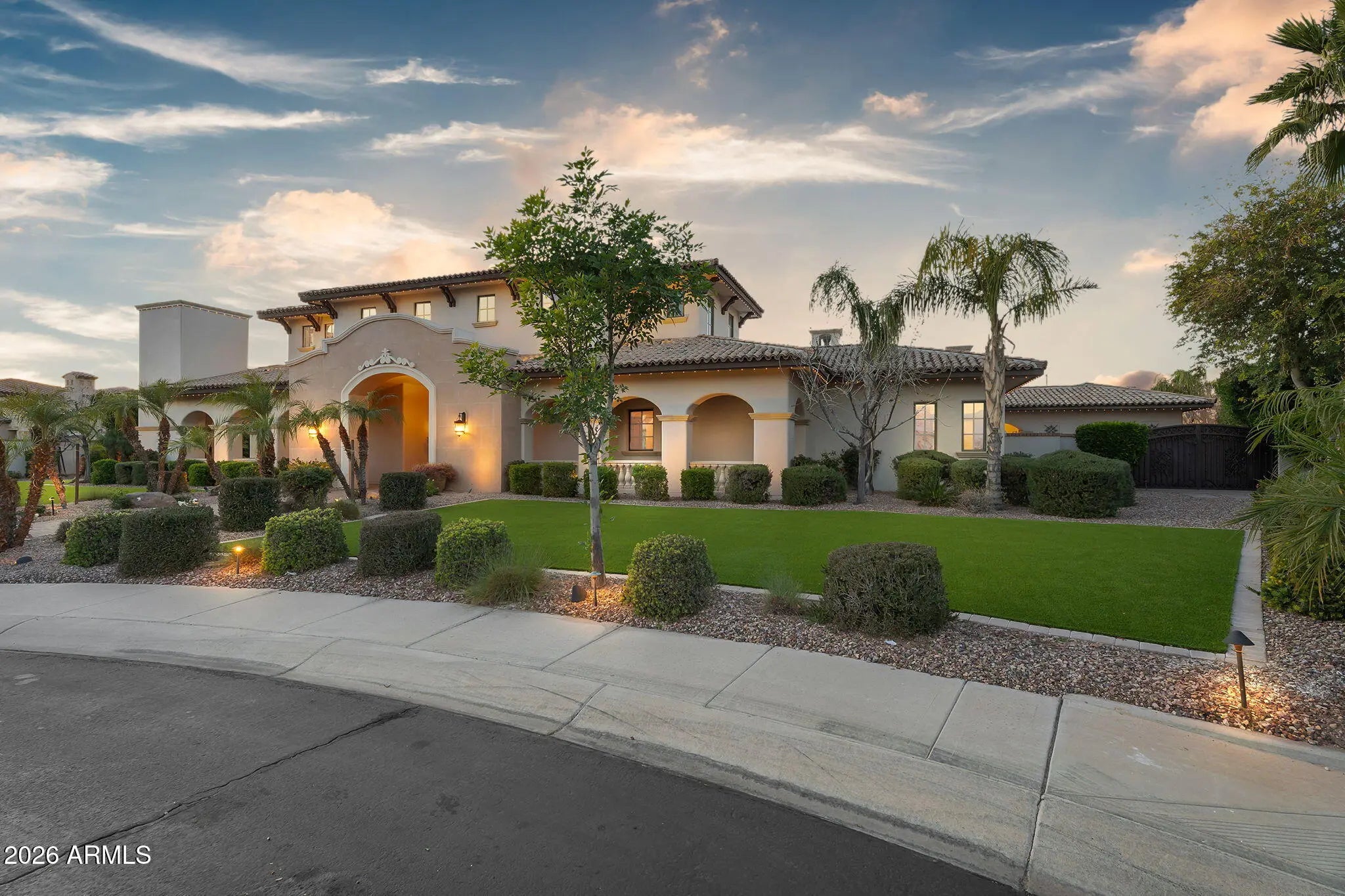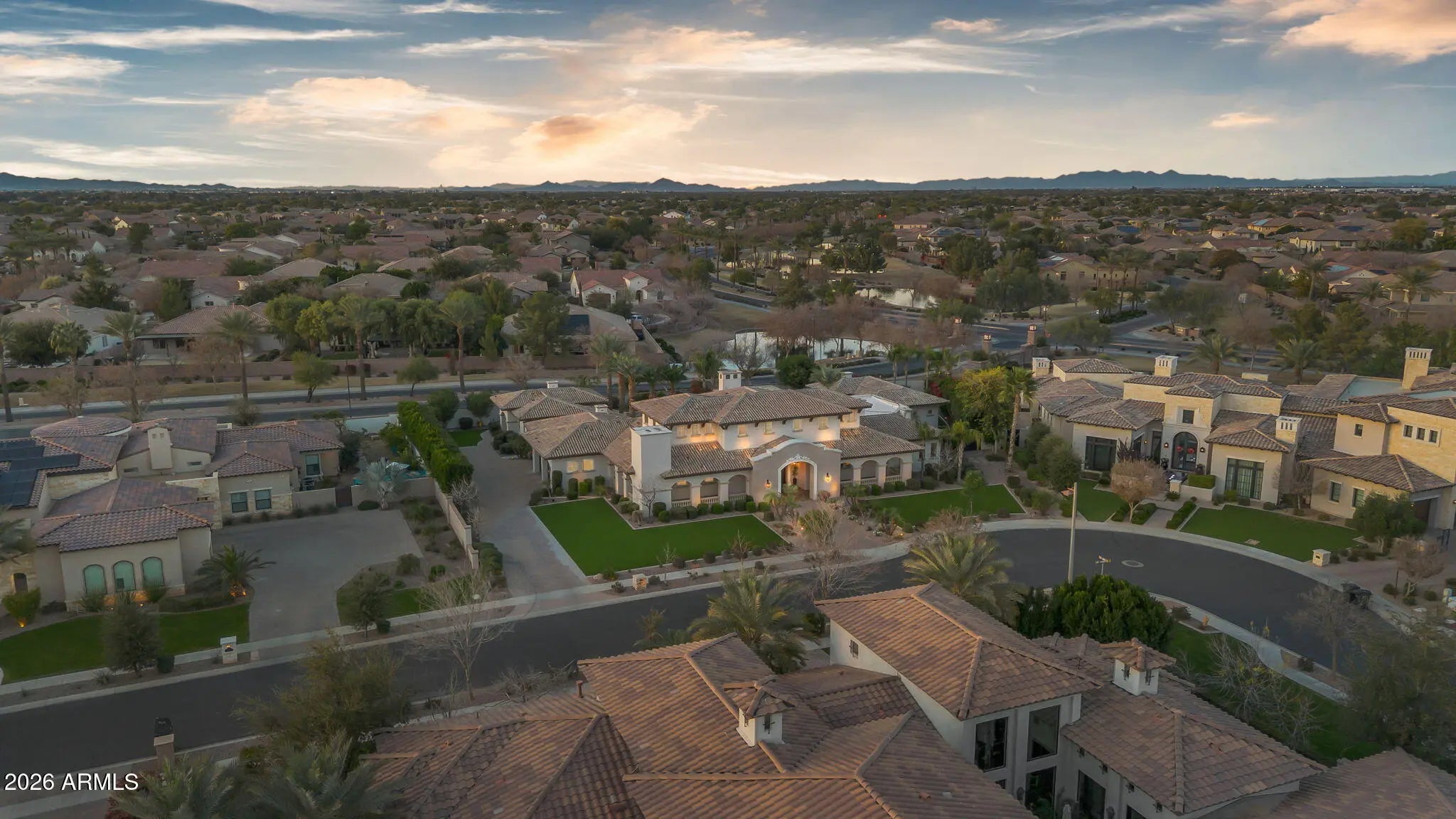 Discover this exceptional luxury residence in the gated Island at Fulton Ranch, one of Chandler's most sought-after lake communities. Situated in the heart of Fulton Ranch, this 6,000sf estate offers 6 bedrooms, 6.5 baths, and dual guest houses ideal for multigenerational living, extended guests, or private work-from-home suites. Thoughtfully designed for elevated living and seamless entertaining, the home features generous gathering spaces, soaring ceilings, and a fluid indoor-outdoor connection with ample outdoor covered square footage. The gourmet chef's kitchen showcases granite slab countertops, upgraded cabinetry, high-end appliances, and multiple ovens, while the formal living room is anchored by a Cantera-style fireplace complemented by additional fireplaces in the primary... ...bath, front courtyard, and rear yard. The primary wing offers a spa-style retreat with his-and-her vanities, marble counters, soaking tub, walk-in shower, and ample closet space with a 400sf addition off the master bedroom ideal for a professional grade studio, executive suite or private media room. Well appointed secondary bedrooms including a full bedroom and ensuite bath downstairs and dual guest houses with private ensuites and walk-in closets enhance flexibility and privacy for family or long-term stays. Outside, the resort-style backyard offers exceptional privacy and year-round enjoyment with a sparkling pool, in-ground spa, built-in BBQ, covered lounge spaces, and a spacious grassy lawn all set on an approximately 0.65-acre lot. Located within minutes of top-rated schools, upscale shopping, dining, and major East Valley employment and entertainment corridors, Fulton Ranch delivers a serene lakeside lifestyle without compromising convenience. Don't miss this rare opportunity to own in the exclusive gated enclave of Chandler's premier Fulton Ranch neighborhood!