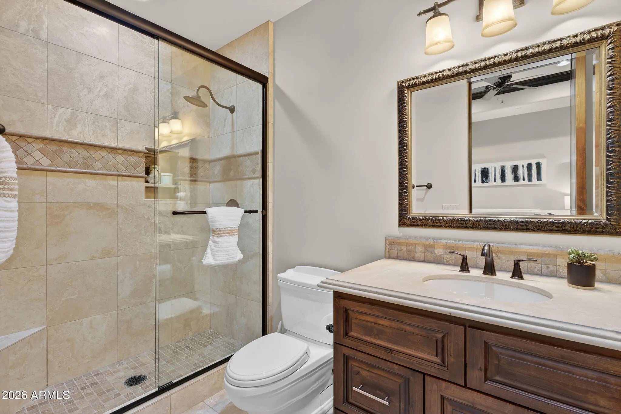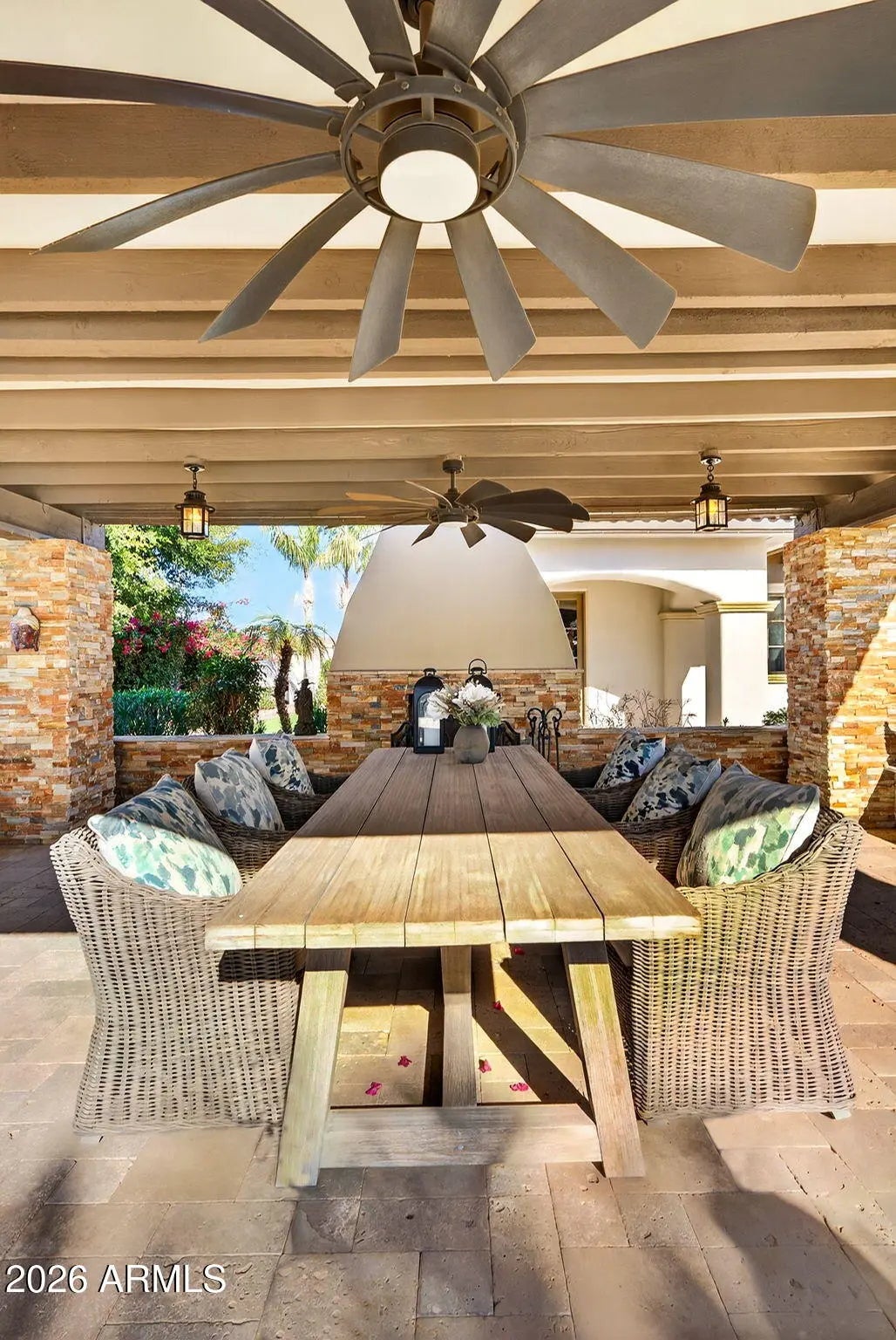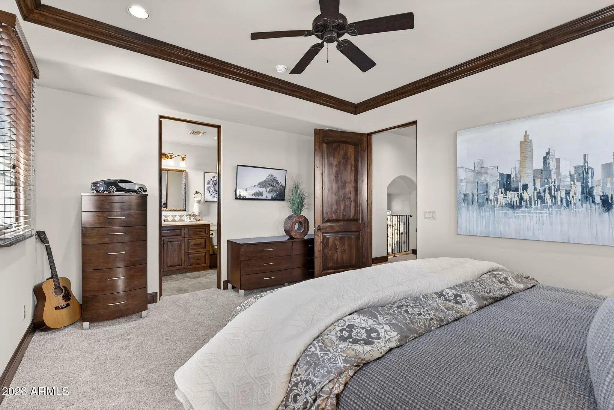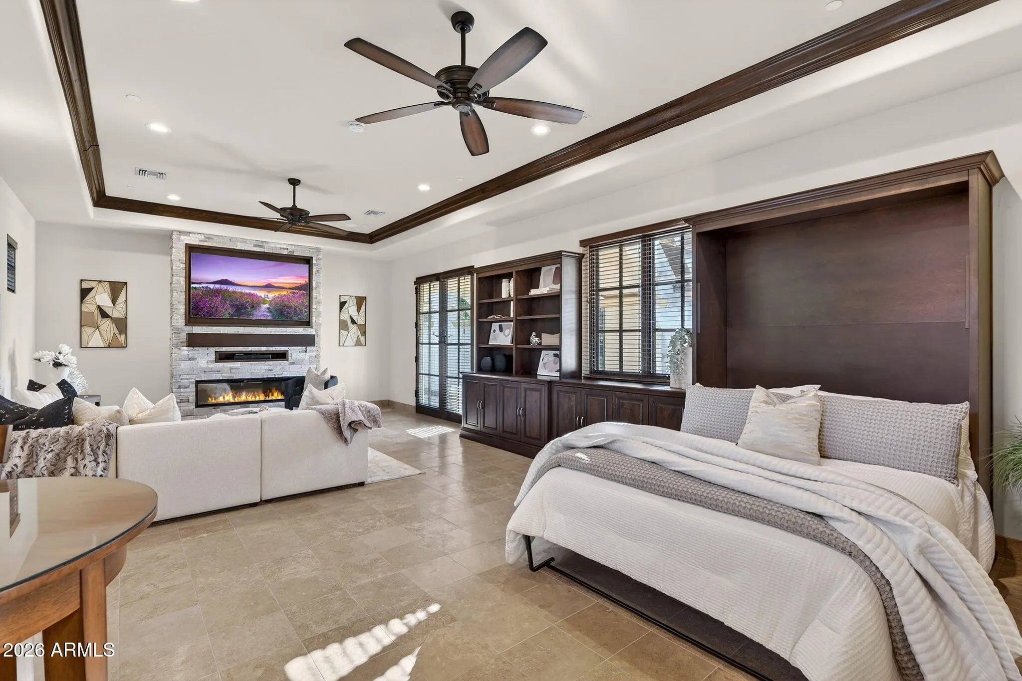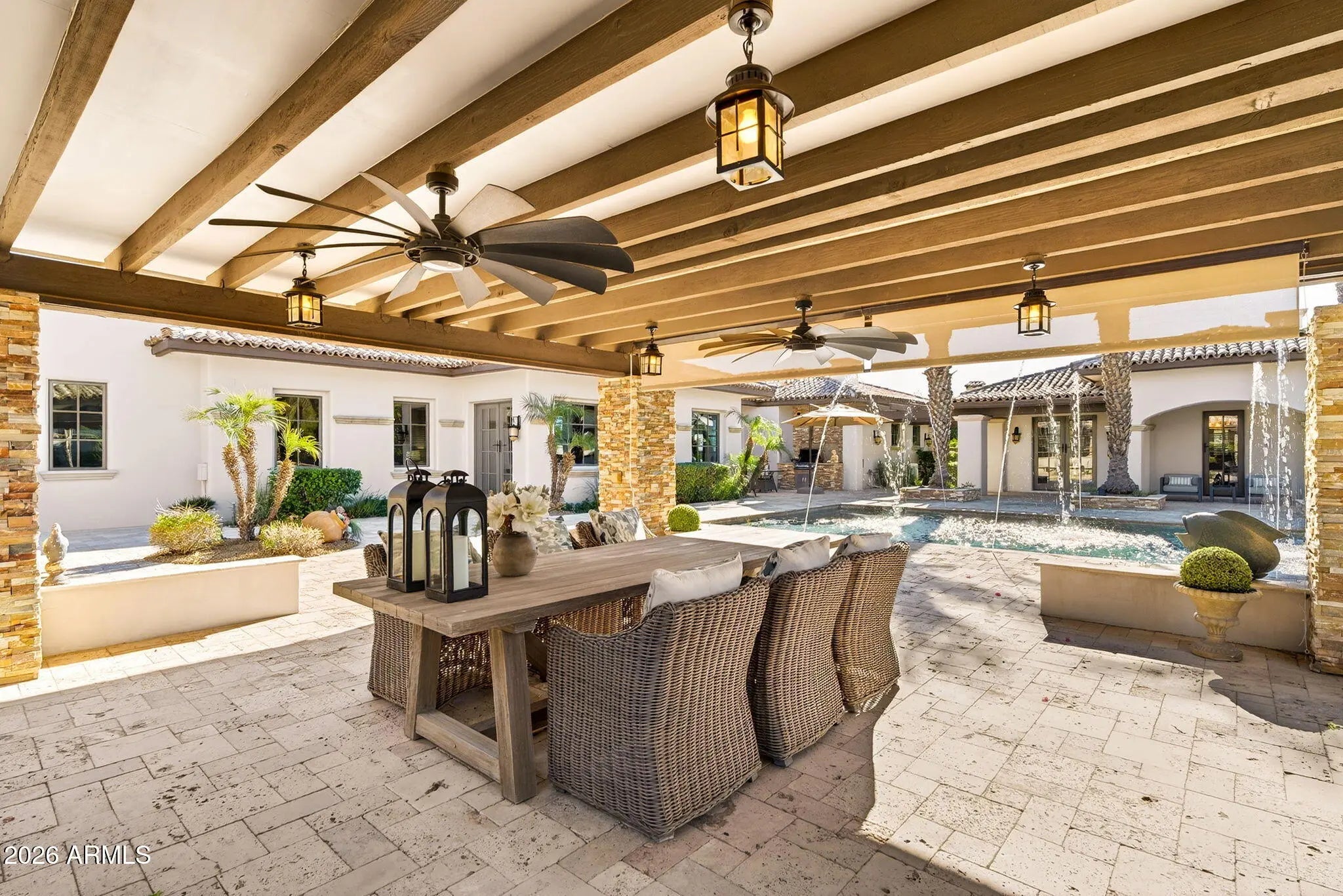 Discover this exceptional luxury residence in the gated Island at Fulton Ranch, one of Chandler's most sought-after lake communities. Situated in the heart of Fulton Ranch, this 6,000sf estate offers 6 bedrooms, 6.5 baths, and dual guest houses ideal for multigenerational living, extended guests, or private work-from-home suites. Thoughtfully designed for elevated living and seamless entertaining, the home features generous gathering spaces, soaring ceilings, and a fluid indoor-outdoor connection with ample outdoor covered square footage. The gourmet chef's kitchen showcases granite slab countertops, upgraded cabinetry, high-end appliances, and multiple ovens, while the formal living room is anchored by a Cantera-style fireplace complemented by additional fireplaces in the primary... ...bath, front courtyard, and rear yard. The primary wing offers a spa-style retreat with his-and-her vanities, marble counters, soaking tub, walk-in shower, and ample closet space with a 400sf addition off the master bedroom ideal for a professional grade studio, executive suite or private media room. Well appointed secondary bedrooms including a full bedroom and ensuite bath downstairs and dual guest houses with private ensuites and walk-in closets enhance flexibility and privacy for family or long-term stays. Outside, the resort-style backyard offers exceptional privacy and year-round enjoyment with a sparkling pool, in-ground spa, built-in BBQ, covered lounge spaces, and a spacious grassy lawn all set on an approximately 0.65-acre lot. Located within minutes of top-rated schools, upscale shopping, dining, and major East Valley employment and entertainment corridors, Fulton Ranch delivers a serene lakeside lifestyle without compromising convenience. Don't miss this rare opportunity to own in the exclusive gated enclave of Chandler's premier Fulton Ranch neighborhood!
