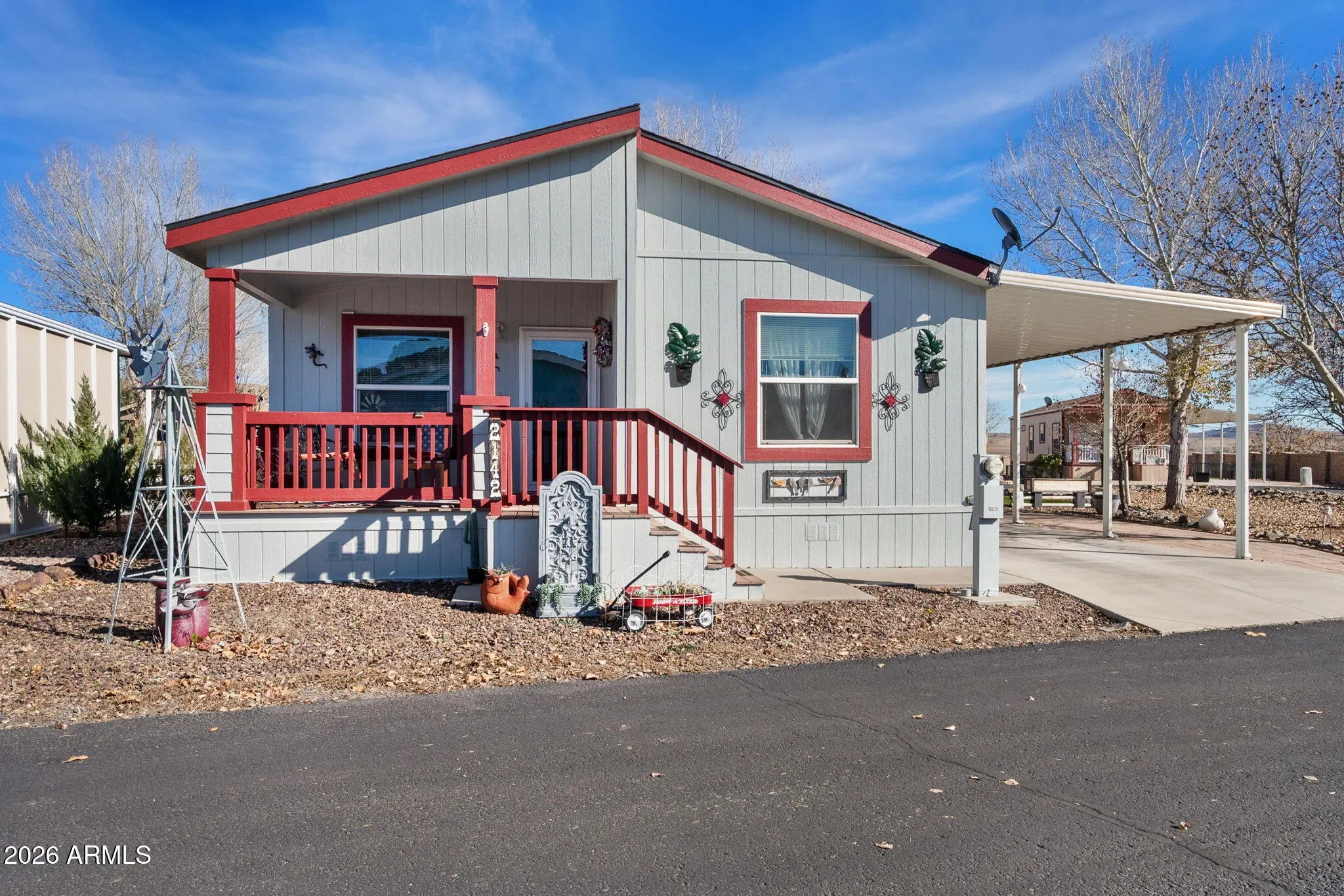 Well-maintained 2-bed, 2-bath double-wide Cavco manufactured home on a large corner lot in a quiet 55+ community, offering privacy and scenic views. Located in the newer section of the desirable Orchard Ranch community in Prescott Valley (Dewey mailing address). Features a spacious open-concept living area with a cozy wood-burning fireplace and blower. Updated kitchen area includes canned lighting, island, granite countertops, backsplash, bay window and white appliances. Ceiling fans and double-pane windows throughout. Primary suite offers a walk-in closet, bathroom with step-in shower and highboy commode. Guest bedroom has its own bath with tub/shower combo. An additional 120 sqft enclosed rear porch (not included in square footage) is ideal for a den, office, or craft room. Dog door opens to a fenced yard with artificial turf. Private landscaped side yard with patio plus an attached insulated shed with plenty shelving and electricity.