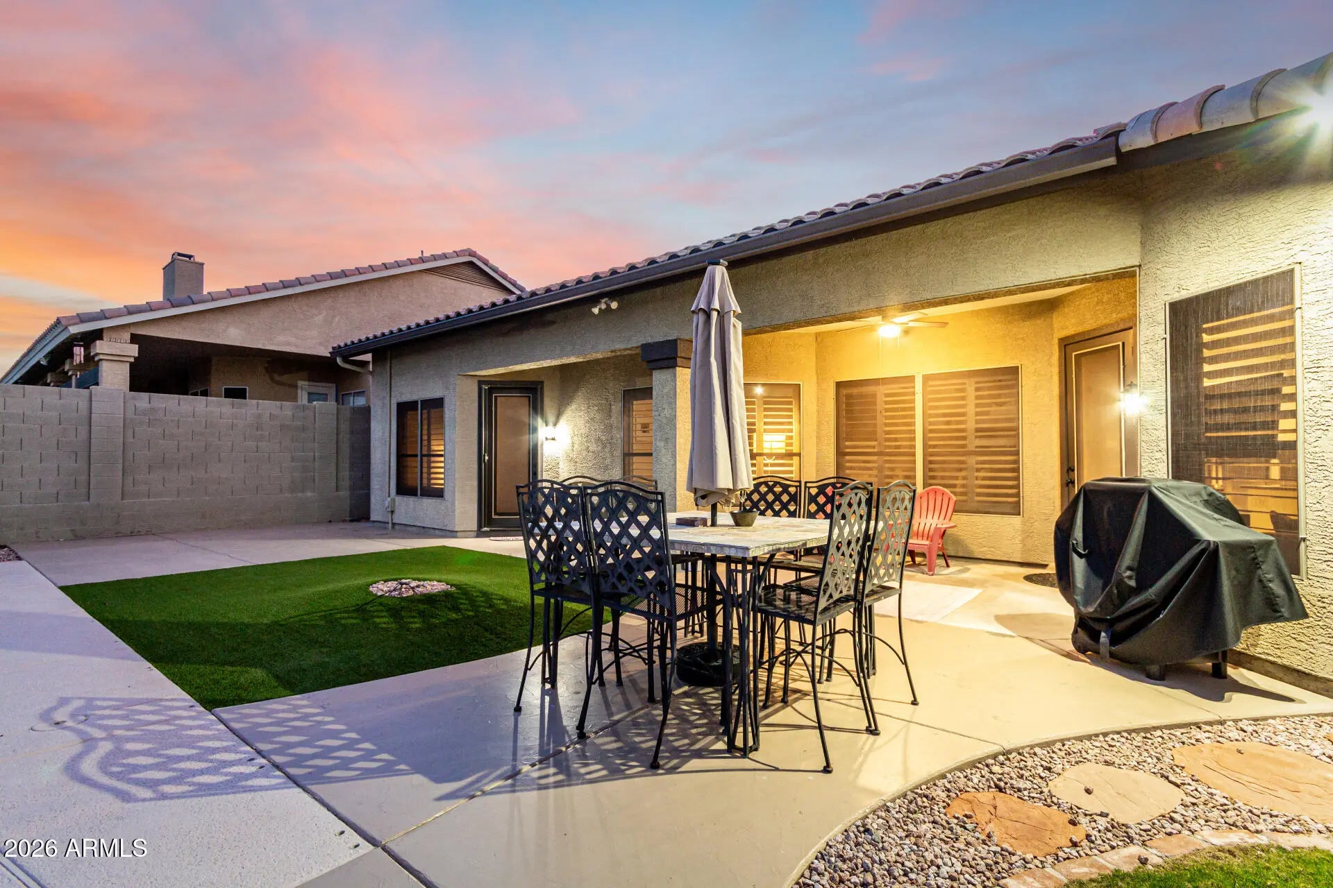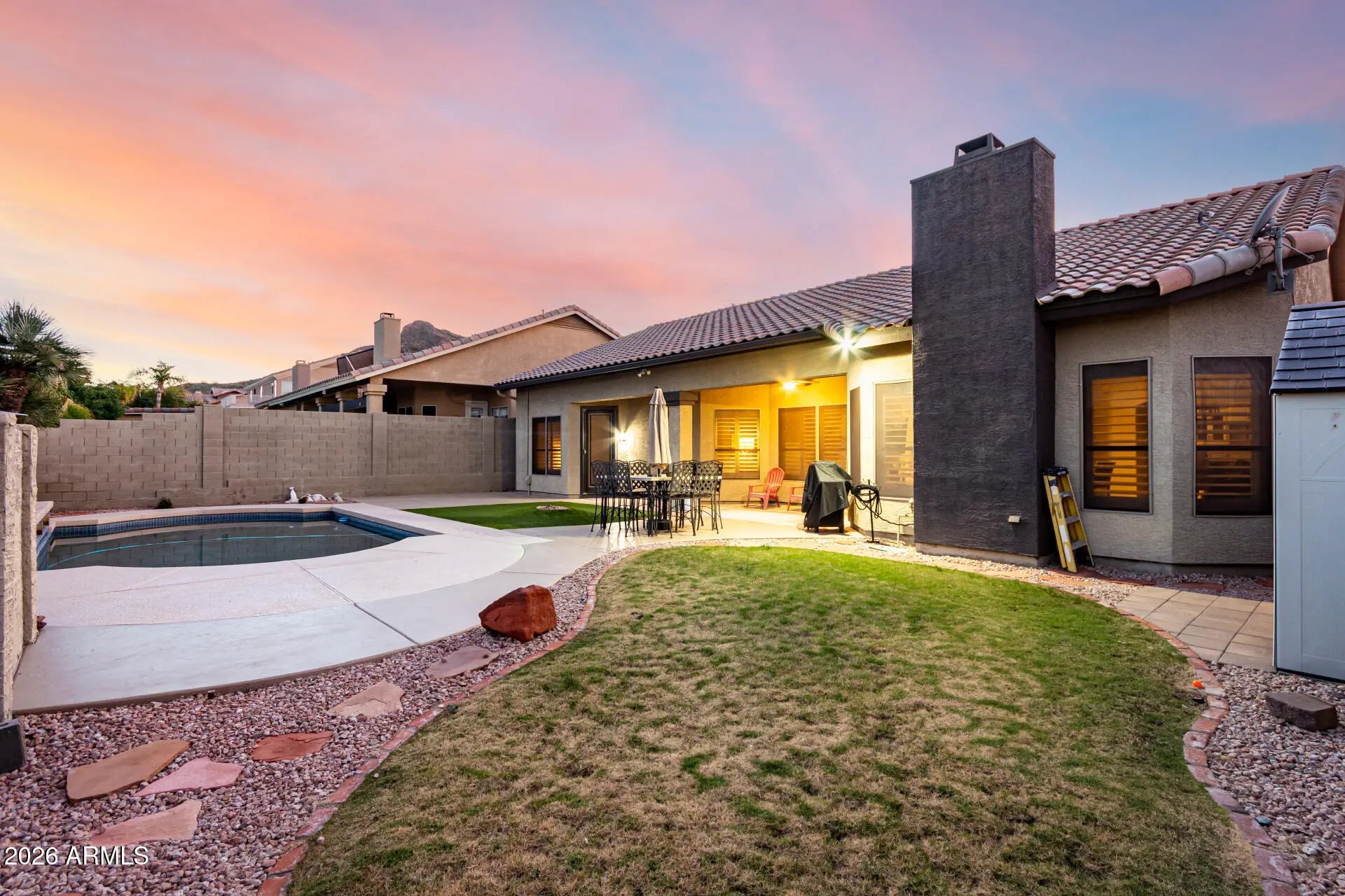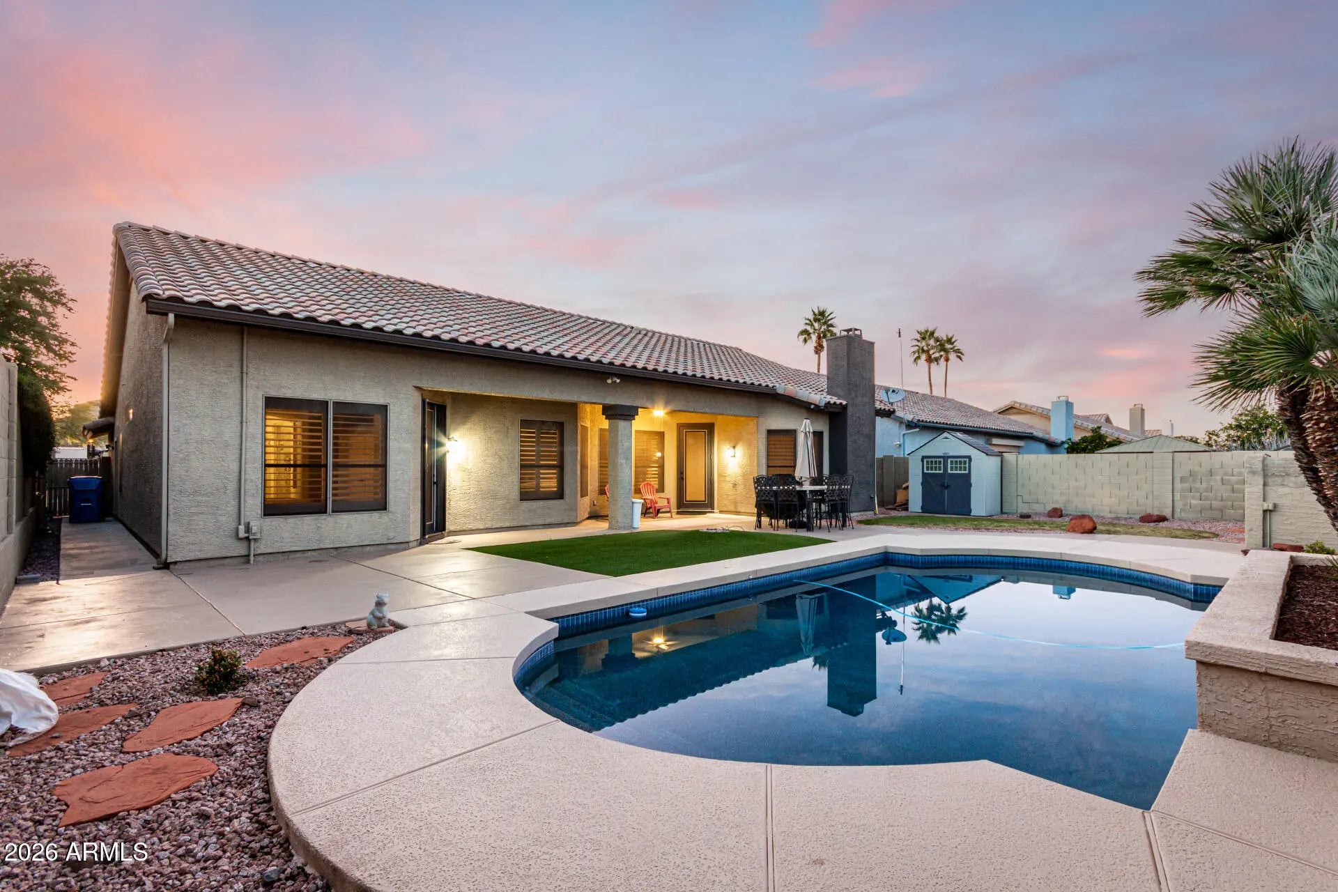 Welcome home to this beautifully designed residence with a 3-car garage and low-maintenance curb appeal. Inside, enjoy a flowing layout with tile flooring, formal living and dining areas, and a versatile den. The light-filled family room features a cozy fireplace and opens to the eat-in kitchen with granite countertops, stainless steel appliances, tile backsplash, ample cabinetry, and a large island with breakfast bar. The private primary suite offers backyard access and a spa-like ensuite with dual vanities, soaking tub, walk-in shower, and walk-in closet. Step outside to a backyard oasis with covered patio, multiple seating areas, and a sparkling pool—perfect for entertaining and everyday Arizona living.