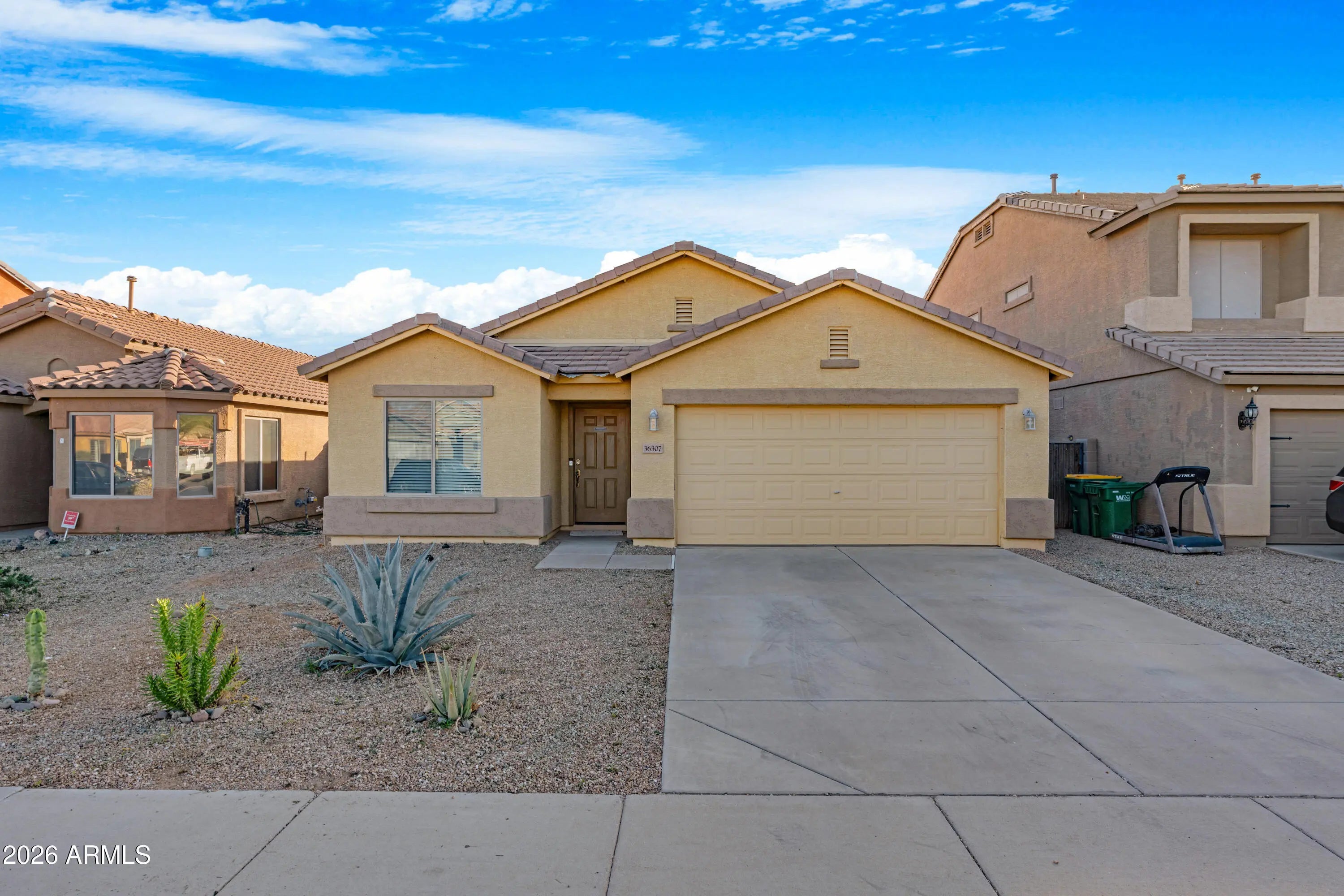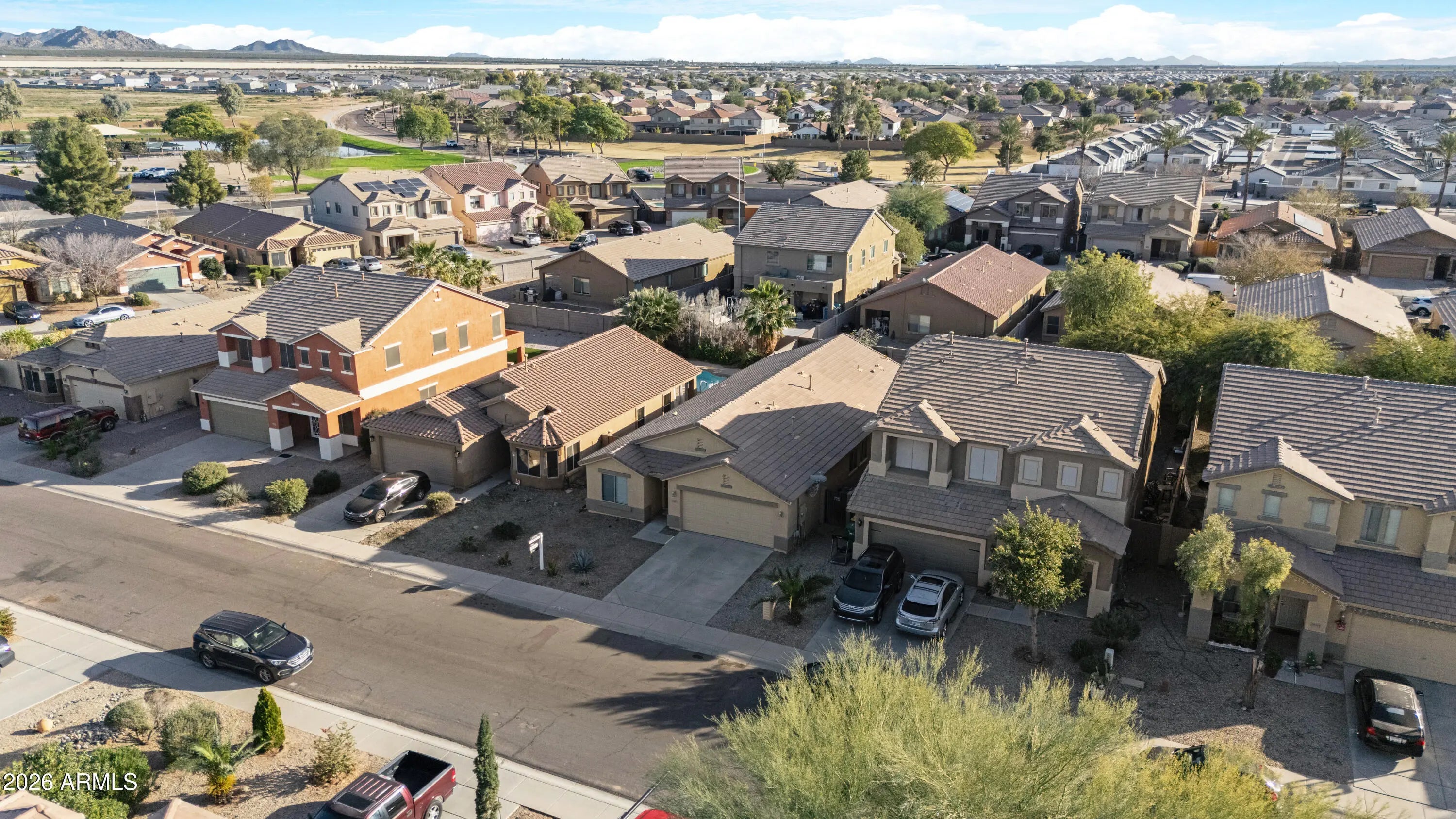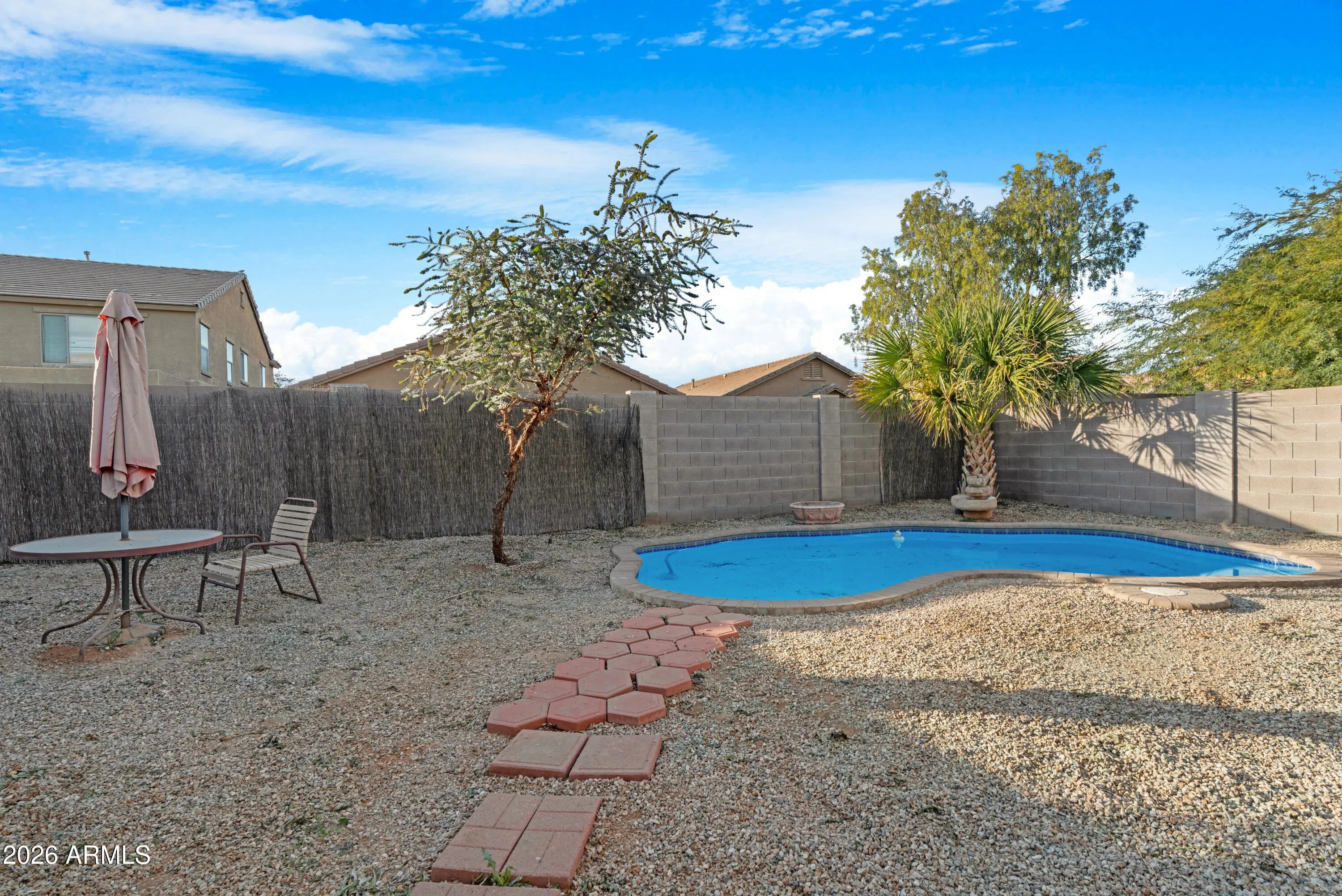 Single-level 4BR • 1,914 sf • Private Pool • No Carpet • 2024 HVAC (10-yr transferable warranty) • 0.17 mi to Tortosa Park + Pond • North/South Exposure • 3.75% Assumable Loan! $5k buyer concession offered! Open and airy layout features vaulted ceilings, large-format dark tile in main living areas, kitchen, and bathrooms, and laminate plank flooring in all bedrooms. The kitchen offers a center island with pendant lighting, cherry-tone cabinetry, soft-close drawers, granite counters, stainless appliances, plus an oversized walk-in pantry. Included front-load washer and dryer sit on added pedestal drawers. The backyard delivers an Arizona lifestyle with a covered patio, storage shed, and private pool. Few active homes combine single-level 4BR living with a private pool at this price point.