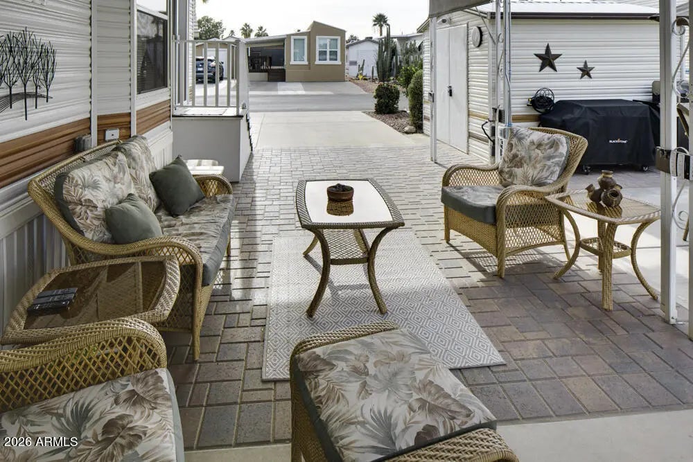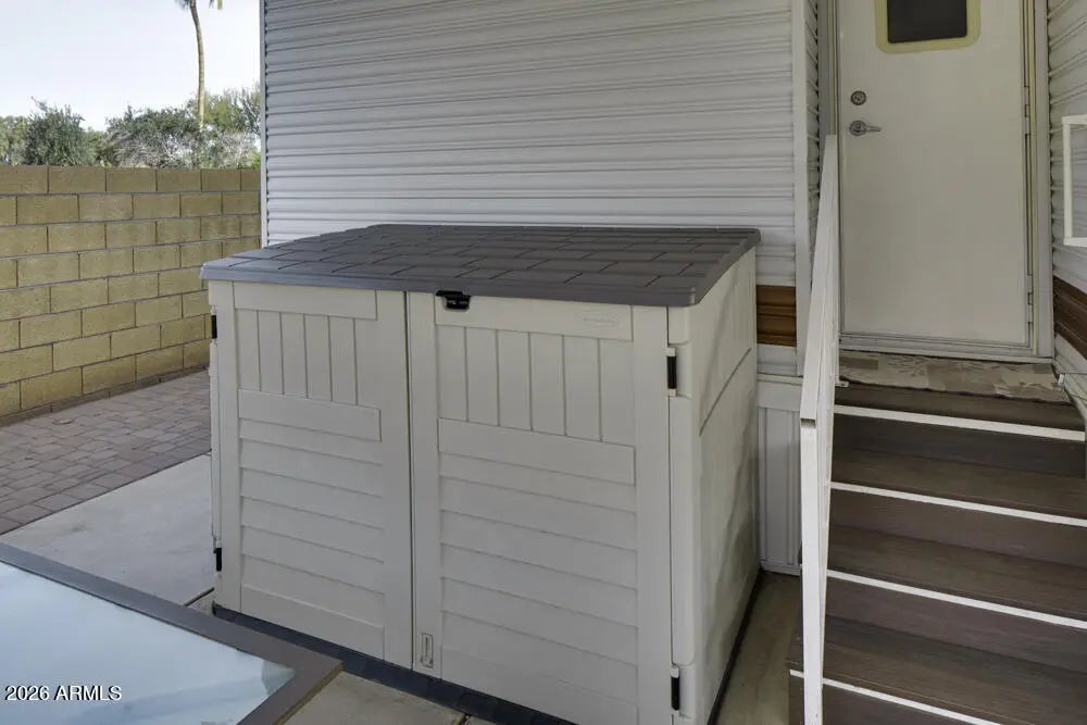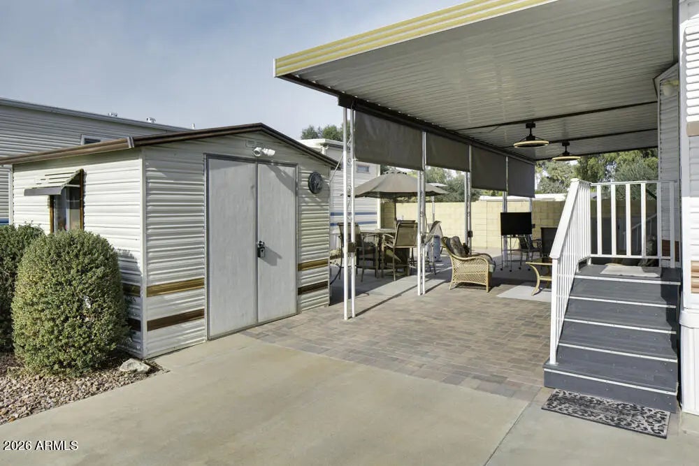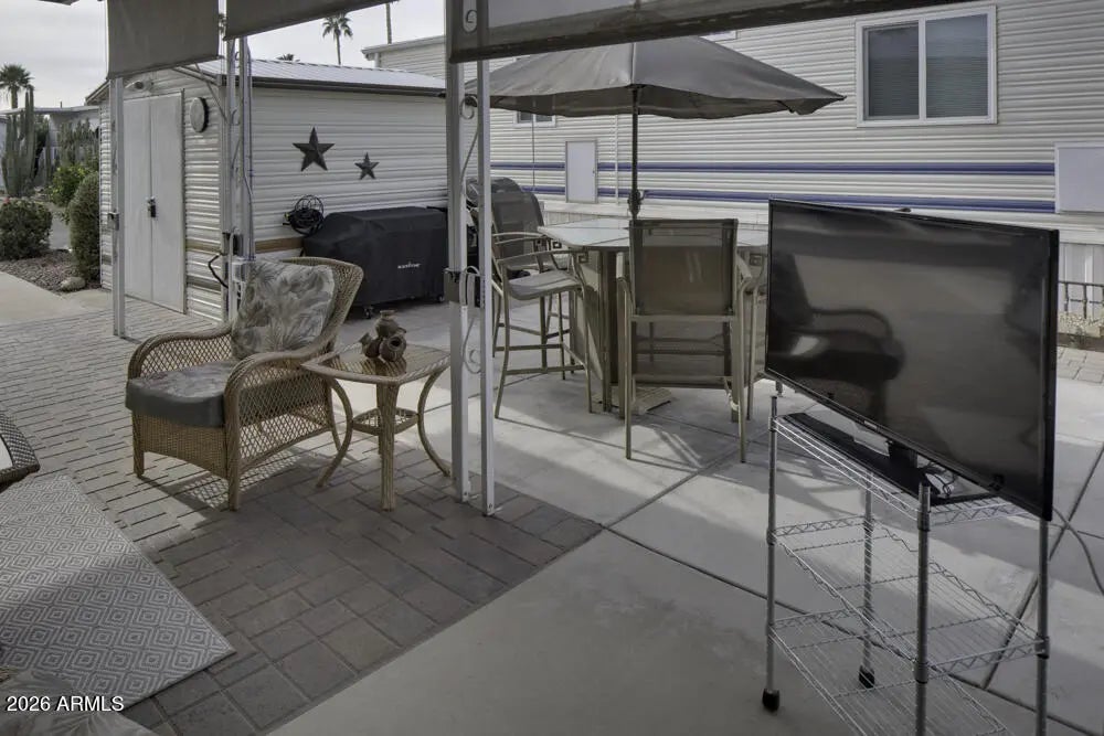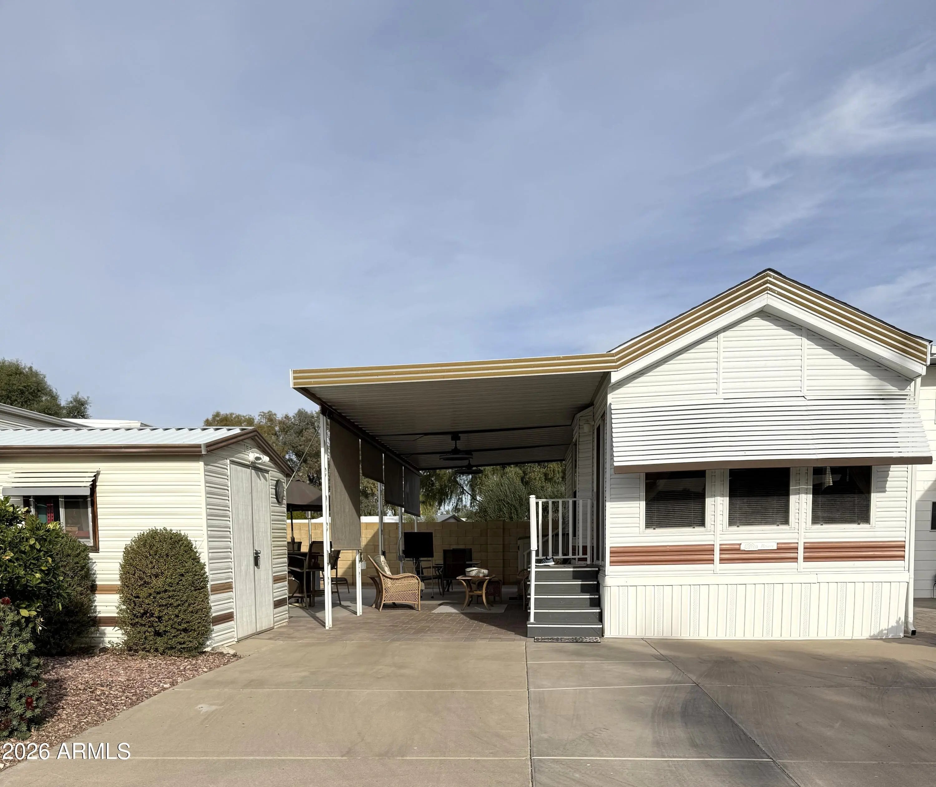 Extremely well cared for Park Model that looks brand new inside and has a fresh and open feeling when you enter the home. Beautiful laminate flooring throughout, sleek cupboards and a functional kitchen. If you live outdoors in Happy Trails - and we all do - then this is the place for you. Spacious room for entertaining with seating for many guests. Outdoor barbeque for the chef to grill those steaks. A cozy seating area for all to sit and share past memories. Owner has installed 4 sun shades with remote controls for privacy or blocking the sun. And you must see the owners creation for the washer and dryer. Just amazing. All plants on irrigation system so no need to worry about watering . Golf cart provided to take you to all the many events.