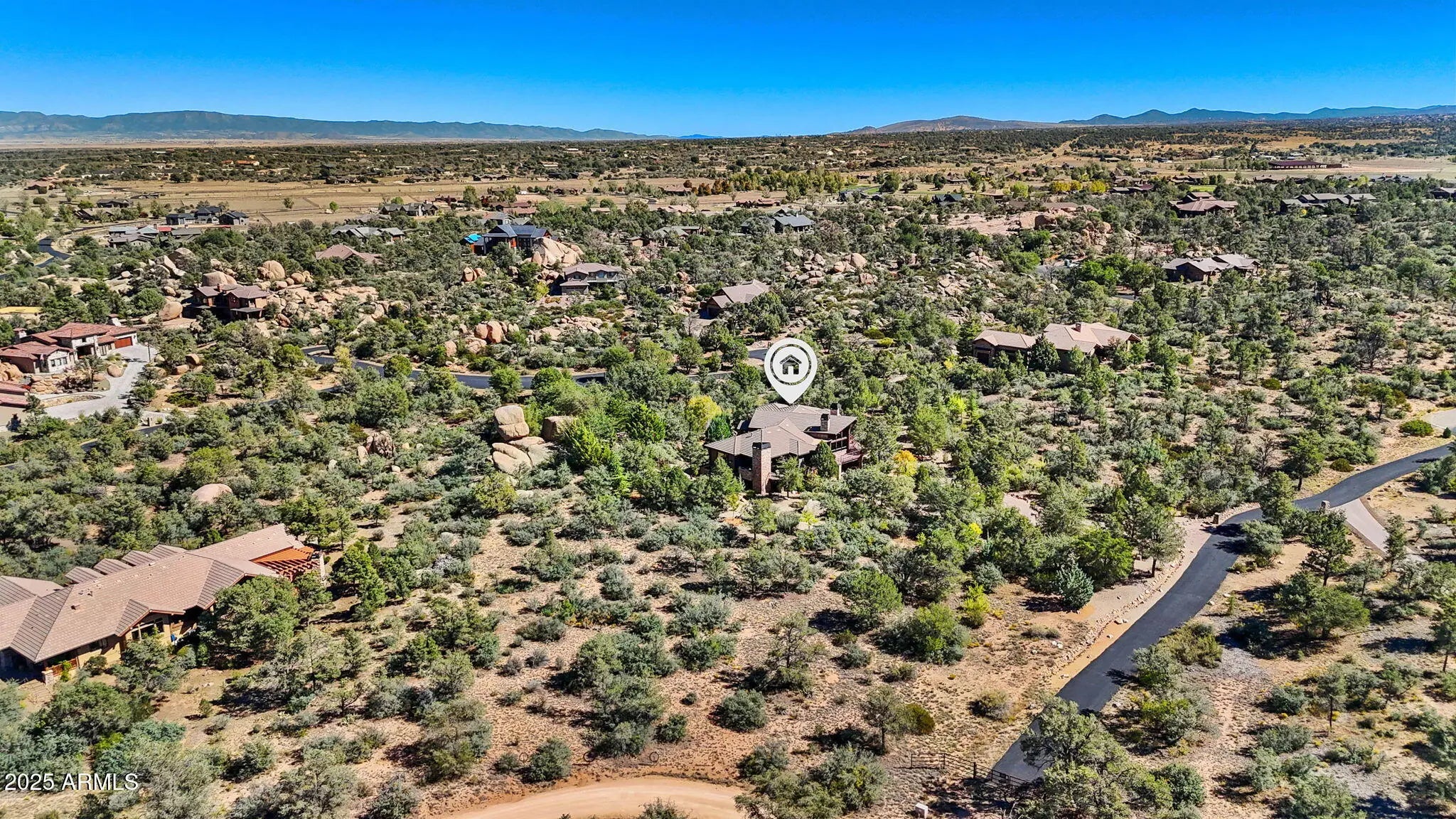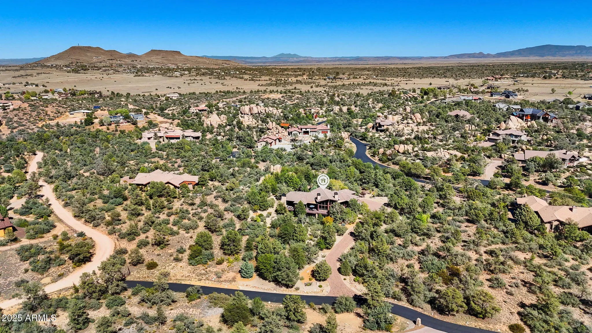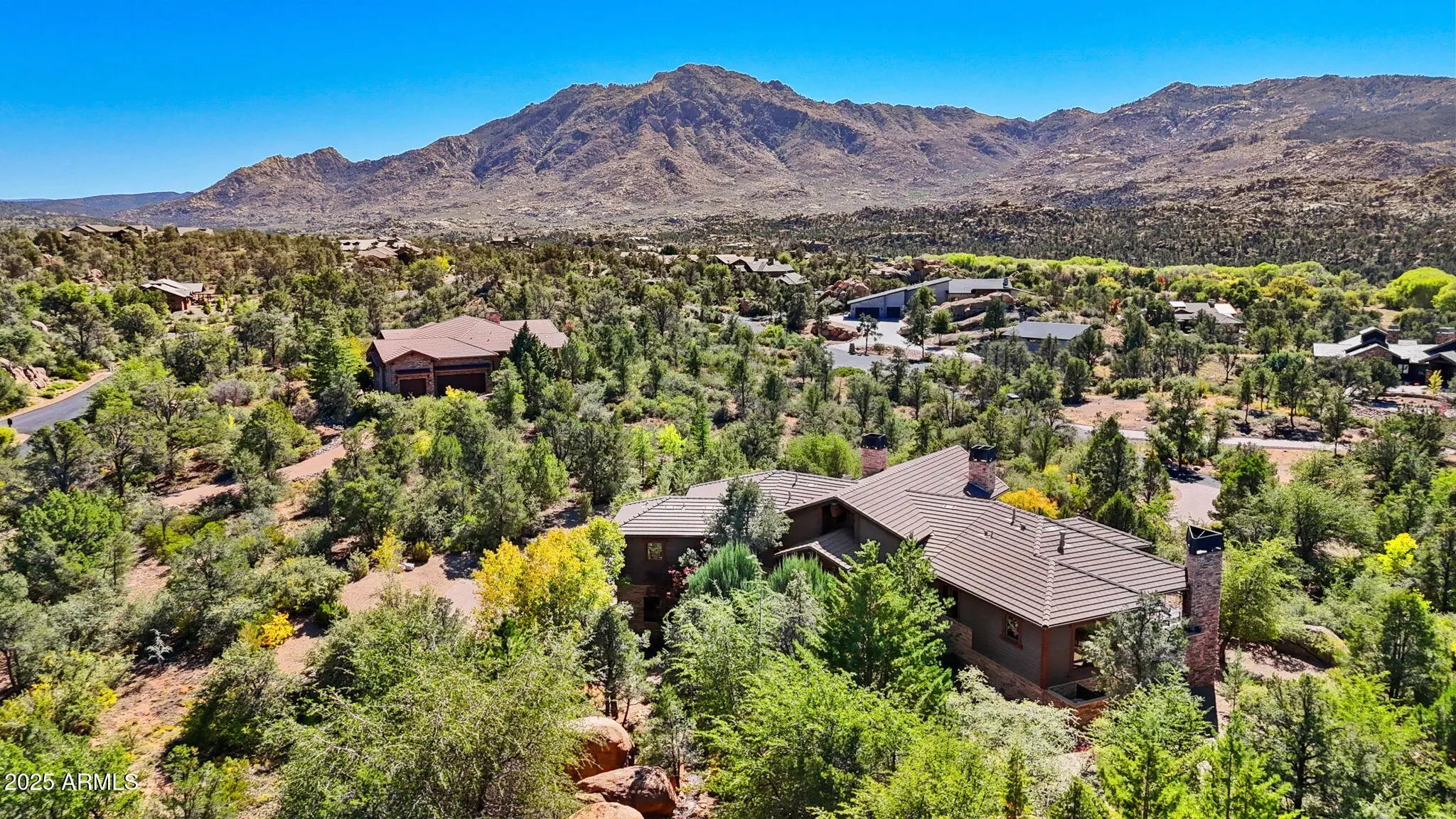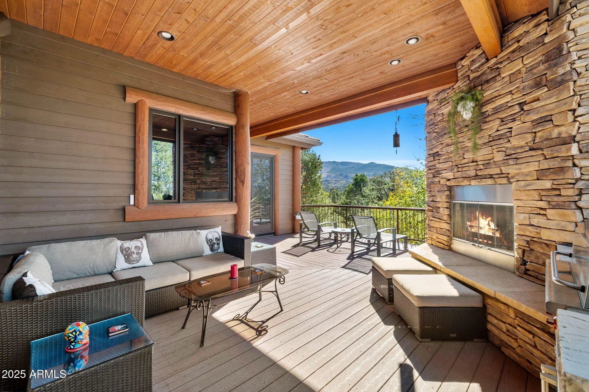 Experience elevated living in this custom 5690 sq ft estate nestled on 3.13 acres. Designed for both luxury and livability, this home offers panoramic views of Granite Mountain through dramatic walls of windows in the living room and master suite. The main level features a spacious master retreat and a private mini-master, complemented by a dedicated TV/Den room , formal dining and breakfast room. The gourmet kitchen boasts high-end appliances, striking blue quartz countertops and backsplash, & custom cabinetry with abundant storage. Downstairs you will find an additional bedroom, office and space to entertain effortlessly in the expansive game room with a full-size bar or the large media room for movie nights at home. Outside, enjoy the wrap around deck, waterfall, fireplaces & spa! More... The outdoor space offers wraparound decks and multiple patios including an elevated hot tub with built-in gas fireplace to create seamless indoor-outdoor living. A show-stopping 70+ foot waterfall feature adds tranquility and visual drama to the landscape. Additional highlights include a 3-car garage with luxury epoxy flooring, unique architectural details, and access to American Ranch amenities: full equestrian facilities, clubhouse, pool, fitness center, and more. This is a rare opportunity to own a one-of-a-kind mountain-view masterpiece in one of Prescott's most sought-after communities.
