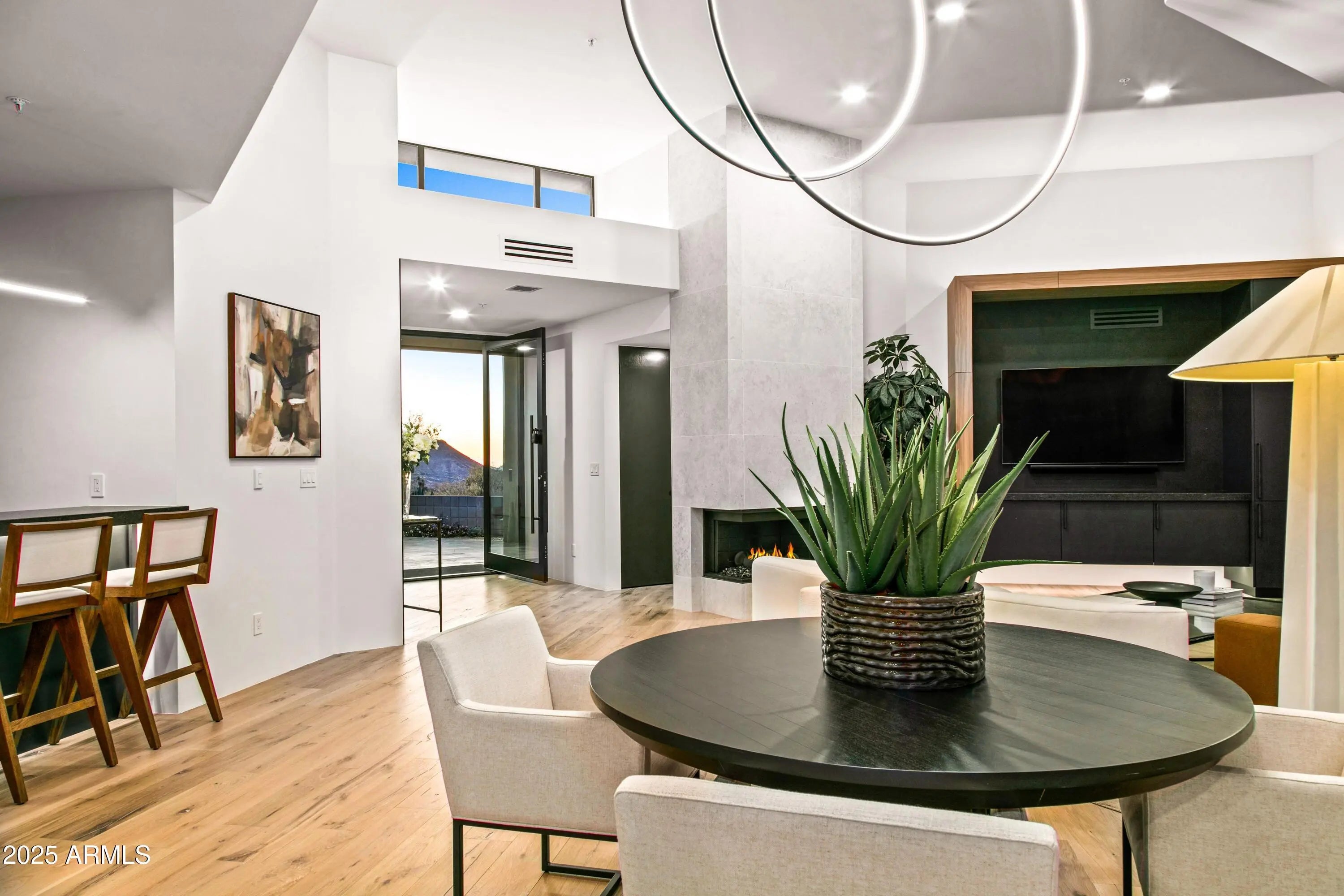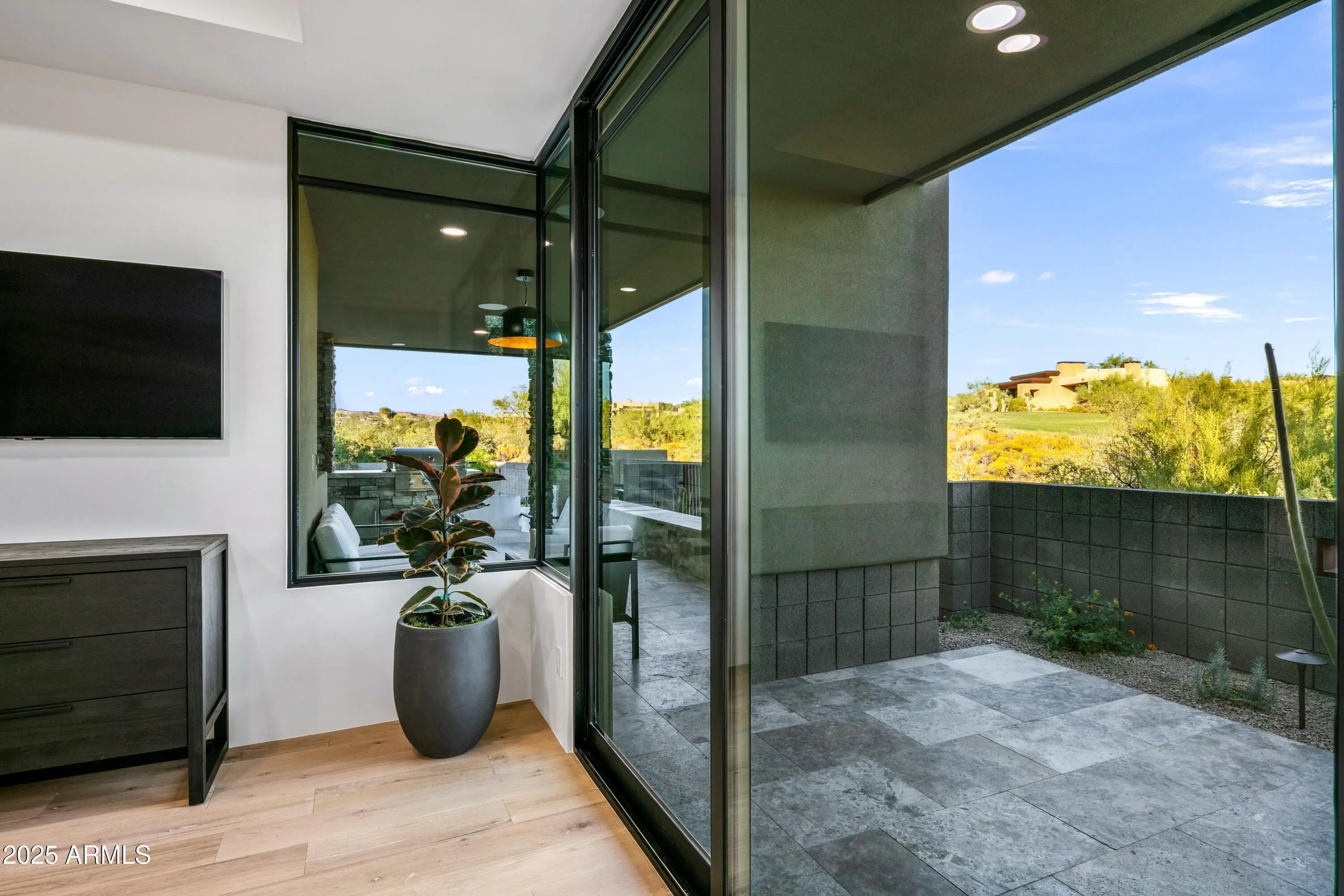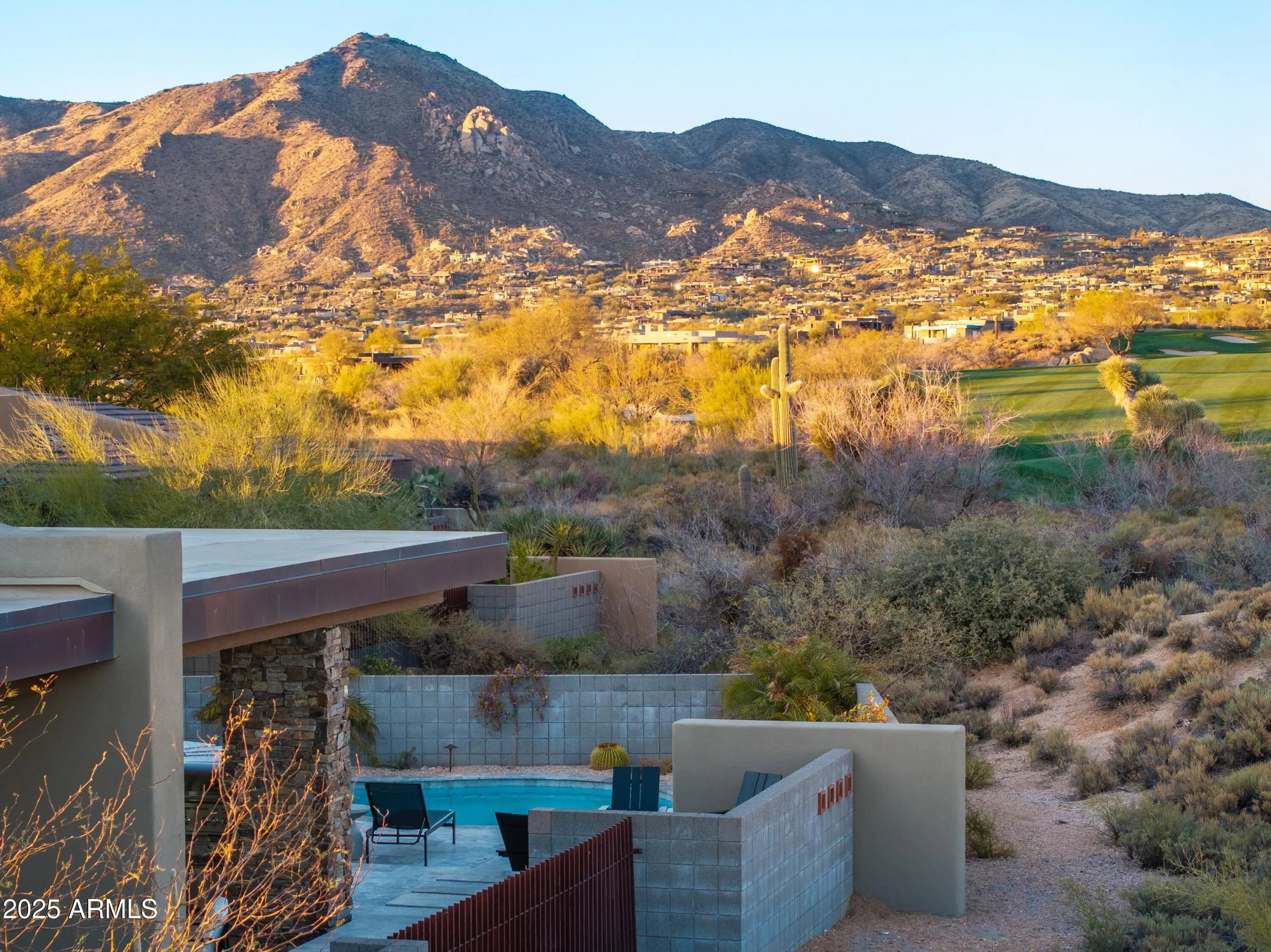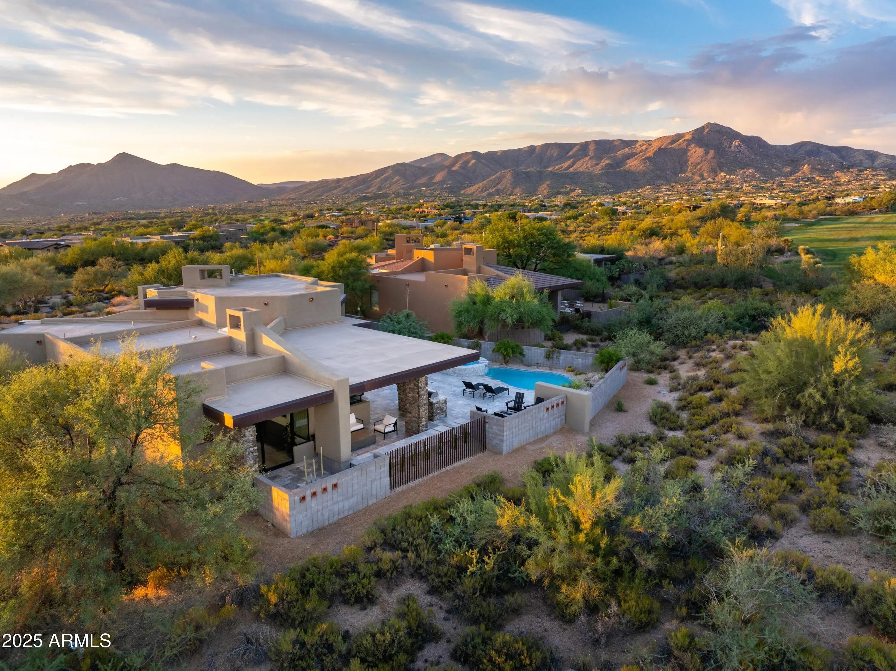 Prepare to be wowed! This elevated contemporary sanctuary in the prestigious Desert Mountain community has been completely transformed with todays most sought-after high-end finishes, delivering a seamless blend of sophisticated style and effortless indoor-outdoor living. Whether you're looking for a full-time residence or a seasonal escape, this home is designed to impress at every turn. Designed by Bing Hu. the timeless architecture is kept, while the interior is transformed by Aesthetic Interiors & Design into todays lifestyle without compromising the original integrity. From the moment you arrive, the home commands attention. A sleek exterior of stucco and stacked stone, complemented by slump block walls, clean lines, expansive glass, and striking Sonoran Desert landscaping, sets the tone for the beauty within. The stone-tiled entry leads through a metal-framed glass storefront door with sidelight panes, opening to an interior that exudes warmth and sophistication. Set on a single level with no steps, the open floor plan flows with grace, capturing breathtaking Northeastern panoramic Apache golf course and mountain views. Thoughtfully designed, the home offers three ensuite bedrooms or two plus an office ensuring privacy and comfort for all. Inside, wide-plank wood flooring provides the perfect canvas for modern living. A floor-to-ceiling tiled fireplace anchors the great room, while a dramatic wood-framed black entertainment wall adds depth and style. In the dining space, a stunning black circular chandelier makes a bold statement, paired with a sleek wet bar featuring a satin granite waterfall-edge countertop and black tile accent walls. Expansive walls of glass connect the interior to the stunning outdoor oasis, enhancing the homes bright, open feel - amplifying the WOW factor. The gourmet kitchen is equally stylish and functional, designed for everything from intimate meals to lively gatherings. A peninsula island with bar seating makes casual dining a breeze, while warm walnut slab cabinetry, bold black fixtures, and top-of-the-line appliances elevate the cooking experience. The primary ensuite is a sanctuary of relaxation, featuring a floor-to-ceiling fireplace, spa-inspired wet-room shower and freestanding tub, and elegant golden brass fixtures. A spacious custom walk-in closet behind a chic barn door adds both elegance and practicality. Wake up to stunning mountain and lush green views, framed perfectly through corner windows and sliding glass doors. Two additional designer guest ensuites, equally impressive in style and quality, offer private patio access and the same high-end finishes seen throughout the home ensuring your visitors experience the height of comfort and privacy. Step outside to your intimately designed private resort-style escape, where a raised circular spa spills into a sparkling pool with pebble sheen and LED light show, all set against a beautifully wrapped stone patio. Whether youre lounging poolside, grilling in the outdoor kitchen, dining under the covered patio, or stargazing by the warmth of the 5 linear gas firepit this space is designed for year-round enjoyment. Located in the Village Desert Greens, a coveted mid-mountain enclave, this home offers quick access to the Sonoran Fitness Club, featuring tennis, pickleball, hiking trails, a state-of-the-art fitness center, and a luxury spa. With seven golf courses, clubhouses, and 20 miles of trails bordering the Tonto National Forest, this is a community where adventure and tranquility coexist. Live the high life in this exceptional home, nestled within the renowned Desert Mountain community of Scottsdale, Arizona.