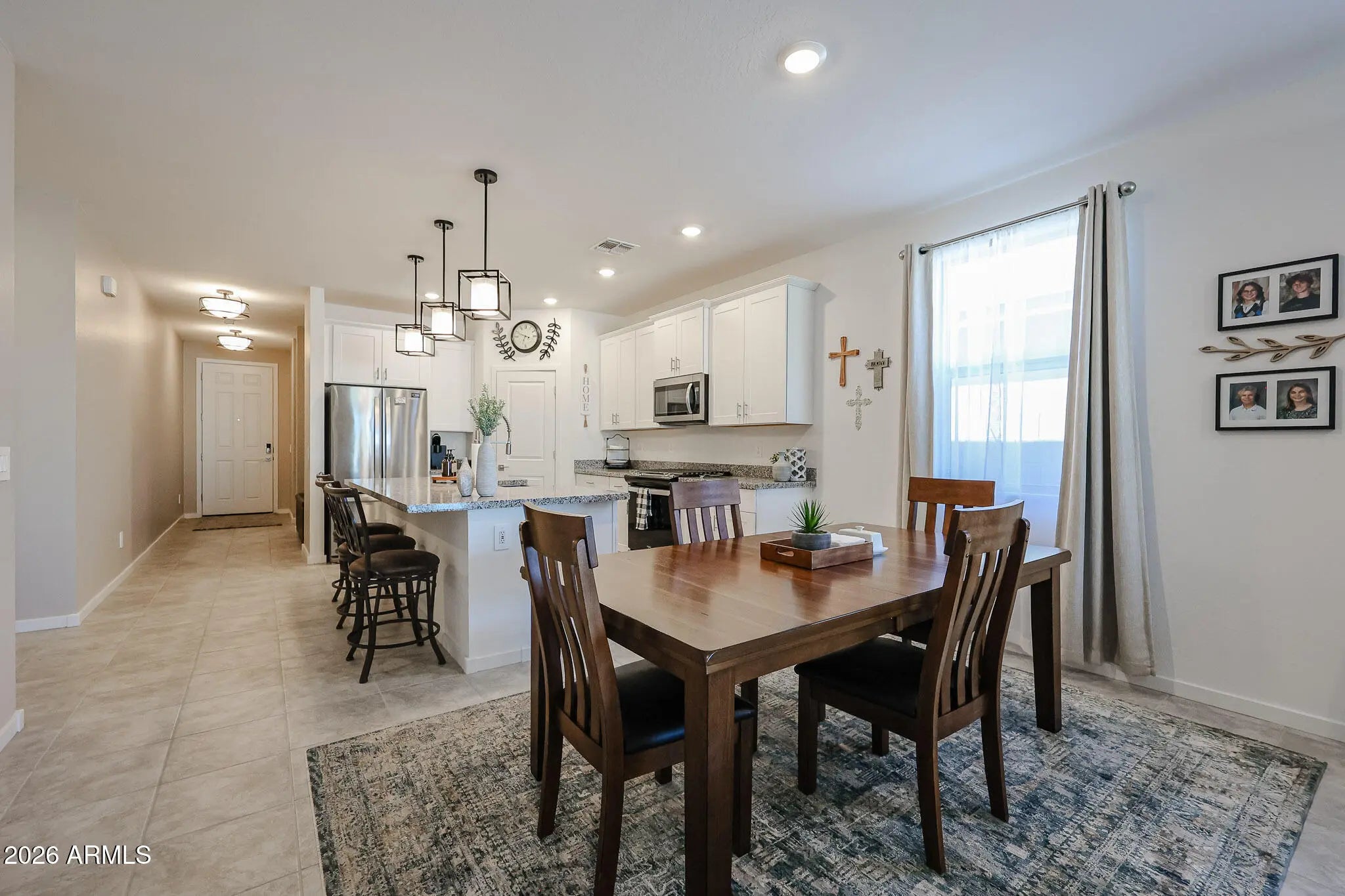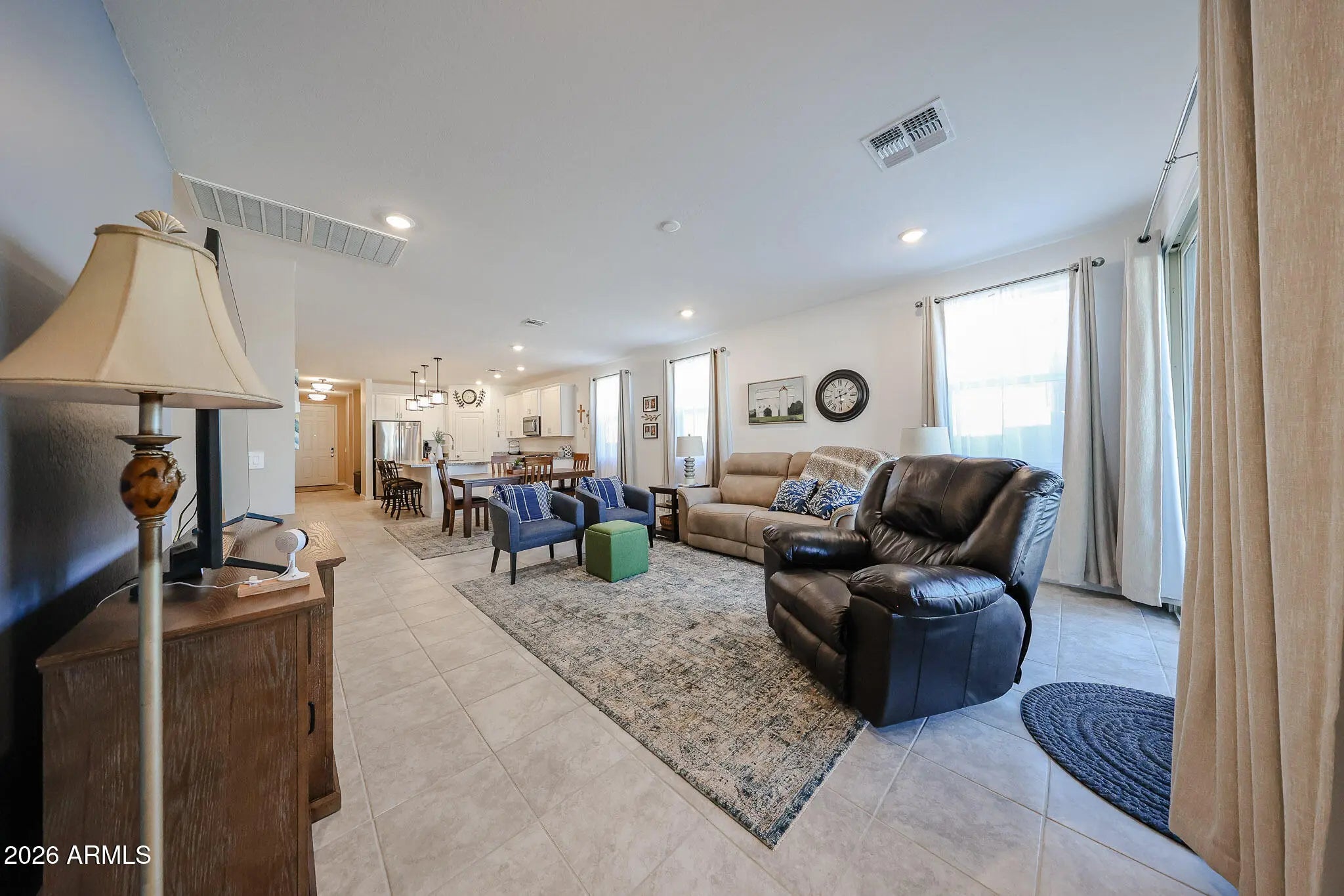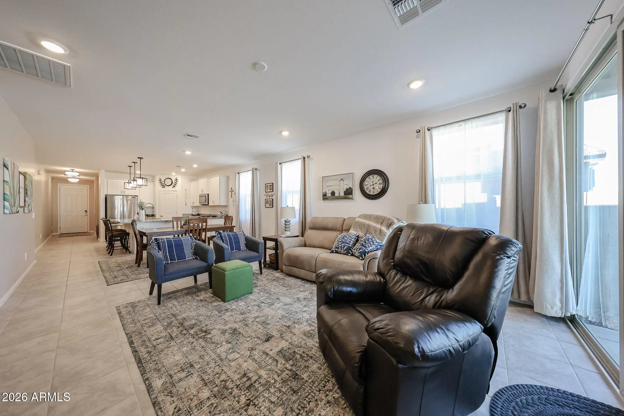 Nestled in growing San Tan Valley community, this modern 4bedroom, 3bath home features an open-concept layout that maximizes natural light and creates an inviting flow from the great room to the kitchen and dining areas. The kitchen is designed as the hub of the home, with a large central island, ample cabinetry, and generous counter space that is ideal for meal prep and casual gatherings. Adjacent living and dining spaces make entertaining easy, A private primary suite is situated away from secondary bedrooms, offering a relaxing retreat, a guest suite offers comfortable accommodations for overnight visitors. The surrounding area showcases beautiful mountain views and convenient access to hiking, dining, and a vibrant community filled with amenities for an active Arizona lifestyle
