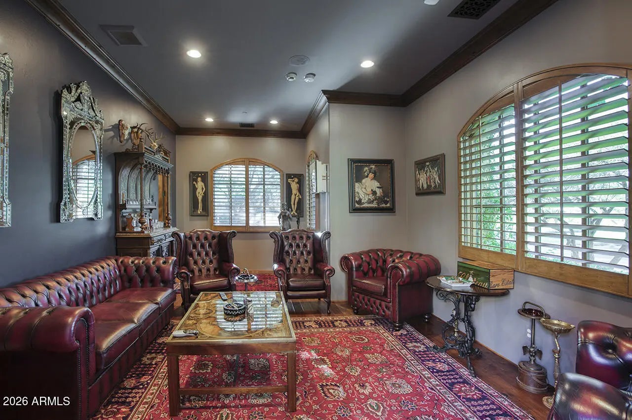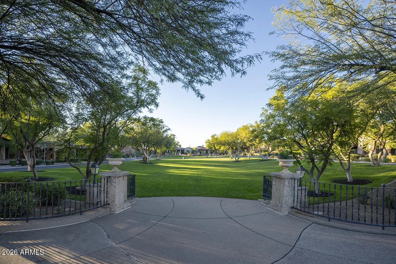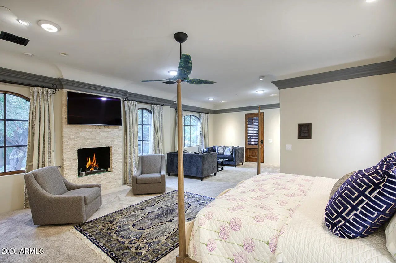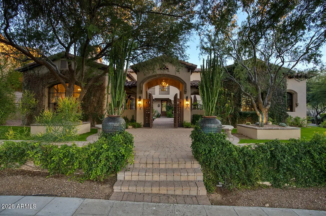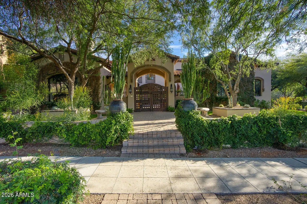 Set within the guard-gated enclave of Silverleaf Parks in Scottsdale, this custom estate is ideally positioned on a desirable corner lot amid mature landscaping and picturesque, tree-lined streets. With two community parks directly adjacent and all eleven neighborhood parks—including a tranquil lake—just around the corner, the setting is both storybook and convenient. Designed around a central courtyard, the home offers exceptional outdoor living with a pool, spa, fireplace, barbecue, and expansive lounging and dining areas—perfect for entertaining or everyday enjoyment—along with a separate guest casita providing privacy and flexibility. Inside, the thoughtfully designed floor plan balances elegance and and livability, enhanced by refined finishes throughout. Wood flooring, brick and beam ceiling details, and first-class craftsmanship create a warm yet elevated atmosphere. The spacious gourmet eat-in kitchen features an oversized island with gas cooktop, Sub-Zero refrigerator/freezer, and generous gathering space. The family room serves as the heart of the home, highlighted by a striking double-sided fireplace and seamless indoor-outdoor living as it opens directly to the courtyard and outdoor entertaining spaces. The fireplace also anchors a refined library/den with wet bar, offering an inviting space for both entertaining and quiet retreat. The split owner's suite is a true sanctuary, offering a large sitting area with fireplace, a spa-inspired bath with soaking tub, and an expansive wardrobe closetall conveniently located on the main level. An additional ensuite bedroom downstairs adds versatility. Upstairs, two ensuite bedrooms are complemented by a generous loft with a built-in cabinet wall and access to a beautiful extended balcony. A private flex space located just off the loft provides additional versatility for a home office, media room, or creative retreat. A special home in a truly special, park-side setting, this residence offers timeless design, elevated finishes, and thoughtful spaces within one of Scottsdale's most coveted communities.