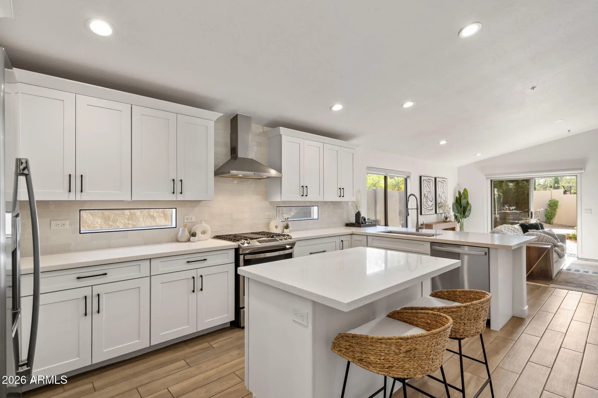 Completely remodeled home in McDowell Mountain Ranch offering modern design, quality finishes, and true move-in-ready convenience. This 3-bed, 2-bath features new cabinetry and quartz countertops throughout, stainless steel appliances with a 5-burner gas range and hood, tile flooring with 5-inch baseboards, LED lighting, updated hardware and fixtures, and fresh interior and exterior paint. The open-concept kitchen and great room are designed for both everyday living and entertaining with a linear fireplace, space for a 100-inch TV, vaulted ceilings, and abundant natural light. The spacious primary suite includes a walk-in closet and a fully reimagined bathroom with glass-enclosed shower, dual vanities, and designer finishes. The backyard is a private retreat with a covered patio, built-in BBQ with bar top seating, firepit, putting green, and low-maintenance turf -ideal for year-round enjoyment. Additional features include roller shades throughout, front security door, EV charger, and a 2-car garage.