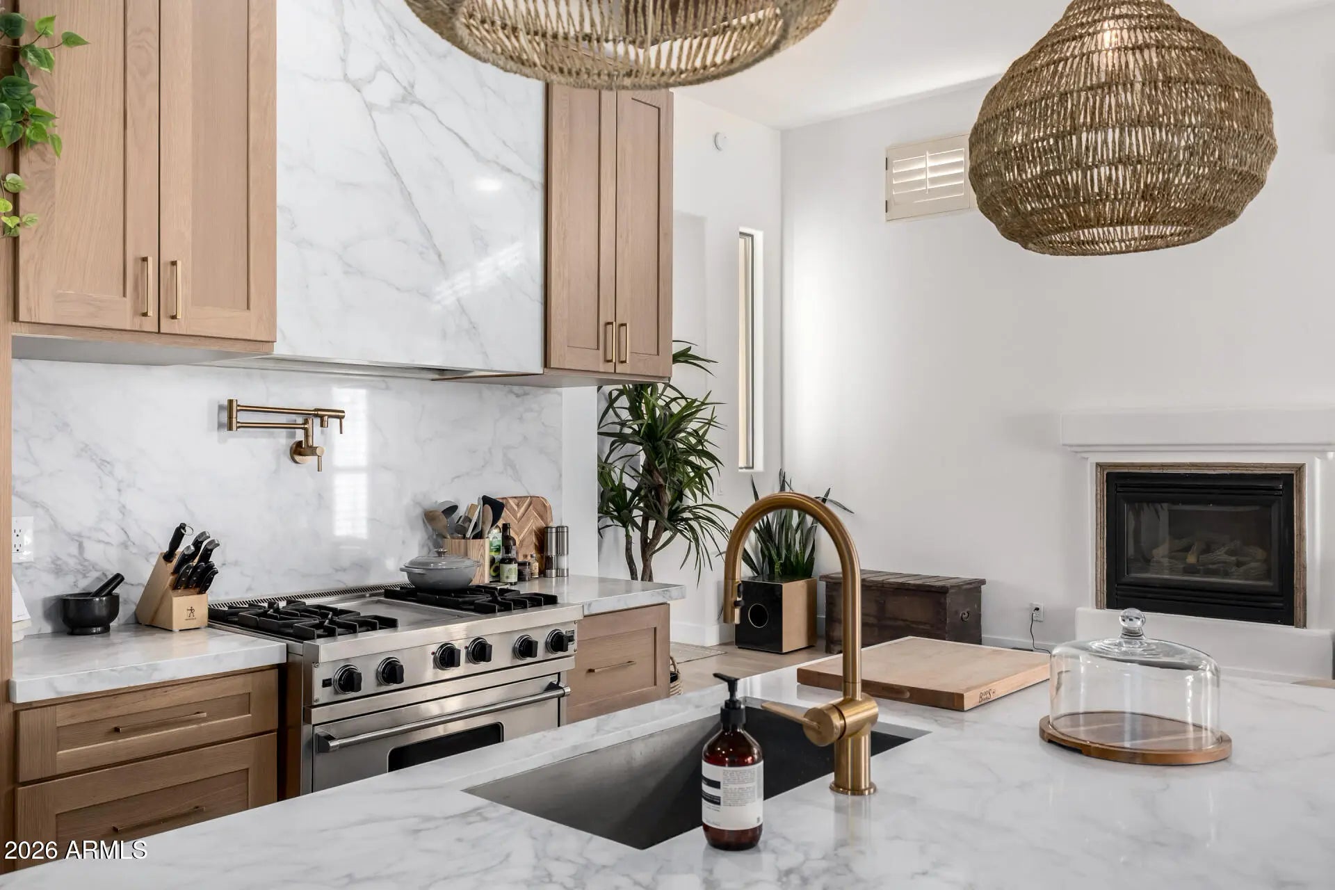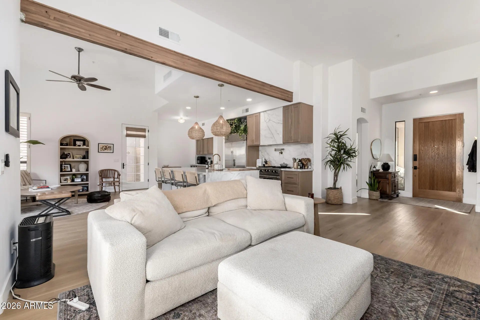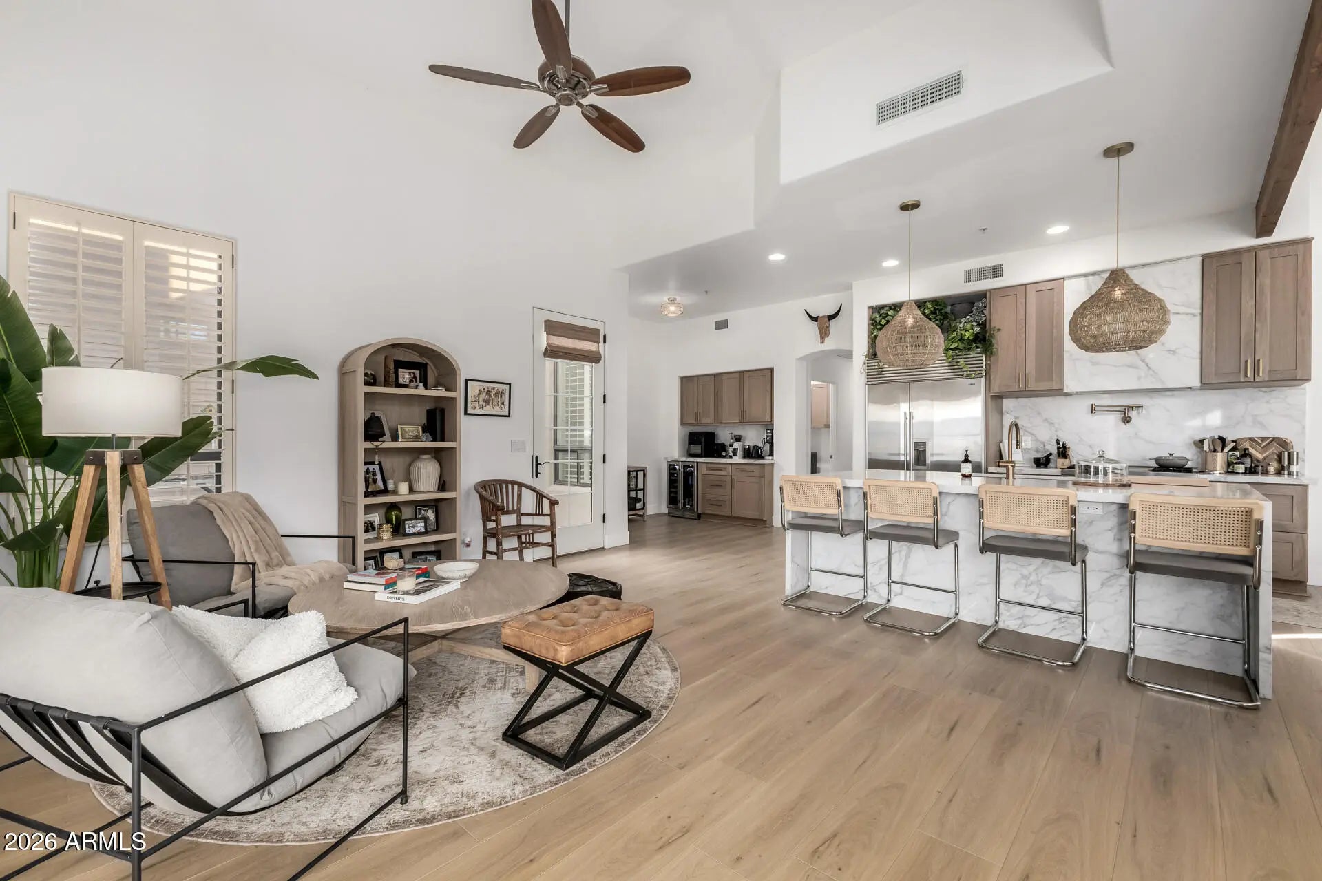 Nestled within the prestigious gated community of Los Abrigados in Scottsdale, this beautifully appointed 2-bedroom, 2-bath residence offers refined living near Scottsdale's premier golf courses and an unbeatable location. Bright and inviting, the home is filled with natural light and features plantation shutters throughout, adding timeless style and privacy. The open-concept kitchen is a true centerpiece, showcasing a large quartz island with an XL stainless steel island sink and garbage disposal, Viking oven range and dishwasher, SubZero refrigerator, and a built-in beverage center bar with fridge—perfect for entertaining or everyday living. New LVP flooring flows seamlessly throughout the home, complemented by tile accents and a cozy fireplace that adds warmth and charm. The spacious primary suite serves as a private retreat with an ensuite bath, complete with a large soaking tub and walk-in shower. Additional highlights include in-unit laundry featuring a 2024 Samsung washer and dryer, a Nest thermostat, and a two-car garage. Step outside to a low-maintenance desert-landscaped backyard with a covered patio, ideal for enjoying Arizona's indoor-outdoor lifestyle. Residents of Los Abrigados enjoy access to a community pool and spa. Fantastic location near the 101 Freeway, Salt River Fields, Talking Stick, and all of the shopping and dining throughout McCormick Ranch and the Scottsdale Corridor, offering the perfect blend of convenience and luxury living.