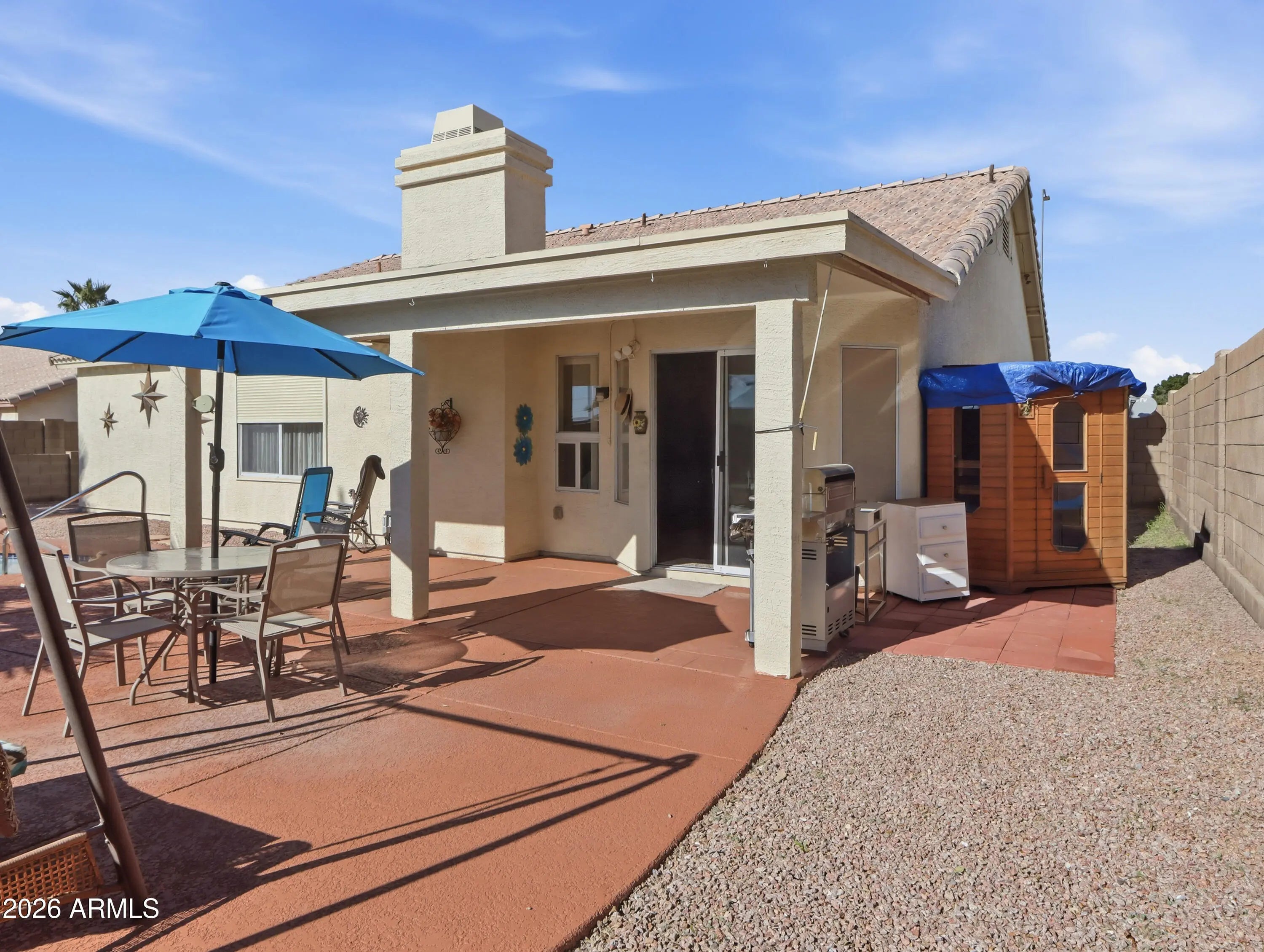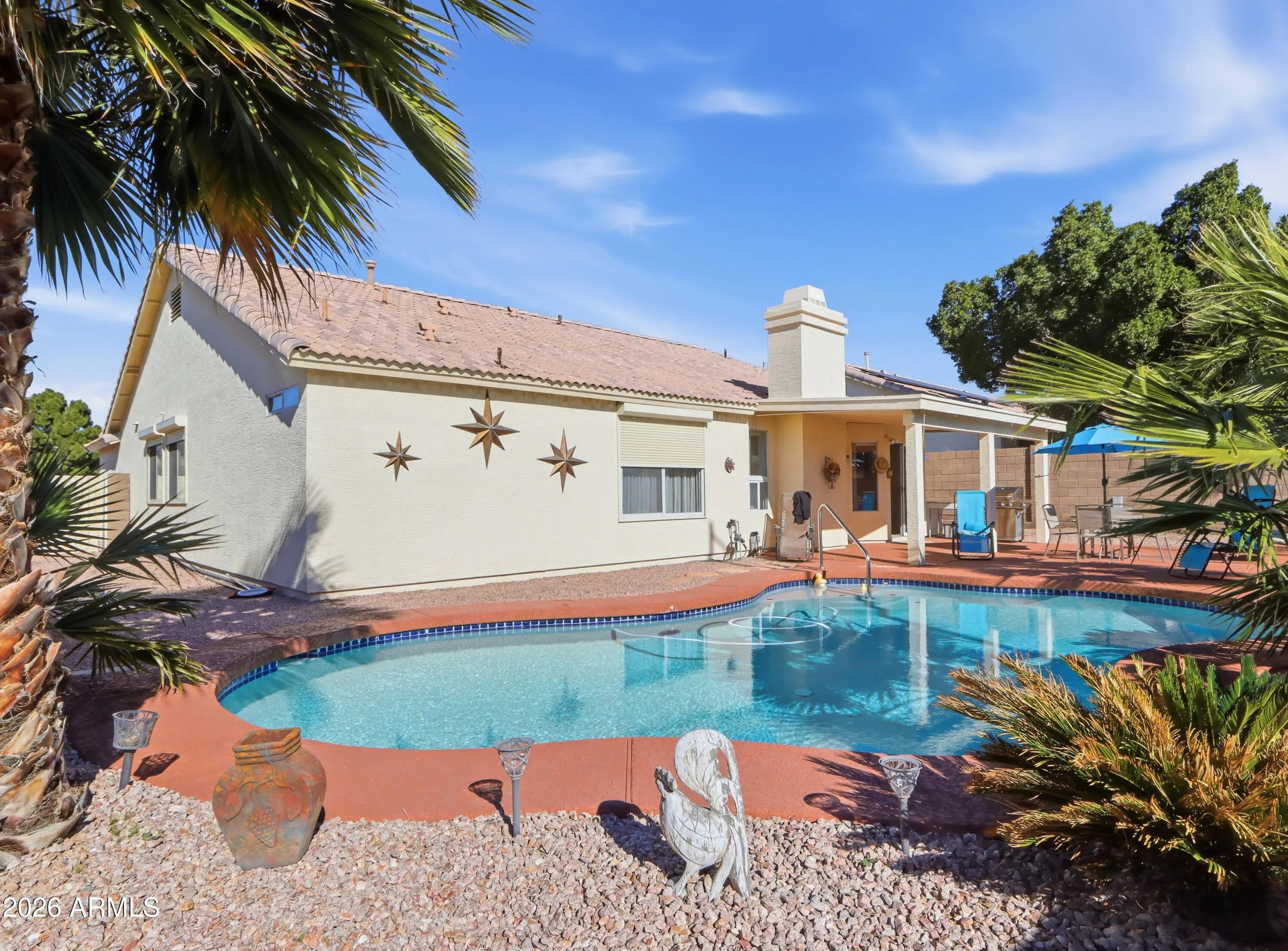 Across from Golf Course with views. Adorable, well-maintained furnished 4 bed, 2 bath single-level home in the family-friendly Villa Royale of Mesa with no HOA. Features include a formal living and dining room with vaulted ceilings and a spacious family room with gas fireplace opening to a well-appointed kitchen with granite countertops, oak cabinets, and a large island with bar seating. Casual dining area offers a bay window and sliding door to the backyard. Primary suite includes a private bath with extended vanity, large shower, and walk-in closet. Backyard is beautifully updated with a covered patio, resurfaced pool with heater (2021), raised garden beds with custom irrigation, and a freestanding sauna. RV gate, 2-car garage with built-in cabinets, and NEW AC compressor (2025). Mechanical Security Sun Shades