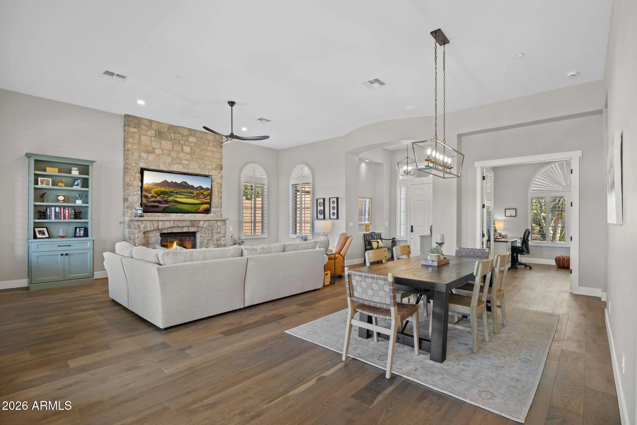 Unique Opportunity Priced Significantly Below Owners Investment Cost! After purchasing this 2BR+Den/Office, 2.5 Bath home in 2023 for $750,000 the owners invested $550,000 in 2024 and 2025 for a full home remodel! NEW Roof, HVAC System, Hardwood Floors, Carpet in Bedrooms, Baseboards throughout, Custom Stone Fireplace, All New Light Fixtures, Cabinetry Throughout, Quartz Counters Throughout, Thermador Stainless Appliances, Redesigned Primary Bathroom with Walk in Shower, Landscape Redesign, Belgard Pavers, Custom Pergola, Synthetic Turf, LED Landscape Lighting, Travertine BBQ, Shutters, Ceiling Fans, Built-in Sonos Sound System, Recessed 75'' TV, New Fixtures and Hardware, Added Insulation, New Paint Inside and Out. This is a must-see home that where no expense was spared. Move in Ready