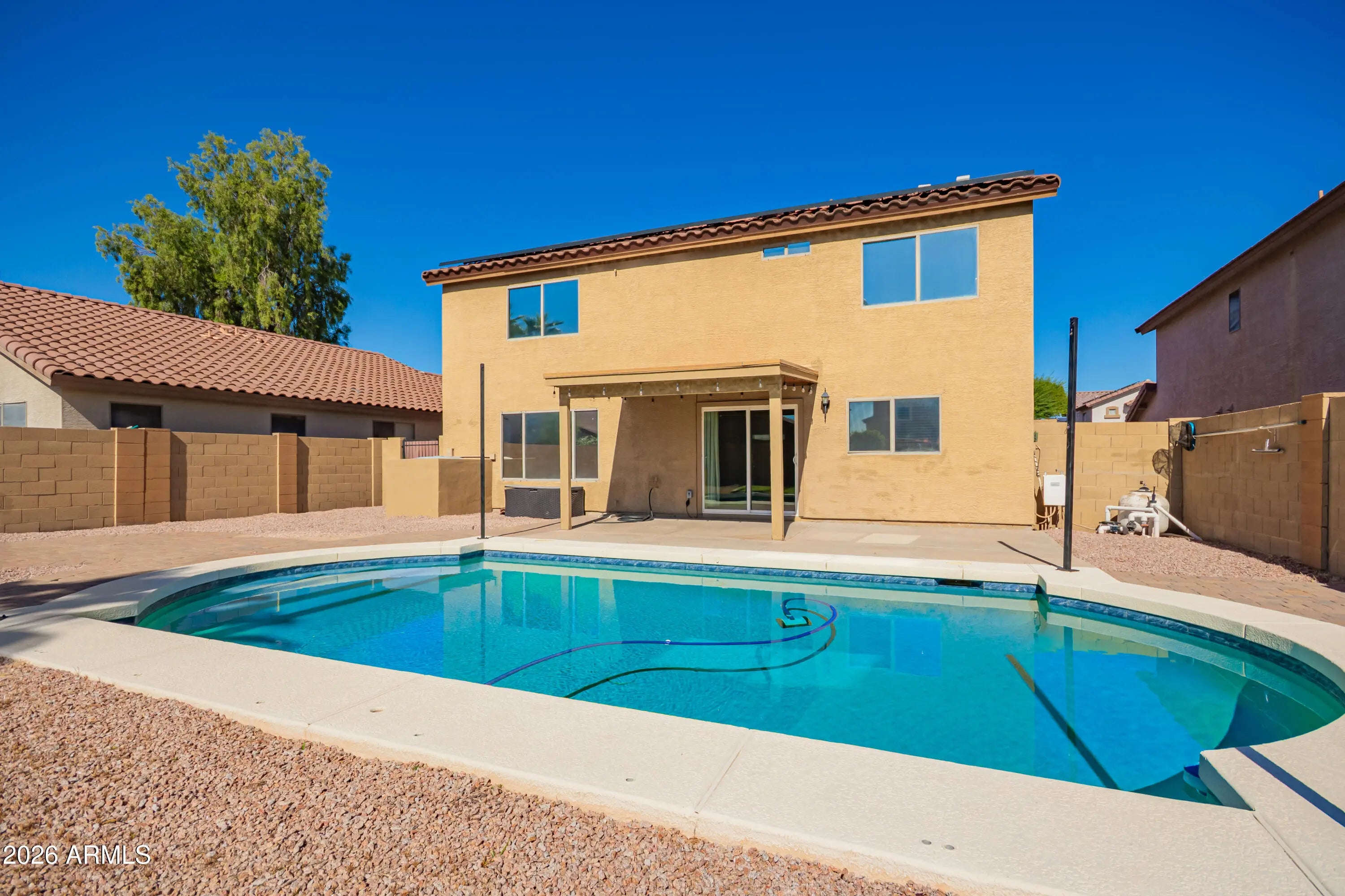 Home, sweet home! This gorgeous two-story pool home has it all. 3 bedrooms, 2.5 bathrooms, a loft, & a 2-car garage. Explore the spacious interior, featuring soaring vaulted ceilings, tile flooring, BRAND NEW ROOF, crown molding & a soothing palette. The well-appointed kitchen is complete with shaker cabinets, a stylish backsplash, a granite peninsula, & SS appliances. Get a restful sleep in the main suite, displaying a walk-in closet for easy organization & a full ensuite with dual sinks. The loft is the perfect spot for a gaming zone. In the backyard, you'll have plenty of space for outdoor activities, including a covered patio, a nice seating space with pavers, a grass area perfect for a playground & a sparkling pool for hot summer days! Hurry up, this gem won't last