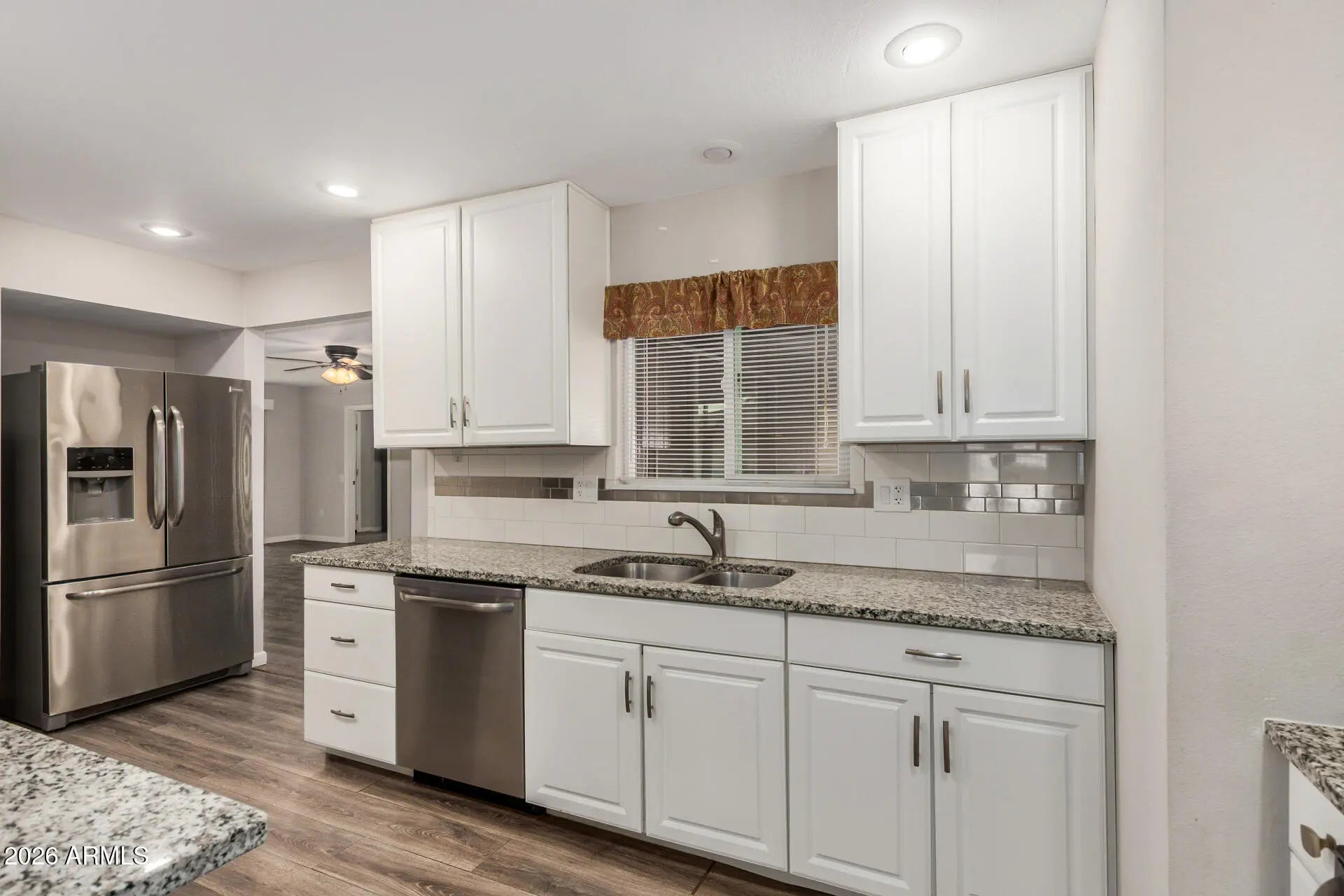 Do not let the outside fool you, this home has been updated with all the right stuff! Beautiful kitchen with stainless steel appliances, granite countertops, and new white cabinets. Open floor plan with a beamed cathedral ceiling in the living room and a separate dining room with bonus space off the kitchen. Upgraded bathrooms with a walk-in shower in the primary bedroom. Dual pane windows, easy-care, wood look luxury plank vinyl, and a newer garage door. The two-car garage has plenty of room for parking along with built-in storage cabinets. Shaded over-sized front patio and large covered rear patio extend your living area and afford wonderful entertainment spaces. This is the one!