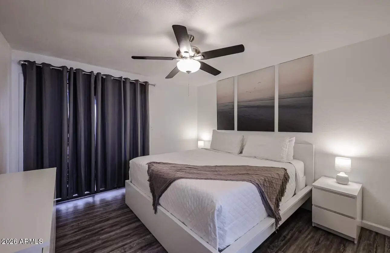 Take a look to this turnkey ready two bedroom, two full bath condo, located just minutes away from Old Town Scottsdale. This is a first floor end unit, It has a community pool/spa and is located only steps from the included covered parking space. Very close to Scottsdale Fashion Square, Old Town, Entertainment District, Spring Training stadiums, and ASU. Easy access to Sky Harbor Airport. This property is allowed for short-term rentals without restrictions.