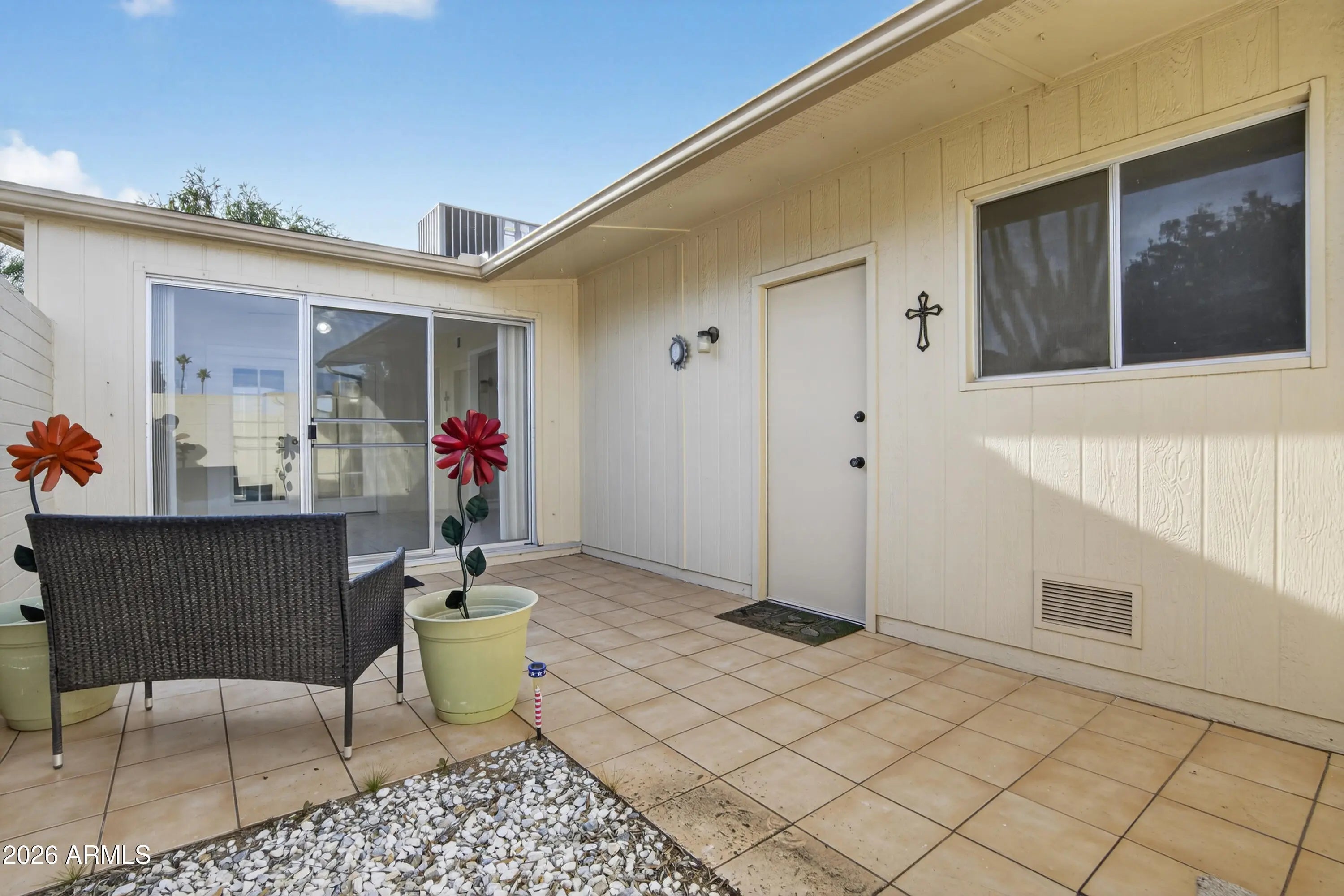 Welcome home to this inviting one bedroom, one bath patio home—perfectly sized for easy, comfortable living. Freshly painted interior. Skylights fill the home with natural light, creating bright and welcoming spaces throughout. The spacious bedroom features a walk in closet, while the Arizona room overlooks a charming, enclosed rear patio and offers endless possibilities to make it your own. The well appointed kitchen provides both function and style. The extended one plus car garage includes built in cabinetry for extra storage and offers direct access to both the home and patio. A convenient laundry sink complements the included washer and dryer. Ideally located near shopping, dining, and recreation centers, this home blends comfort, convenience, and potential.