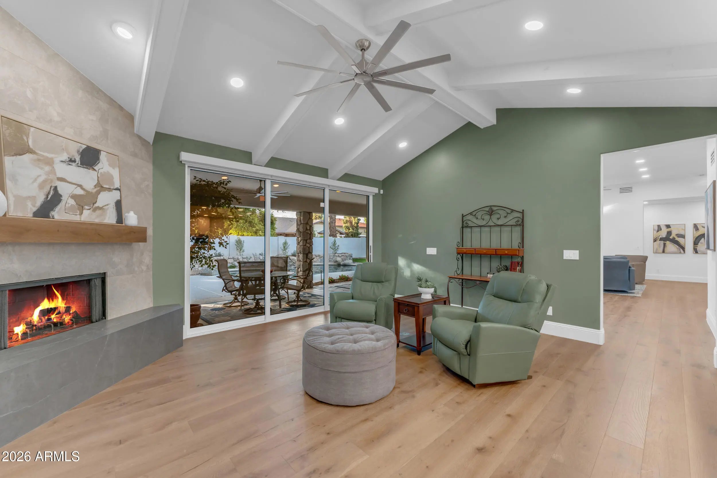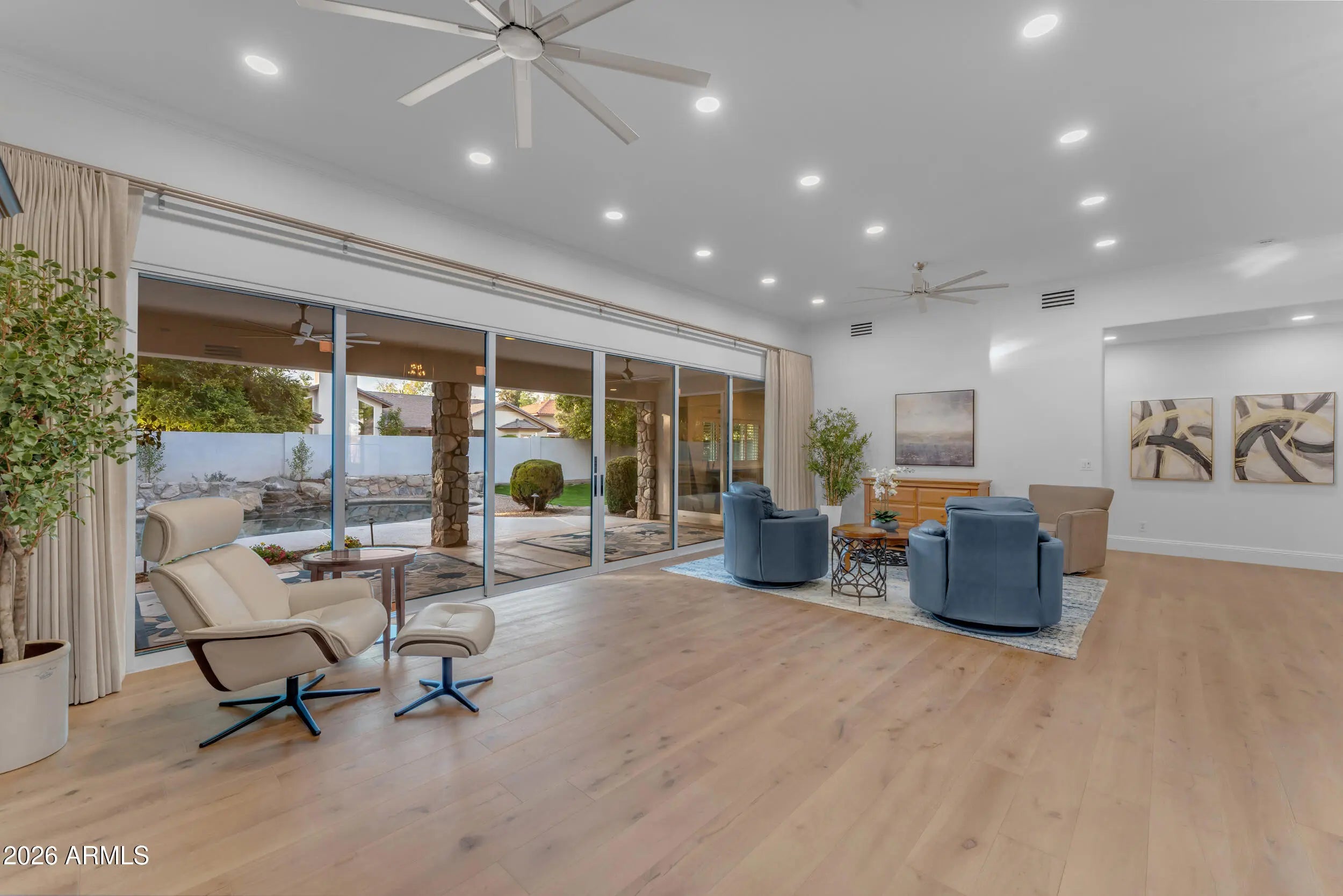 Located in the highly desired College Lane gated community in Tempe, this luxury contemporary home offers modern living with high-end style and comfort. Lush green landscaping creates a warm welcome as you arrive, leading to elegant double doors that open into a bright foyer. Natural light fills the living room through tall six-panel atrium doors, enhanced by custom Roman shades and classic shutters that add both beauty and privacy. Wood flooring flows through the main living areas, giving the home a clean and updated feel. The family room features four-panel atrium doors and a hearth stone tiled fireplace, creating a perfect space to relax or entertain. The gourmet kitchen is a dream for chefs and home cooks, featuring quartz countertops, a tile backsplash, a large center island, walk-in pantry, and a stylish wine and coffee bar. Premium appliances include a Wolf induction cooktop, double oven range, and a Sub-Zero refrigerator. The primary bedroom is a peaceful retreat with his and hers walk-in closets, and a spa-like bathroom with a zero-entry shower, multiple shower heads, a soaking tub, and a private exit to the backyard. Outside, enjoy an extended patio, sparkling pool, wide green space, and added storage, ideal for entertaining or quiet evenings at home. With five bedrooms, four bathrooms, and modern updates throughout, this move-in ready Tempe luxury home offers the look and feel of new construction in a gated community close to shopping, dining, and top schools.