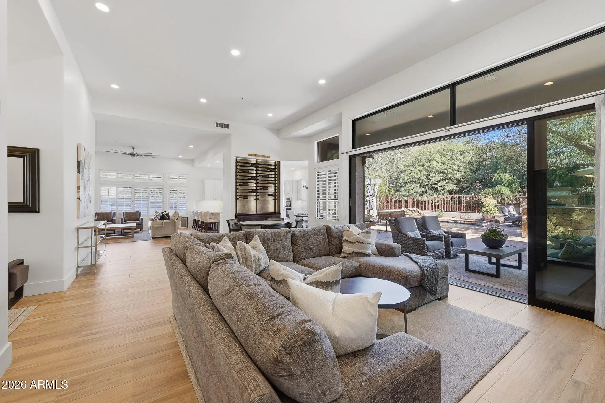 Welcome to this beautifully updated 4 BD + Den | 2 BA | 2,686 SF premium CORNER LOT home with front and rear exposure MOUNTAIN VIEWS in the DOUBLE-gated community of Ancala West Estates. Nestled between historic Frank Lloyd Wright Taliesin West, McDowell Mountain Preserve, and Ancala golf course lies, this home is designed for seamless indoor-outdoor living, this home showcases a stunning 16-foot wall-of-glass slider that opens to your PRIVATE backyard oasis with NO neighbors directly behind! Ultimate privacy backed by beautiful natural desert landscaping beyond the backyard wall. The resort-style backyard is designed for making memories has stunning MOUNTAIN VIEWS amongst a Pebble Tec pool with water feature (2022), outdoor fireplace, Built-in BBQ kitchen with bar seating, Lion premium grill, Danby refrigerator and Lion cooler, artificial turf, flagstone hardscape, dog run and much more designed for both entertaining and relaxation that you may never want to leave home. Throughout this upgraded home you'll love wide wood-plank tile flooring, LED lighting, plantation shutters, custom fans, and a wine display wall with custom lighting. The bright chef's kitchen offers quartz countertops and island, bar top seating, remodeled cabinetry with ample storage space, subway tile backsplash, stainless-steel appliances, resin sink, Brizo plumbing fixtures, and an eat-in dining area. The spacious primary with soaring vaulting ceilings offers private patio access, his-and-her closets with built-ins and safe, and a spa-like bathroom retreat featuring with double Toto sinks, walk-in shower with triple shower heads, and a Victoria + Albert soaking tub against the glass block wall. Guest bathrooms have been newly and thoughtfully updated rounding out a home where quality, comfort, and design come together beautifully. Additional highlights include a den/office with barn door, laundry room with custom shelving and hanging rack, epoxy garage flooring with extensive storage and workshop cabinetry, and HVAC systems approximately five years old. Hurry, because a home with these upgrades, views and privacy will not last long!
