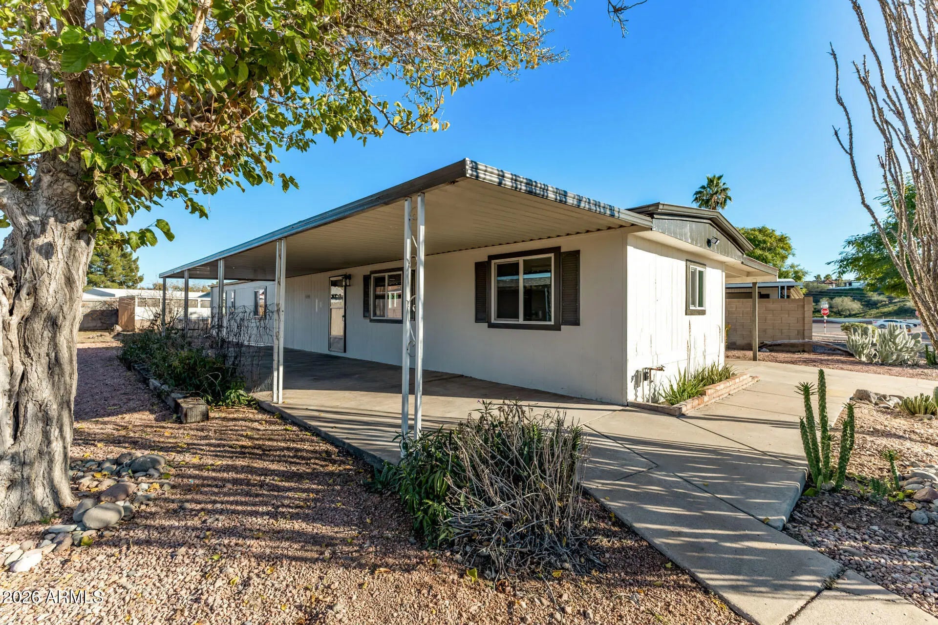 Seize the chance to own this 3-bedroom mobile home with no HOA! You're welcomed by a convenient carport, a low-maintenance desert landscape, and an inviting covered patio for outdoor relaxation. Discover a renovated interior featuring an appealing open layout with a soothing palette and stylish wood-look flooring. The updated kitchen boasts crisp white shaker cabinets, quartz counters, recessed lighting, and sleek stainless steel appliances for a delightful cooking experience. The main bedroom offers soft carpeting, a built-in closet with mirrored doors, and a private toilet for added comfort. Craft your dream outdoor retreat in the backyard. With no HOA restrictions, you'll have the freedom to innovate and personalize your space. Take advantage of this chance to make this yours!