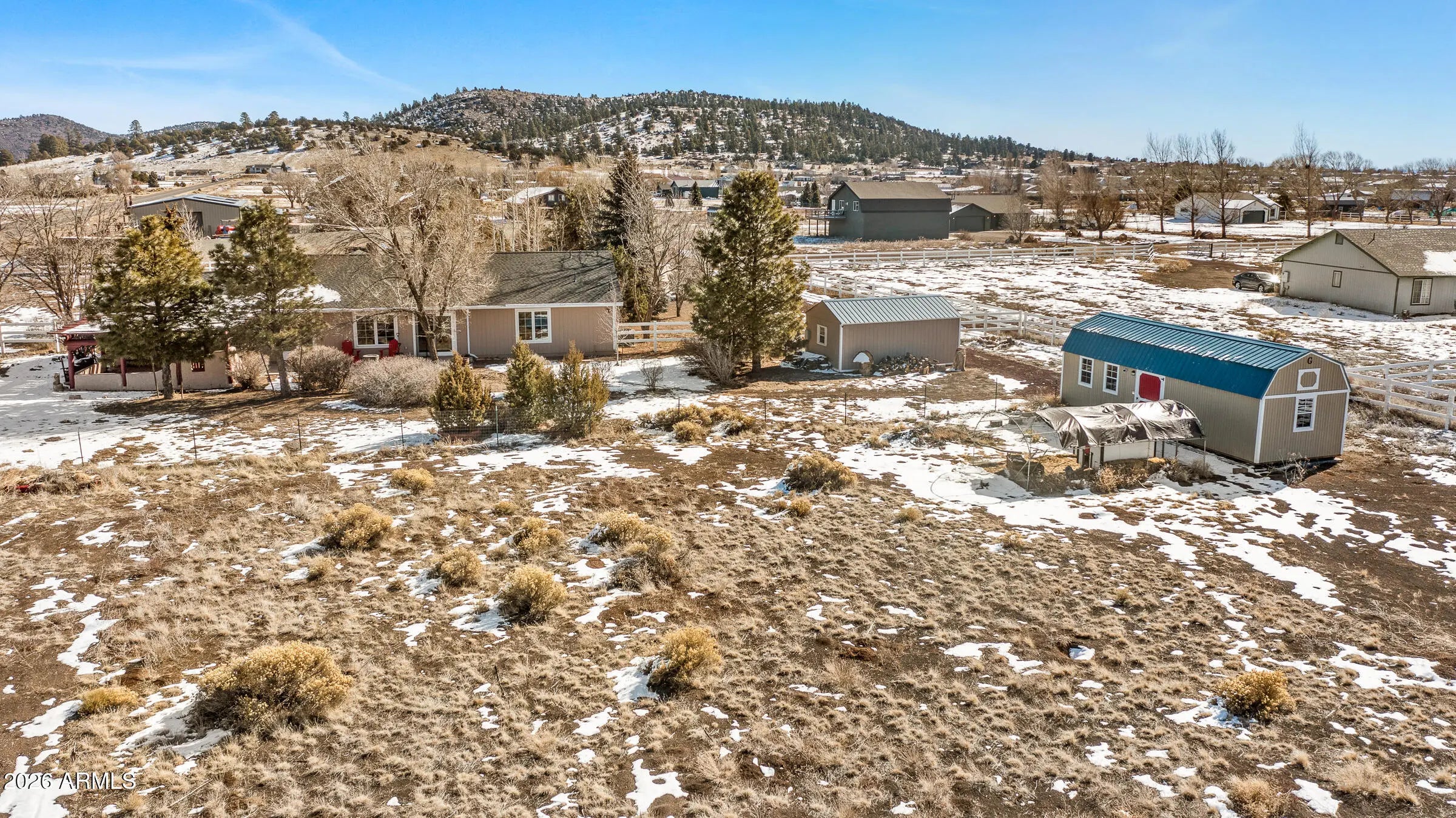 Enjoy the best of country living with the convenience of easy access to town on this fully fenced, 2+ acre property. Mature landscaping and established tree cover create a private setting while still capturing framed mountain views. The thoughtfully designed outdoor space includes an irrigation system for low-maintenance care. Inside, the great room features vaulted ceilings and a fireplace, creating a warm, open atmosphere. The kitchen and dining area flow seamlessly into a spacious family room or office, complete with a wood-burning stove for cozy winter evenings. Central A/C keeps the home comfortable in warmer months. The property includes a 10x16 shed with power, a 12x32 barn-style shed with interior lofts, a 6x8 greenhouse, raised garden beds, and a chicken coop with an enclosed run. Come see this peaceful, functional property with space to spread out and room to enjoy every season!