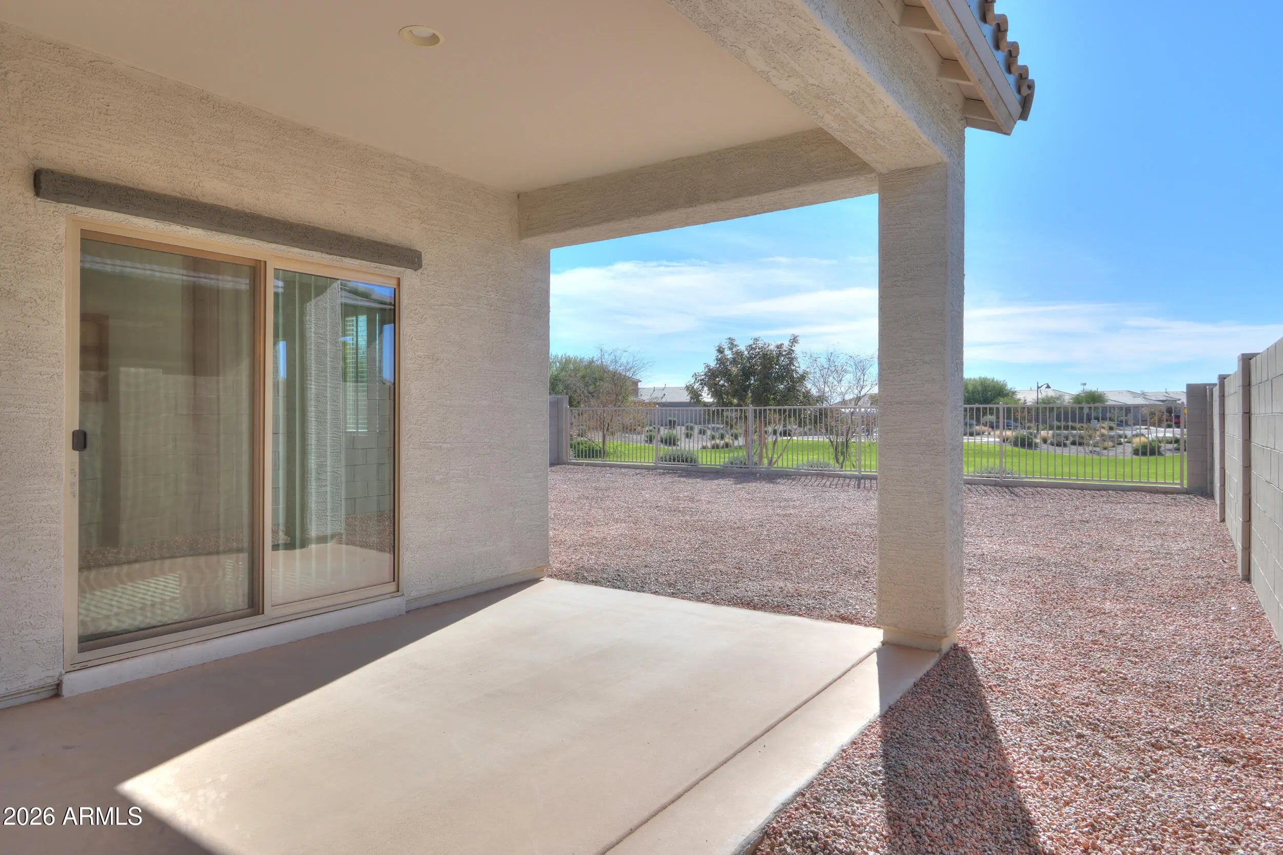 With a freshly painted interior this single story move in ready home looks and feels BRAND NEW. This home is especially clean and has a spacious layout with 3 bedrooms, window shades, fans in every room and 2 full bathrooms. The kitchen comes equipped with stainless steel appliances and the laundry room includes a washer and dryer as well as a refrigerator. The primary bedroom is bright and roomy, featuring a large en-suite bathroom with a walk-in shower and an oversized walk-in closet. Enjoy relaxing views from the backyard with a view fence overlooking a lush green park. Best of all this home is located within walking distance of Copper Sky Recreation Center where you'll have easy access to pools, fitness equipment, and a variety of recreational activities. Make time to see it today!