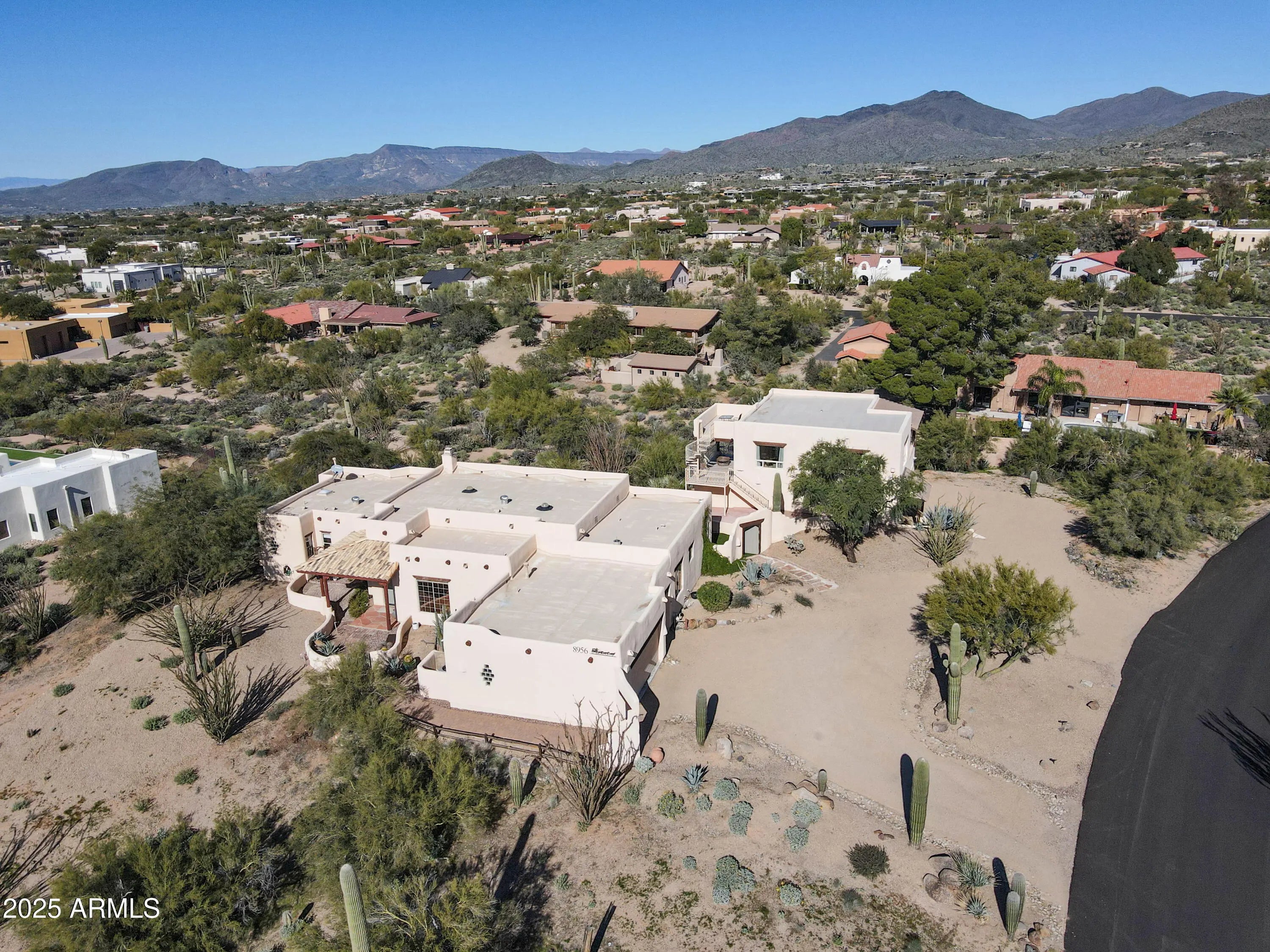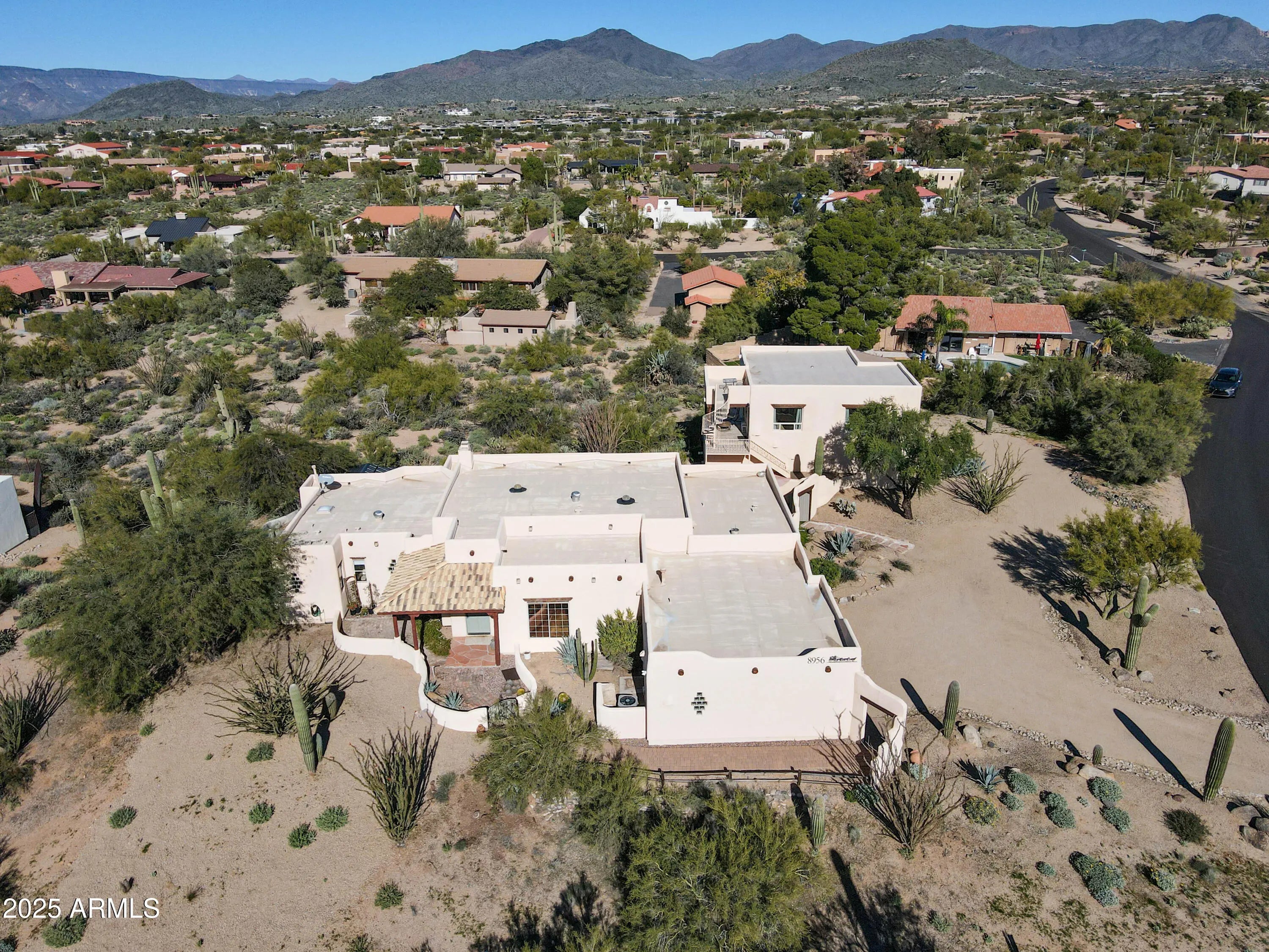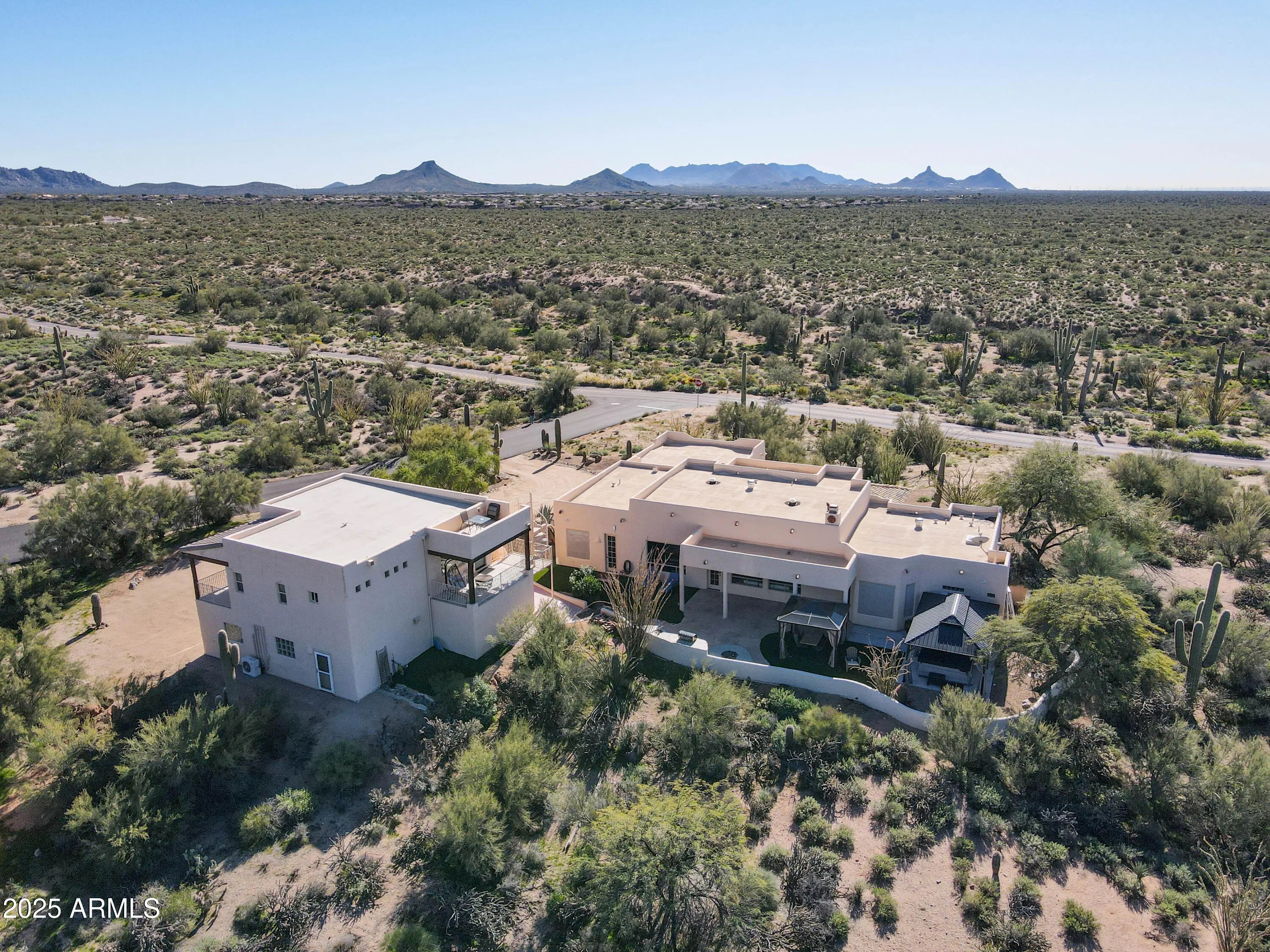 Soak in sweeping 360° panoramic mountain and sunset views from this timeless Carefree territorial estate, set on an acre-plus lot in the heart of the high Sonoran Desert. The property features a rare and highly desirable 1,000 SF one-bdrm, one-bath guest casita complete with a full kitchen, fireplace, and breathtaking views from every angle. The casita sits above an oversized 4car garage & an expansive temp-controlled workshop ideal for collectors or hobbyists. The single-level main residence offers a split floorplan featuring 3 bedrooms + den/4BDR, an updated kitchen, & 2.5 beautifully designed baths. The great room is anchored by a charming corner kiva fireplace, featuring an impressive 150'' projection screen framed by walls of windows inviting the outdoors in. More... The private backyard borders a natural wash and is designed for effortless entertaining with a built-in BBQ, sink, top of the line 8person spa w/UV light & firepit, with ample room to add a custom pool to suit your vision.(See renderings in docs tab). Perfectly positioned for winter living at its finest, this home places you minutes from world-renowned seasonal events including the WM Phoenix Open, Barrett-Jackson Collector Car Auction, the Arabian Horse Show, Scottsdale Art Week, and Carefree's beloved cultural festivals offering a vibrant blend of luxury, recreation, and desert charm.