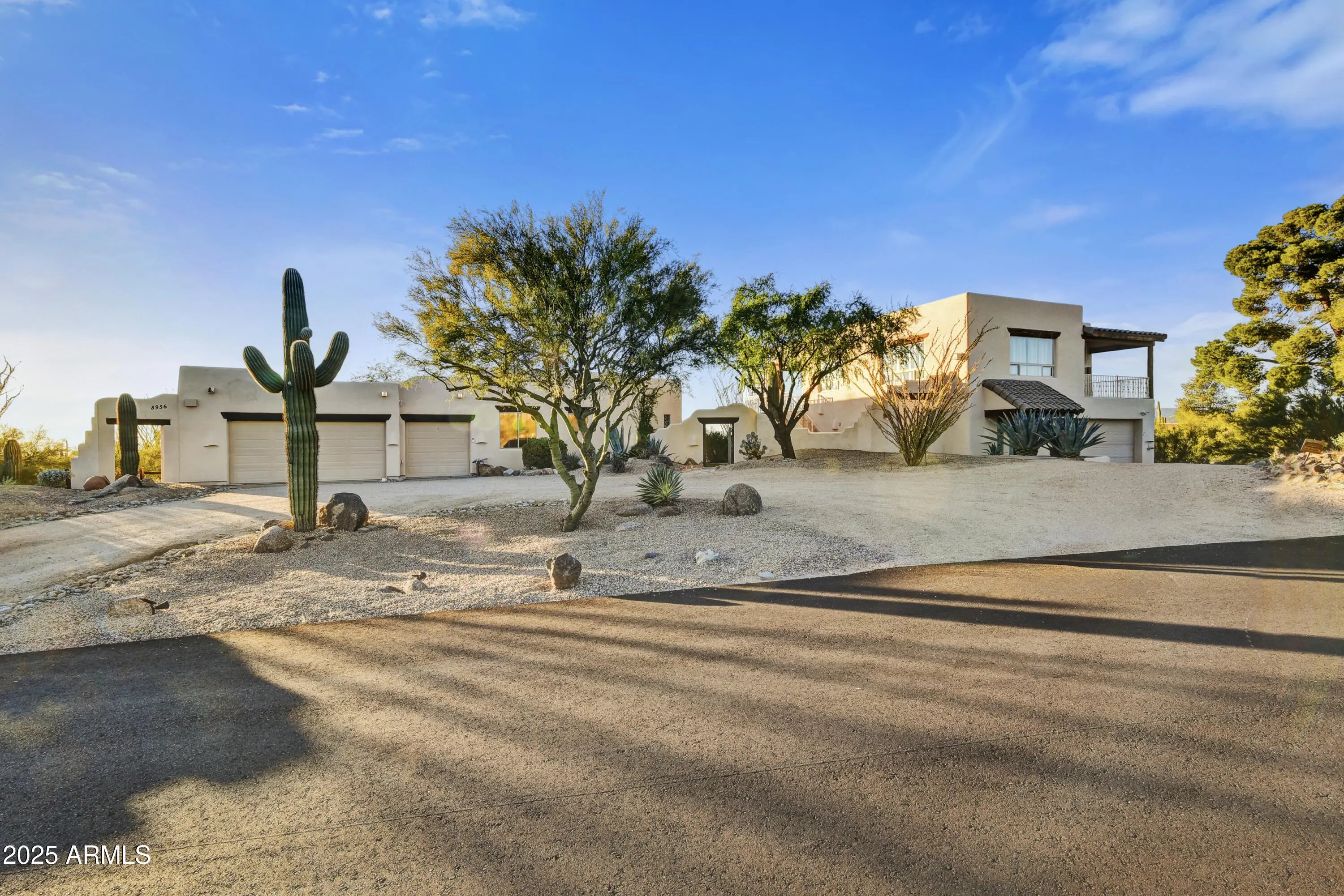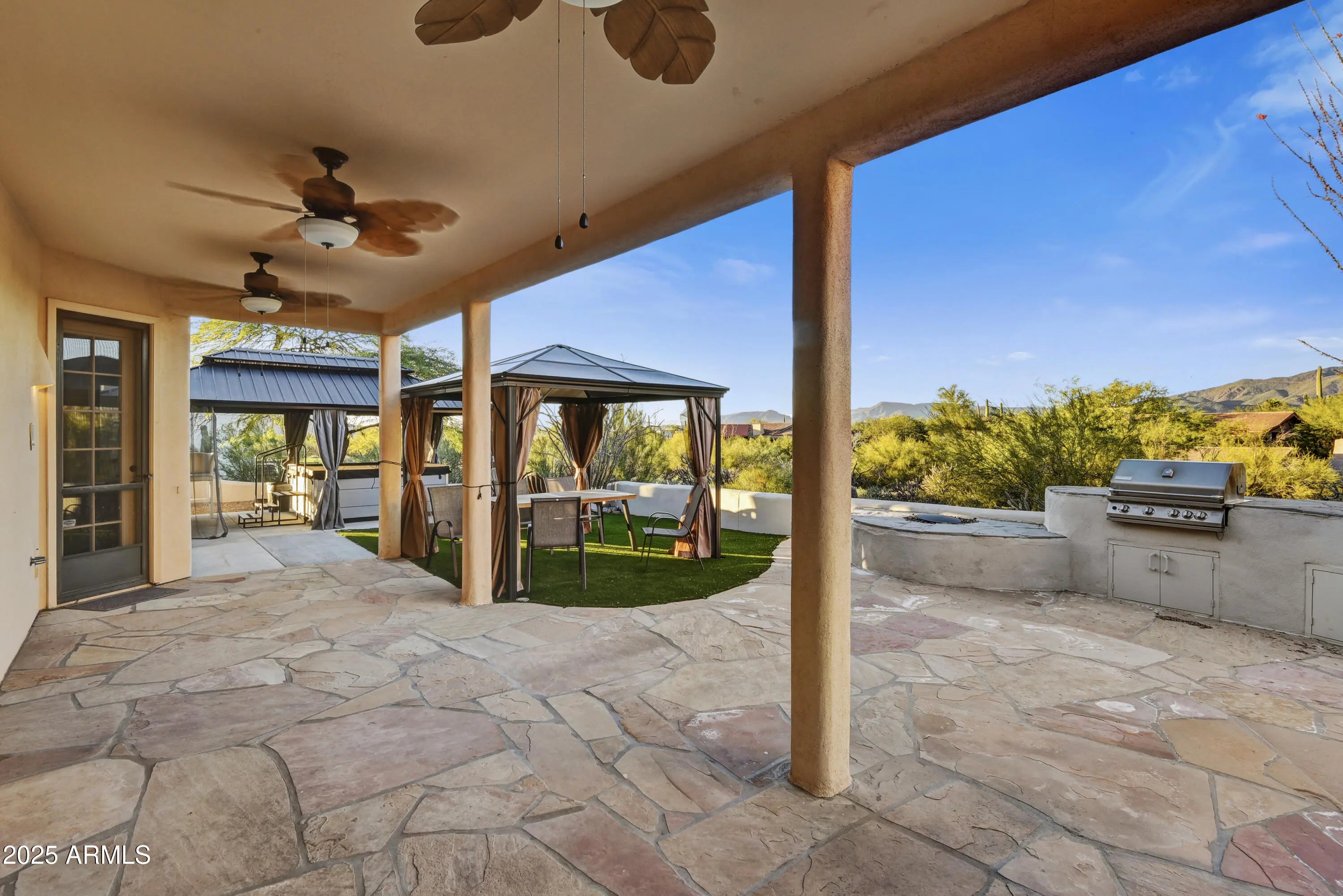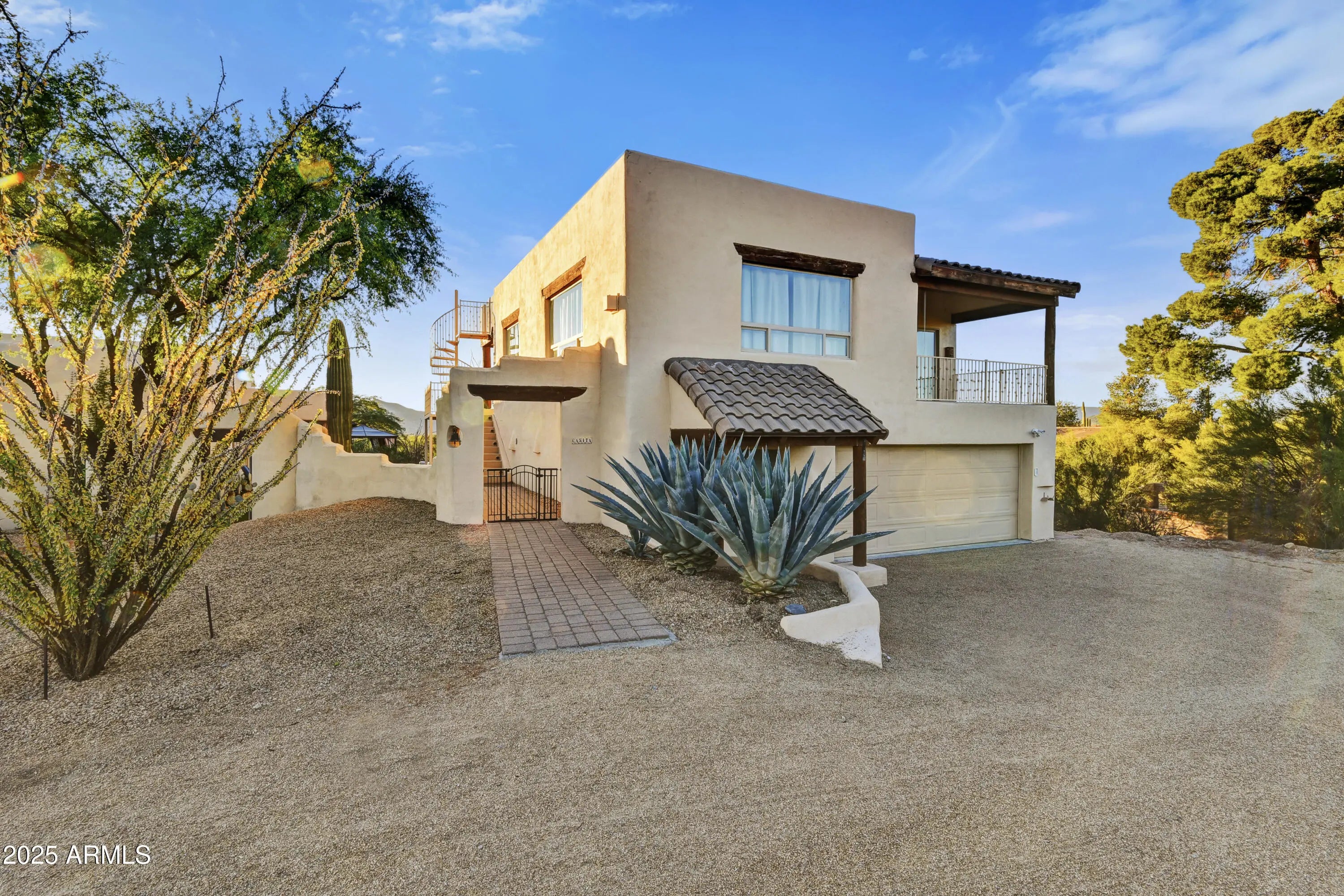 Soak in sweeping 360° panoramic mountain and sunset views from this timeless Carefree territorial estate, set on an acre-plus lot in the heart of the high Sonoran Desert. The property features a rare and highly desirable 1,000 SF one-bdrm, one-bath guest casita complete with a full kitchen, fireplace, and breathtaking views from every angle. The casita sits above an oversized 4car garage & an expansive temp-controlled workshop ideal for collectors or hobbyists. The single-level main residence offers a split floorplan featuring 3 bedrooms + den/4BDR, an updated kitchen, & 2.5 beautifully designed baths. The great room is anchored by a charming corner kiva fireplace, featuring an impressive 150'' projection screen framed by walls of windows inviting the outdoors in. More... The private backyard borders a natural wash and is designed for effortless entertaining with a built-in BBQ, sink, top of the line 8person spa w/UV light & firepit, with ample room to add a custom pool to suit your vision.(See renderings in docs tab). Perfectly positioned for winter living at its finest, this home places you minutes from world-renowned seasonal events including the WM Phoenix Open, Barrett-Jackson Collector Car Auction, the Arabian Horse Show, Scottsdale Art Week, and Carefree's beloved cultural festivals offering a vibrant blend of luxury, recreation, and desert charm.