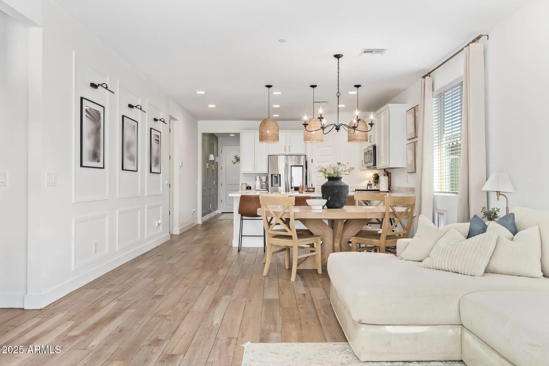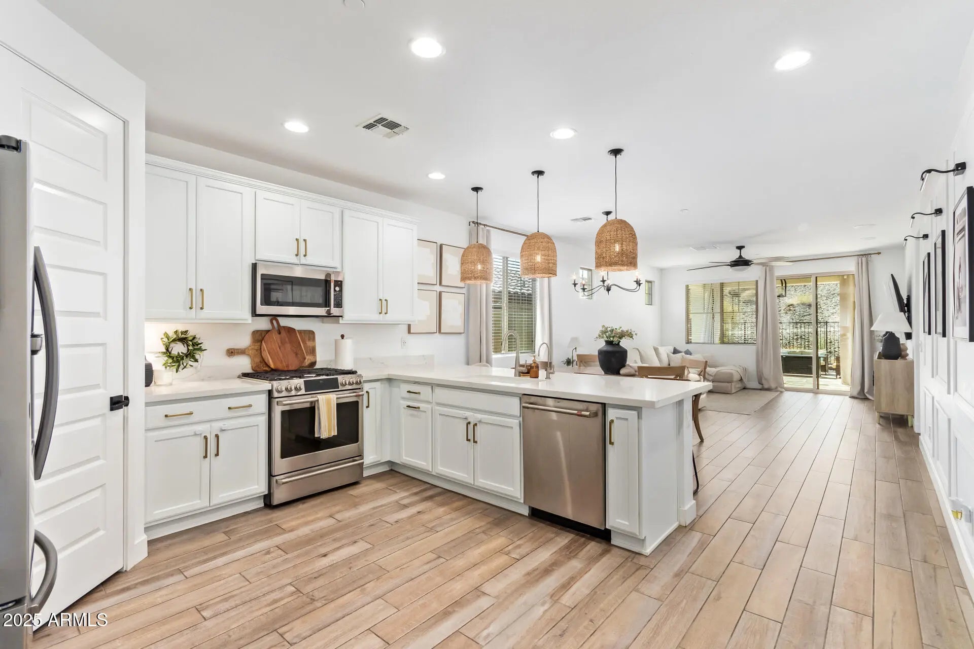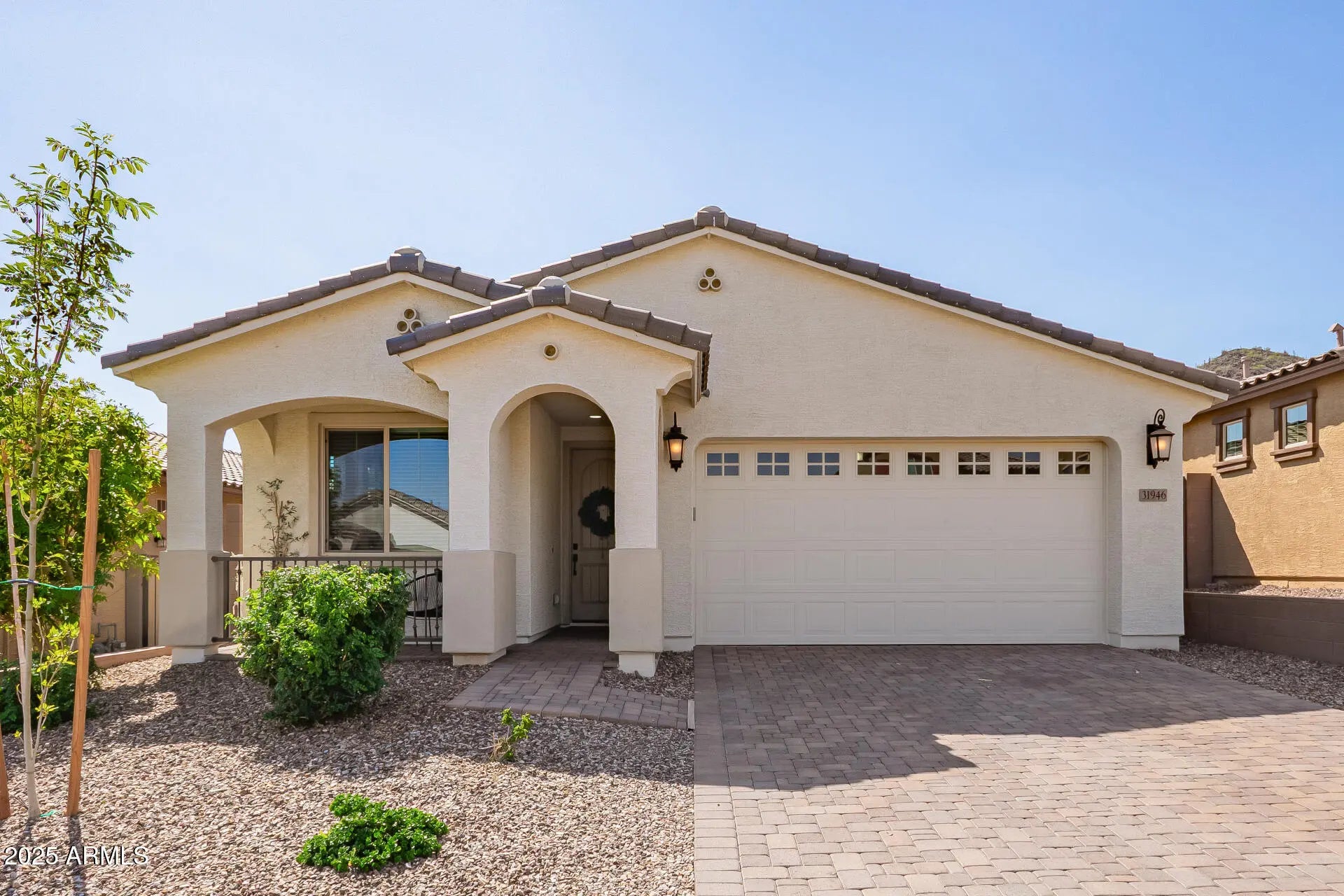 Your dream home awaits! This charming 4-bedroom residence features a 2-car garage, an elegant paver driveway, and a welcoming front porch. Step inside to a versatile living room or den—ideal for both relaxing and working from home. The stunning great room impresses with soaring ceilings, a calming color palette, wood-look flooring, custom blinds, and sliding glass doors that open to the backyard. The gourmet kitchen is designed to inspire, showcasing quartz countertops, crisp white cabinetry with crown molding, pendant and recessed lighting, stainless steel appliances, a pantry, and a peninsula with a breakfast bar. Retreat to the spacious primary suite, complete with plush carpeting, a spa-like ensuite with dual sinks, and a walk-in closet. Outside, enjoy travertine pavers and a cover and a covered patioperfect for outdoor dining and entertaining. Don't miss the opportunity to make this exceptional home yours!