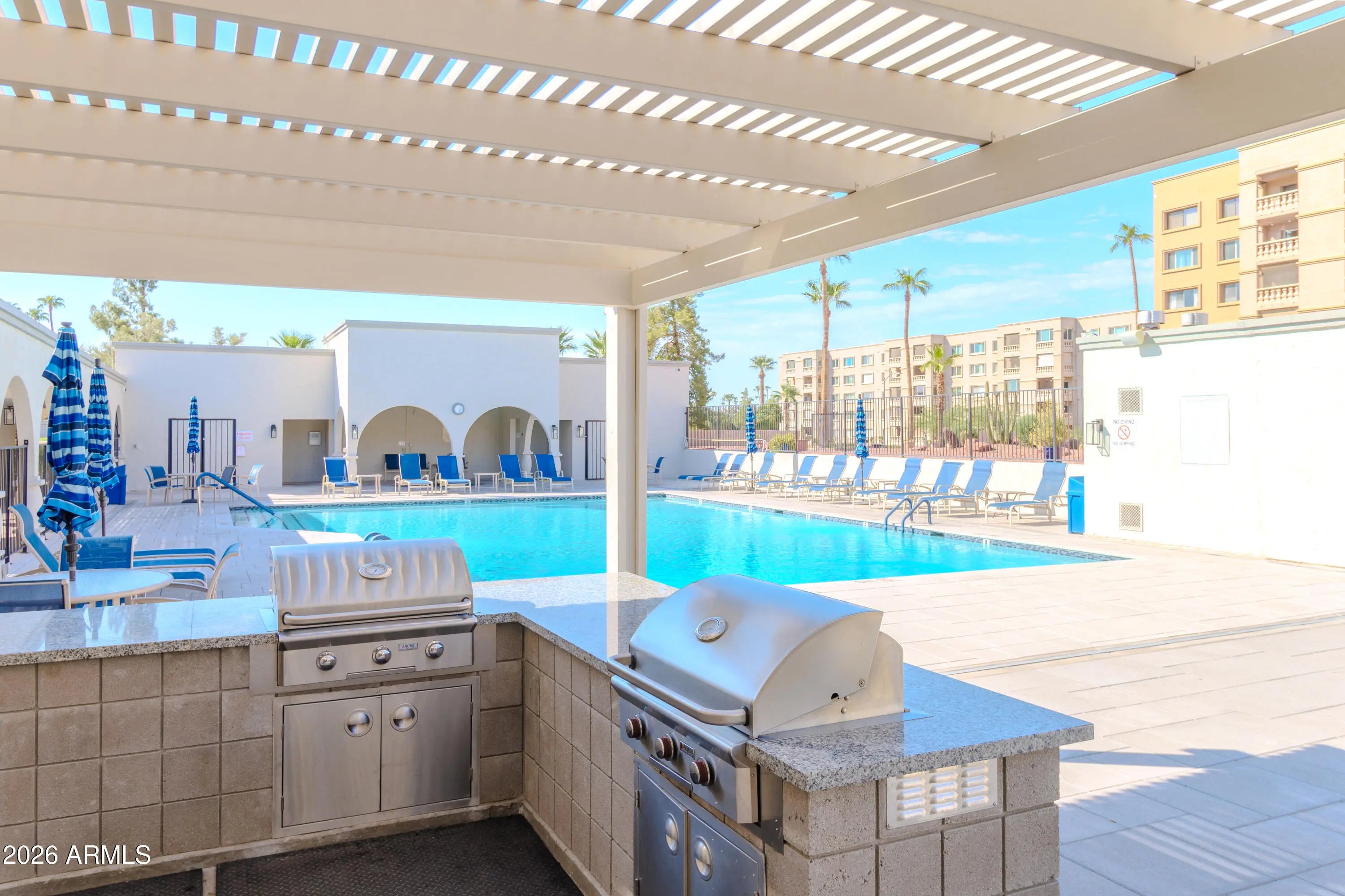 Welcome to this beautiful end-unit residence nestled in a highly desirable Scottsdale community offering resort-style amenities including golf, tennis, sparkling pools, a fitness center, and more. The light-filled, open-concept floor plan is ideal for both everyday living and entertaining. Step out onto your private balcony overlooking the pool—an inviting space to unwind and enjoy the serene views. The kitchen features tile flooring, granite countertops, and a newer sink, blending style and functionality. Additional highlights include an inside laundry room and convenient underground parking. Perfectly located just minutes from downtown Scottsdale, premier shopping and dining, and easy access to the Loop 101, this exceptional home offers the best of Scottsdale living.