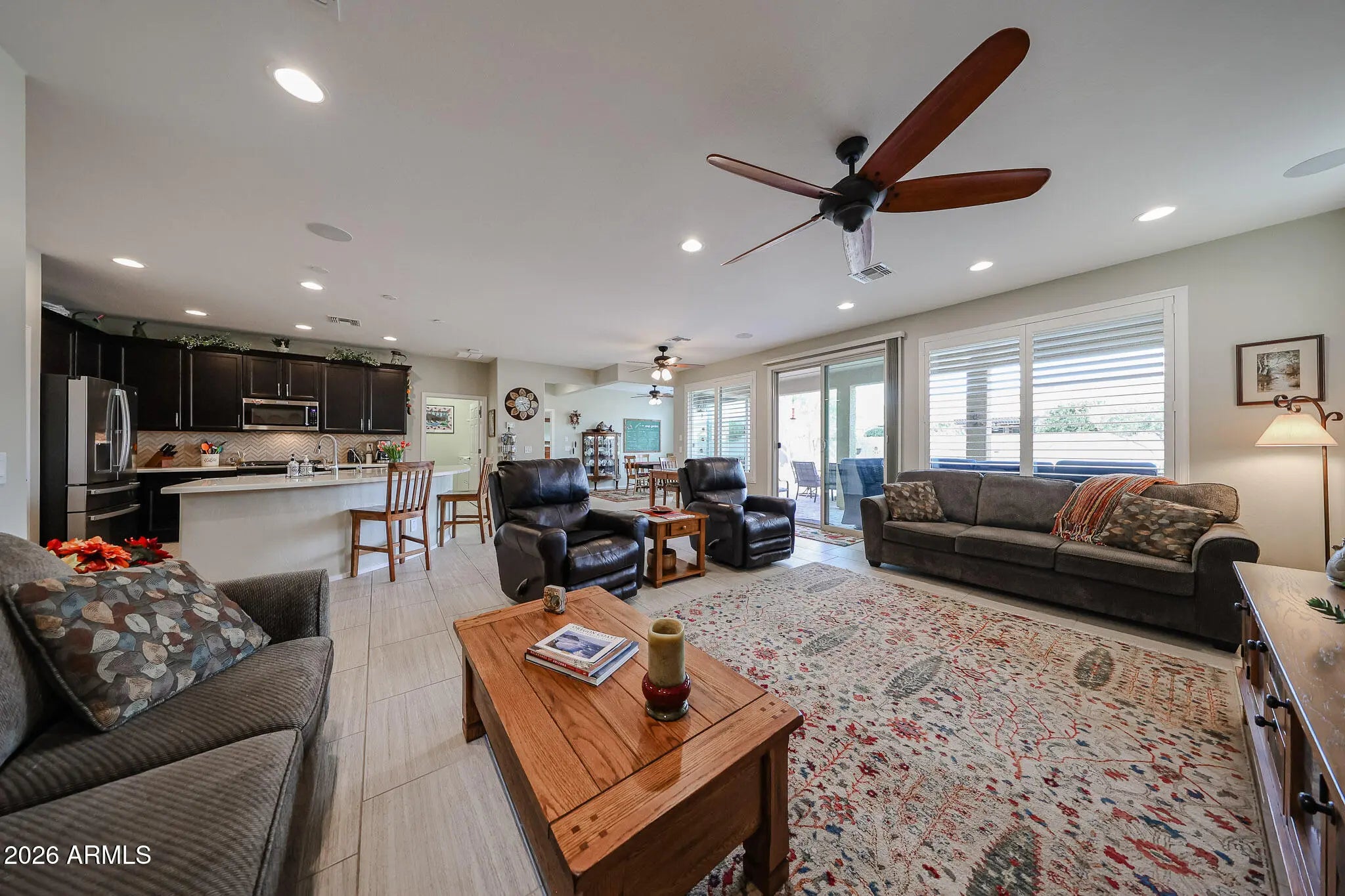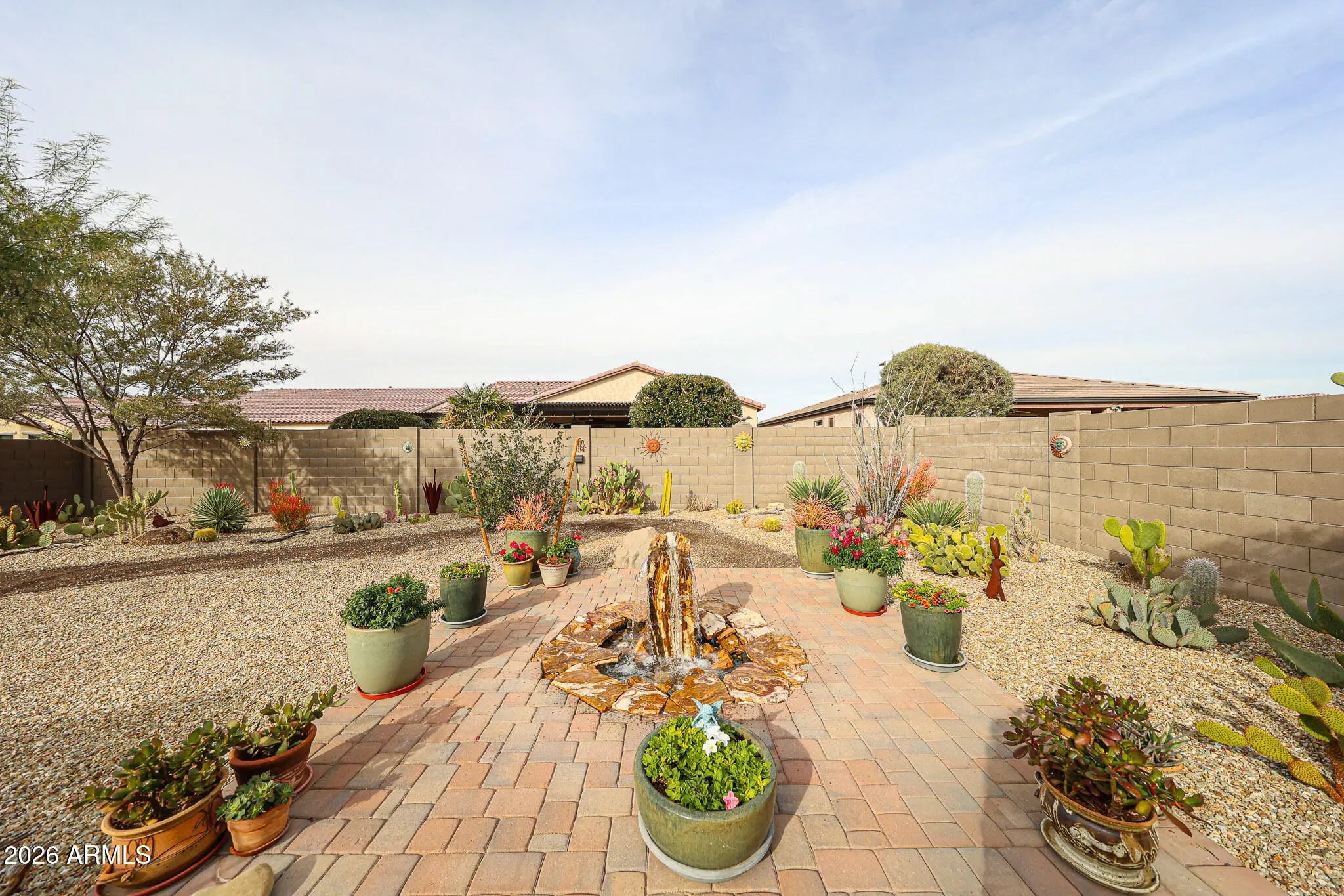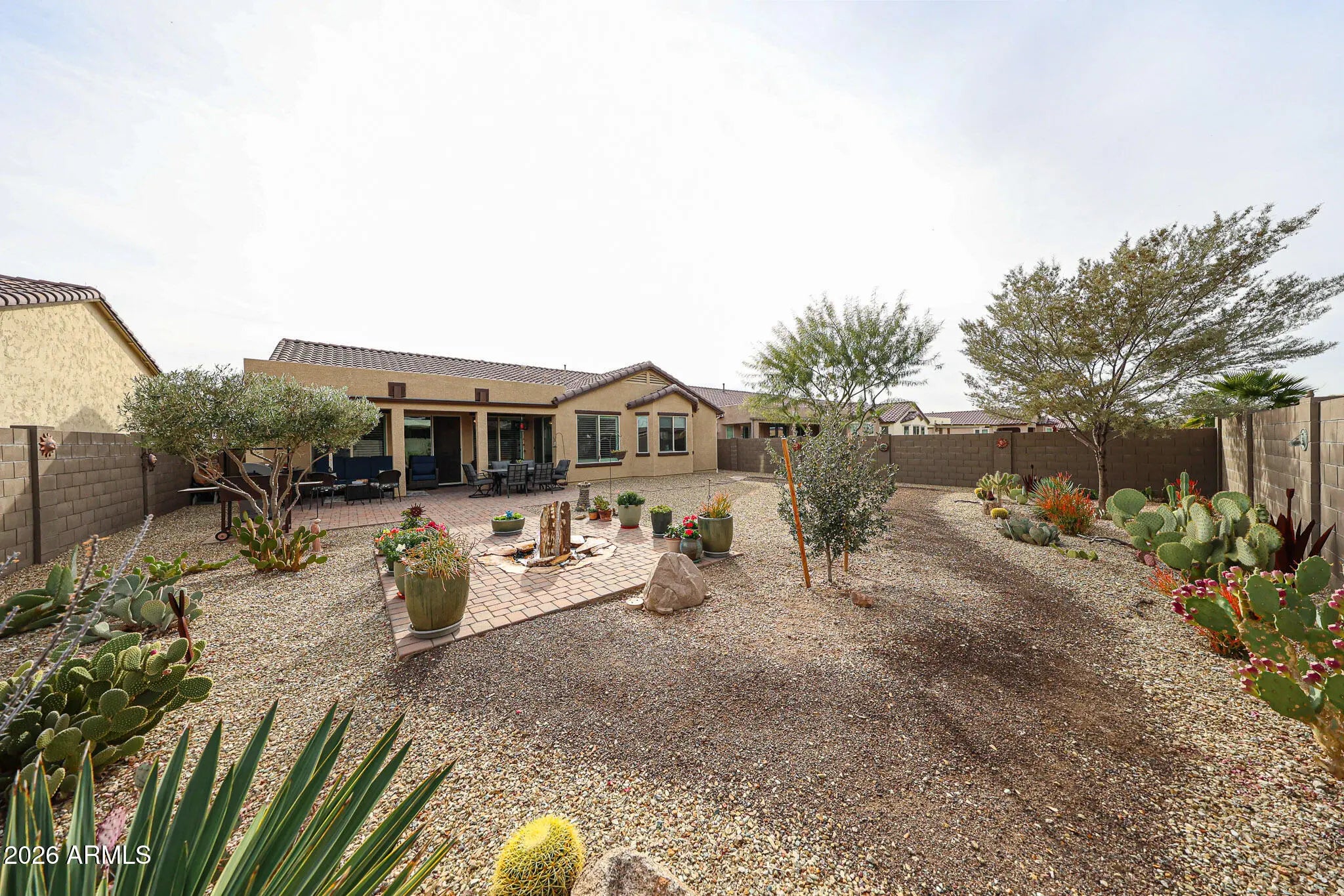 Welcome home to effortless living in this beautifully appointed 2-bedroom, 2-bath Serenade floorplan with a versatile den - perfect for a home office, hobby space, or cozy retreat. Charming curb appeal sets the tone with a paver walkway leading to a covered front porch accented by stacked stone and low-maintenance desert landscaping, inviting you to slow down and enjoy the moment. Inside, the open-concept design is both stylish and functional, featuring tile flooring throughout the main living areas and plantation shutters across most of the home for a timeless, polished look. The den welcomes you with elegant glass double doors, while the spacious guest bedroom offers comfort and privacy for visitors or everyday living. The heart of the home is the light-filled great room - ideal for entertaining or relaxing - anchored by a well-designed kitchen with rich espresso cabinetry, stainless steel appliances, a gas range, quartz countertops, and a chic tile backsplash. A casual dining area sits just off the kitchen, making everyday meals and gatherings feel effortless. The serene primary suite is your personal retreat, complete with a bay window and an ensuite bath featuring dual sinks and a large walk-in shower with a built-in bench. Step outside and enjoy Arizona living at its best. The oversized, fully enclosed backyard offers exceptional privacy and an extended paver patio with a covered seating area and soothing water feature - perfect for morning coffee, sunset dinners, or weekend barbecues with friends. Living in the 55+ CantaMia Community means more than just a beautiful home - it's a lifestyle. CantaMia is a premier 55+ gated community offering resort-style amenities including a grand clubhouse, indoor and outdoor pools, fitness center, pickleball and tennis courts, walking trails, on-site café, art studio, dog parks, and a full calendar of clubs, classes, and social events. Whether you're looking to stay active, connect with neighbors, or simply relax and enjoy the good life, CantaMia delivers it all.