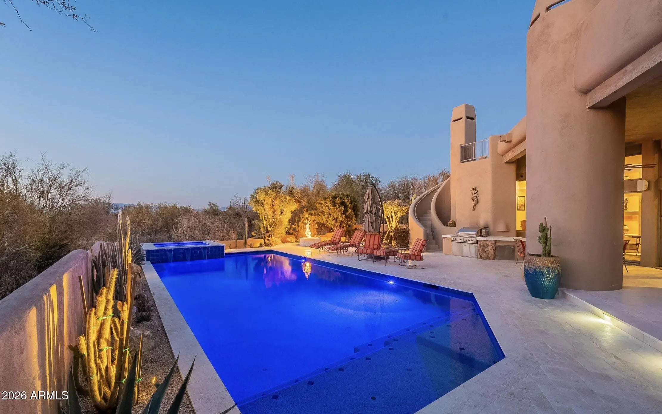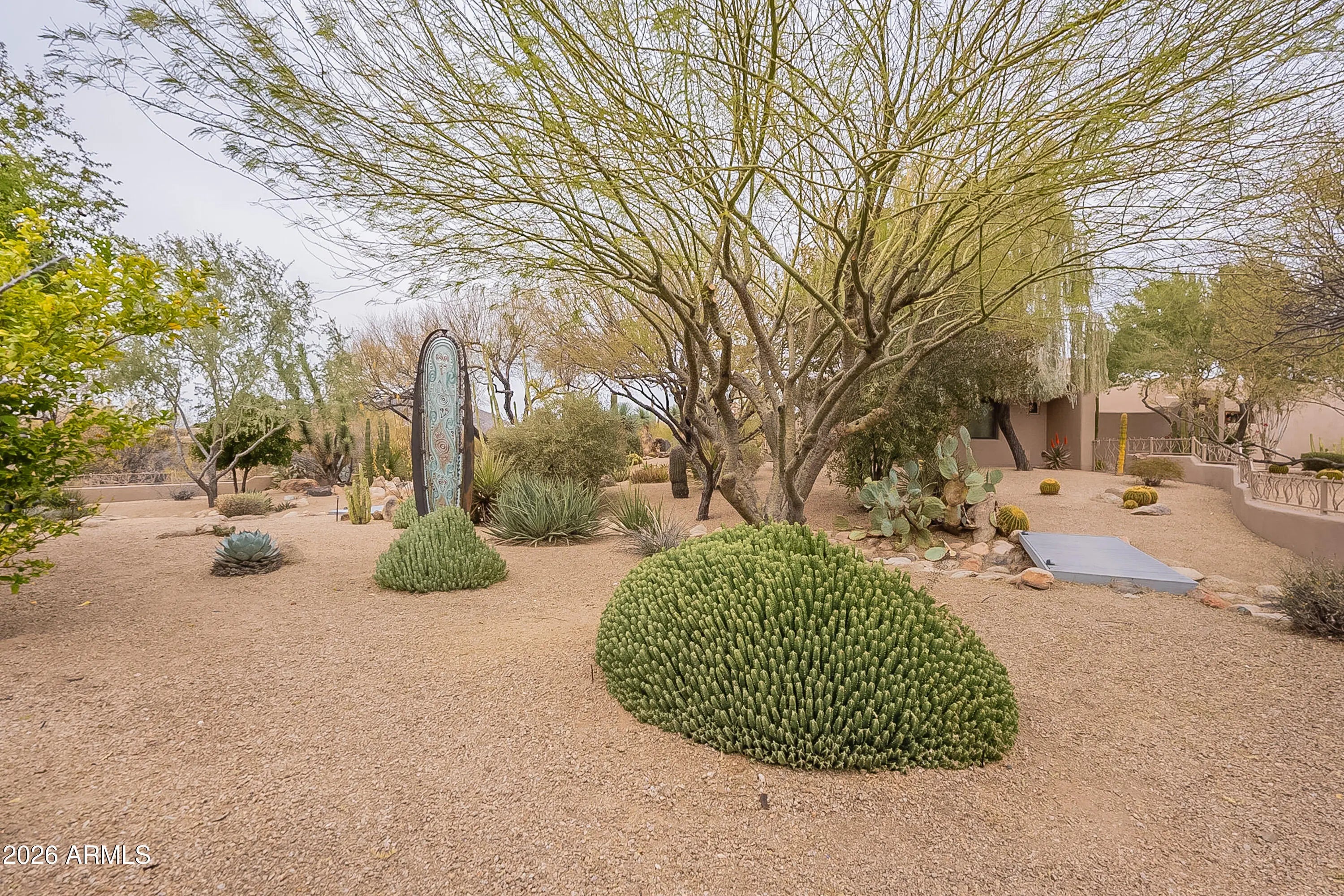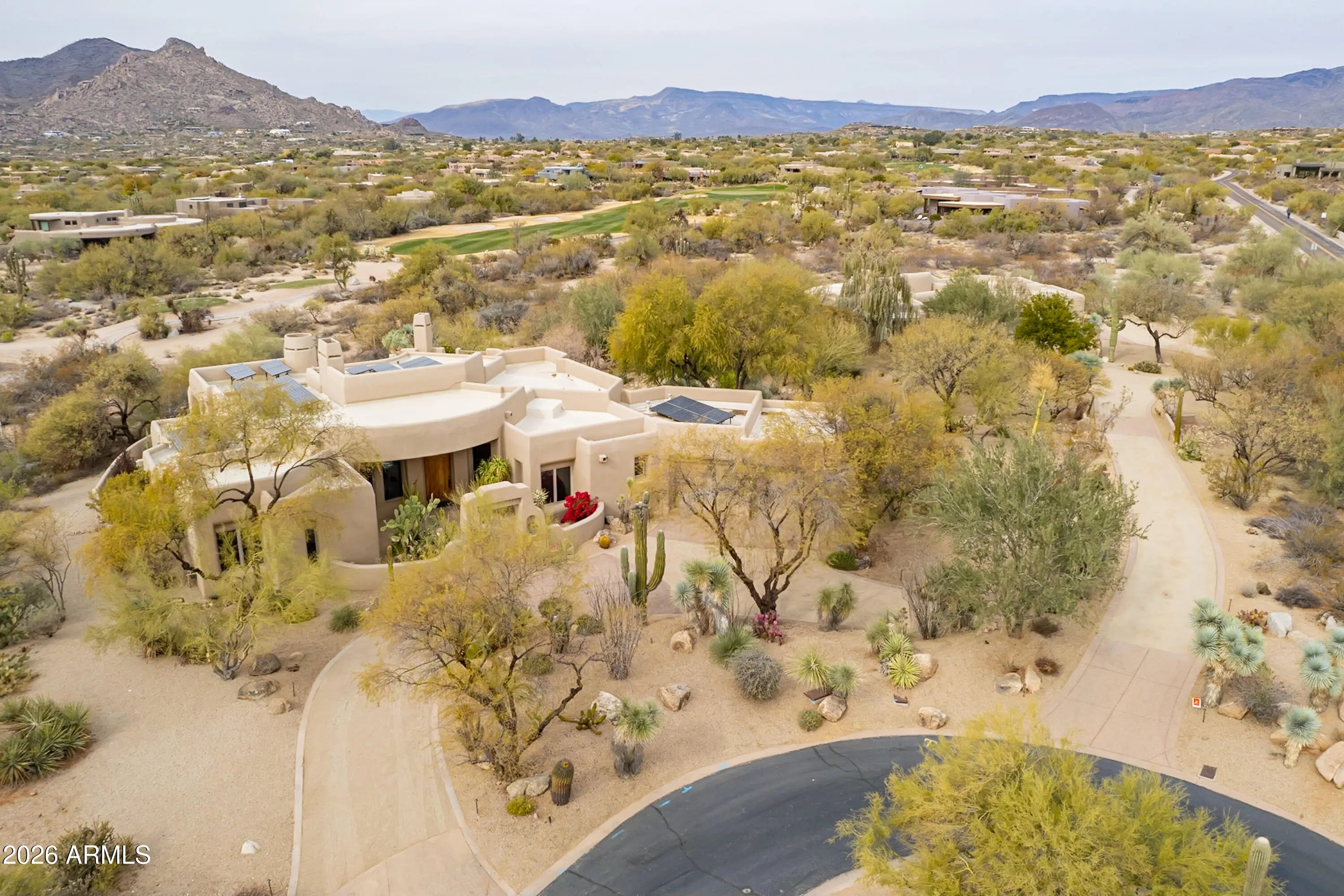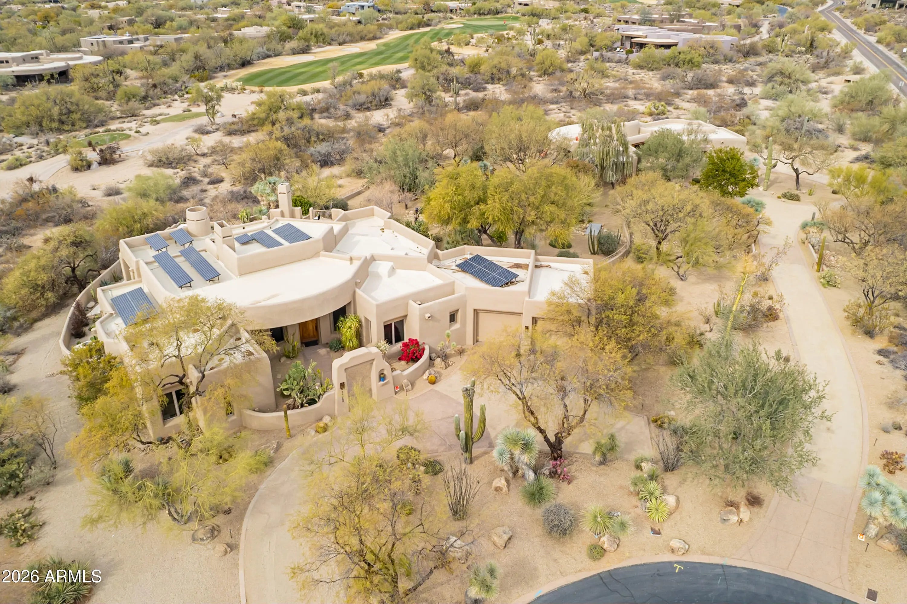 Secluded on approximately two acres with sweeping Black Mountain and golf course views, this extraordinary estate offers rare privacy, architectural character, and refined desert luxury. Elevated roof decks capture panoramic mountain and fairway vistas, creating unforgettable settings for sunrise coffee and sunset entertaining. The main residence showcases artistic flair throughout, featuring three bedrooms plus a dedicated office, a serene primary suite with dual walk-in closets and private patio access, and a dramatic great room anchored by a fireplace and striking architectural details. The well-appointed kitchen is designed for both daily living and entertaining, complete with premium appliances and a wine refrigerator. The grounds unfold like a private desert botanical garden, with meandering paths, specimen-quality cacti, and curated native landscaping that create a tranquil, resort-like atmosphere. Resort-style outdoor living spans multiple entertaining spaces surrounding the newly remodeled pool and spa, finished with all-new travertine tile. The main home also offers a two-car garage plus a dedicated golf cart bay. A winding garden path leads to a private guest sanctuary designed as a true retreat. This separate residence features floor-to-ceiling windows, polished concrete floors, an oversized open fireplace, kitchenette, two en-suite bedrooms, and an expansive shaded veranda with custom tongue-and-groove woodwork. Guests enjoy a private entrance, driveway, and their own one-car garageideal for extended stays, multigenerational living, or executive accommodations. A rare offering combining acreage, roof-deck views, privacy, and design-forward living in one of North Scottsdale's most coveted desert golf settings.