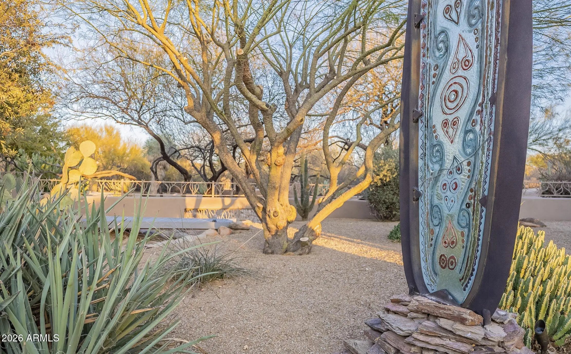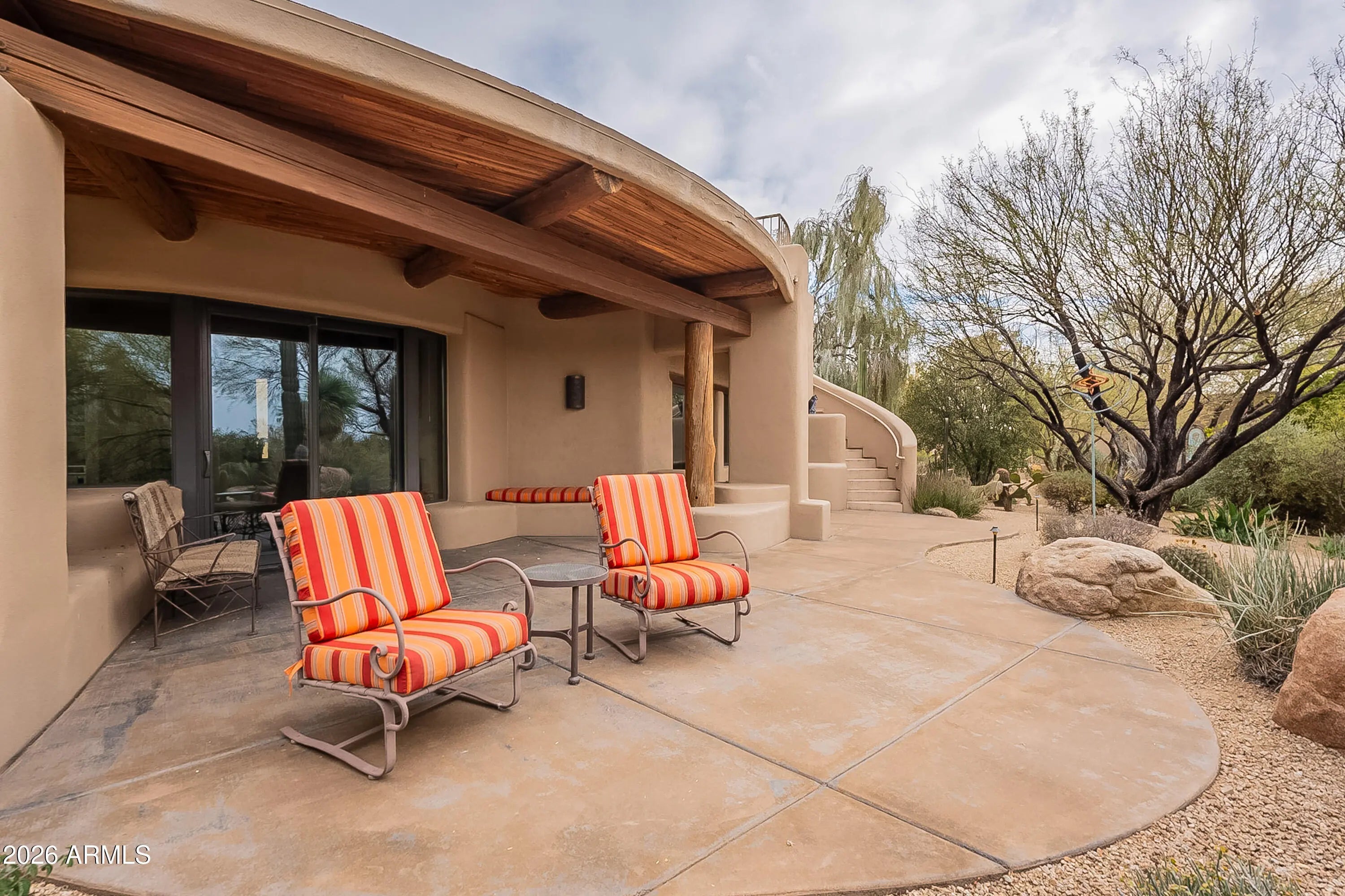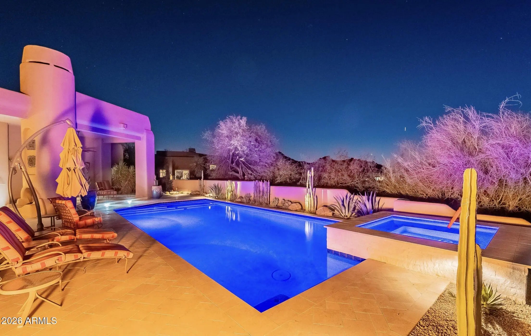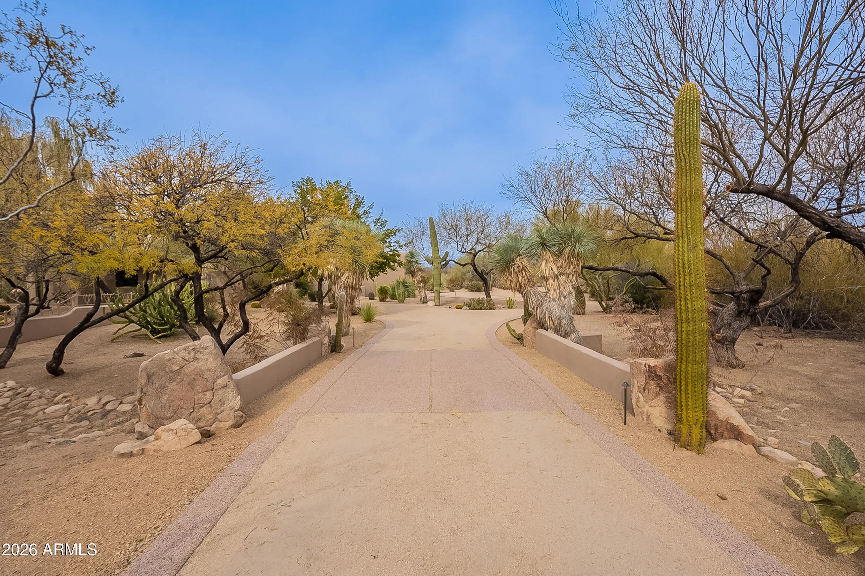 Secluded on approximately two acres with sweeping Black Mountain and golf course views, this extraordinary estate offers rare privacy, architectural character, and refined desert luxury. Elevated roof decks capture panoramic mountain and fairway vistas, creating unforgettable settings for sunrise coffee and sunset entertaining. The main residence showcases artistic flair throughout, featuring three bedrooms plus a dedicated office, a serene primary suite with dual walk-in closets and private patio access, and a dramatic great room anchored by a fireplace and striking architectural details. The well-appointed kitchen is designed for both daily living and entertaining, complete with premium appliances and a wine refrigerator. The grounds unfold like a private desert botanical garden, with meandering paths, specimen-quality cacti, and curated native landscaping that create a tranquil, resort-like atmosphere. Resort-style outdoor living spans multiple entertaining spaces surrounding the newly remodeled pool and spa, finished with all-new travertine tile. The main home also offers a two-car garage plus a dedicated golf cart bay. A winding garden path leads to a private guest sanctuary designed as a true retreat. This separate residence features floor-to-ceiling windows, polished concrete floors, an oversized open fireplace, kitchenette, two en-suite bedrooms, and an expansive shaded veranda with custom tongue-and-groove woodwork. Guests enjoy a private entrance, driveway, and their own one-car garageideal for extended stays, multigenerational living, or executive accommodations. A rare offering combining acreage, roof-deck views, privacy, and design-forward living in one of North Scottsdale's most coveted desert golf settings.