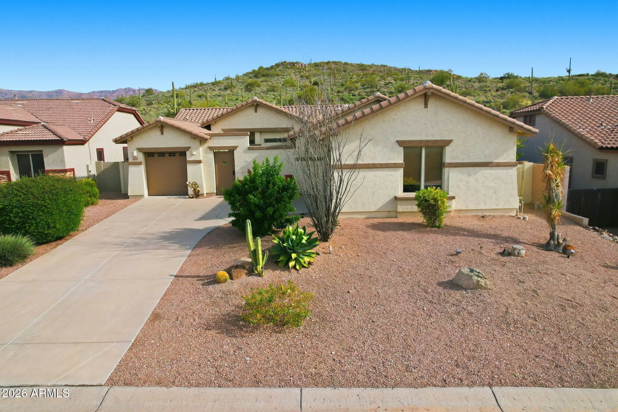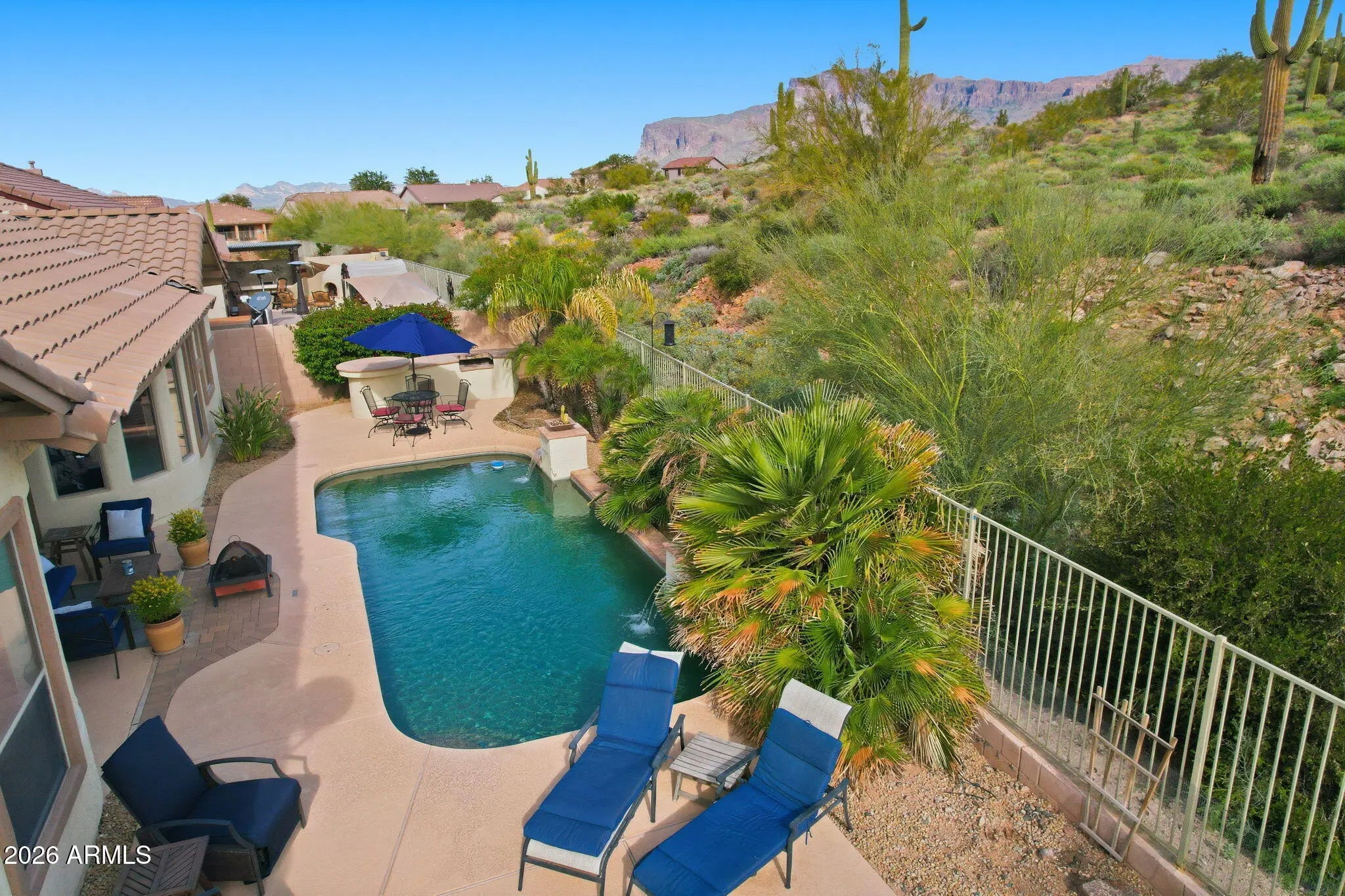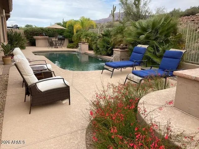 STUNNING Rear Mountain Views Inside & Out From Kitchen, Great Room & Master Suite! Backyard Oasis w/Heated Pool & Spa Perfectly Complemented By Open Desert & The Superstitions Behind! Front Courtyard Features Tranquil Fountain Perfect For Peaceful Mornings. Home Meticulously Maintained & Beautifully Upgraded With Gorgeous Travertine Floors, Designer Paint, Updated Appliances Incl Newer Fridge, Range, Softener & Water Heater, Upgraded Fans, Fixtures & Hardware T/O, New Pool Filter, Pump and Heater & So Much More! Newly Painted Outside in 2025, This Warm, Tranquil & Inviting Home Captures You From The Moment You Enter The Space!