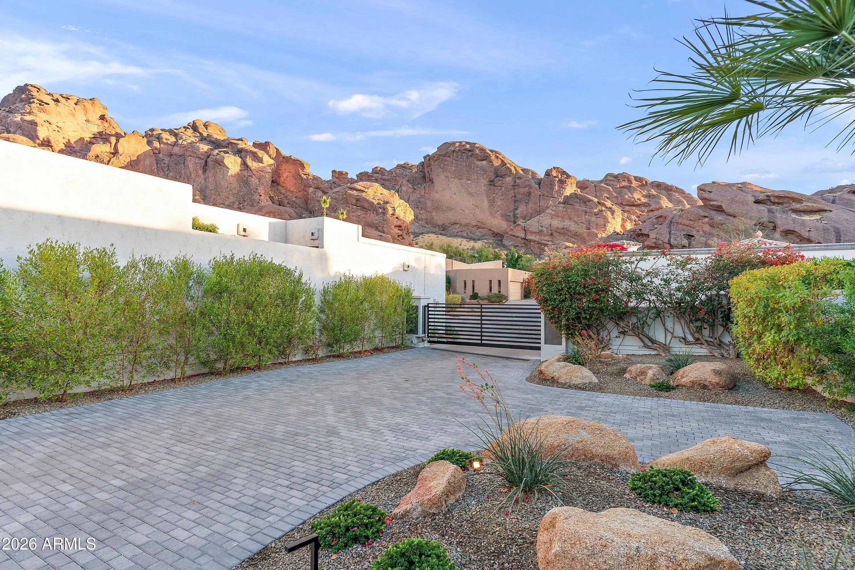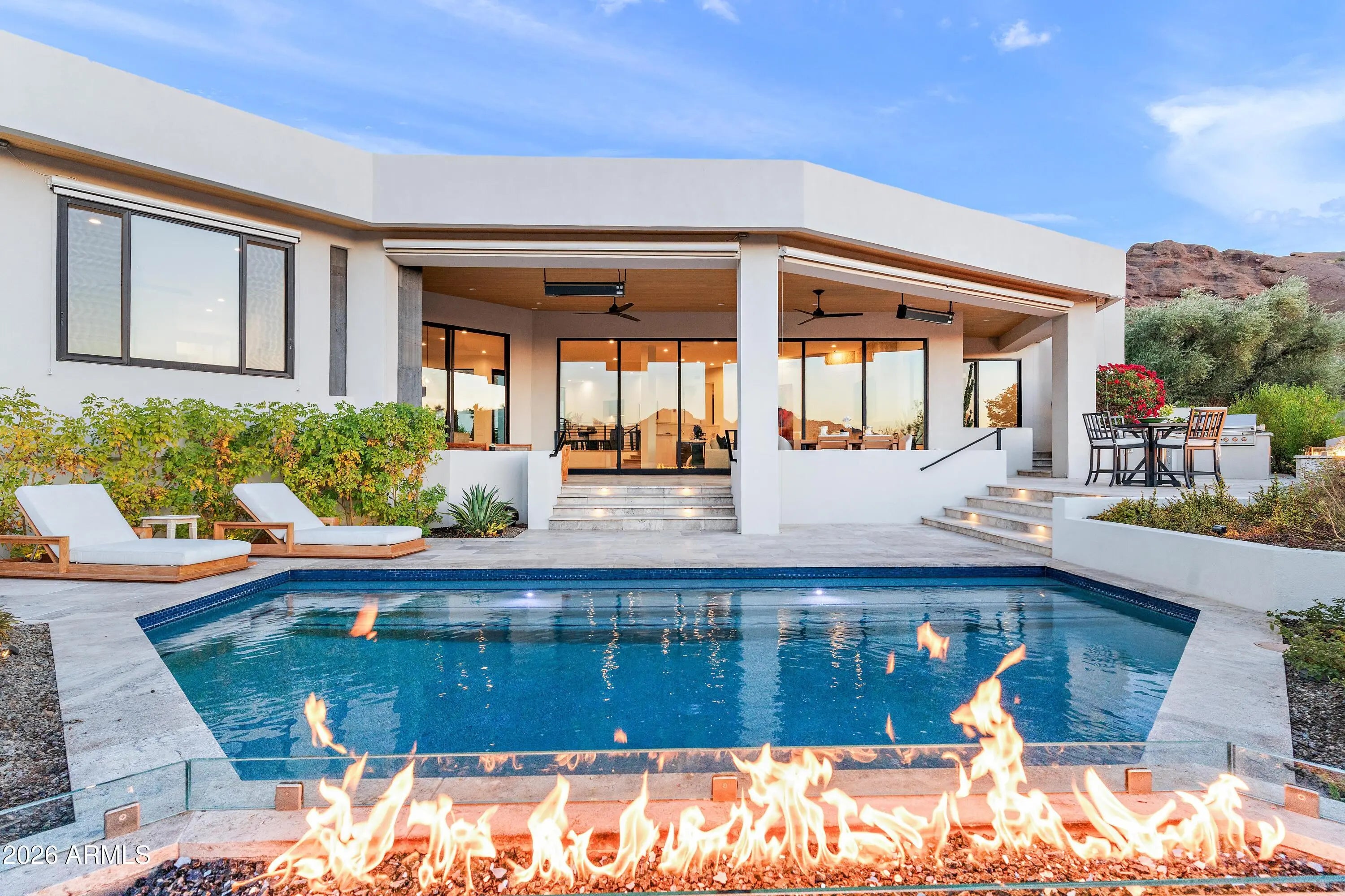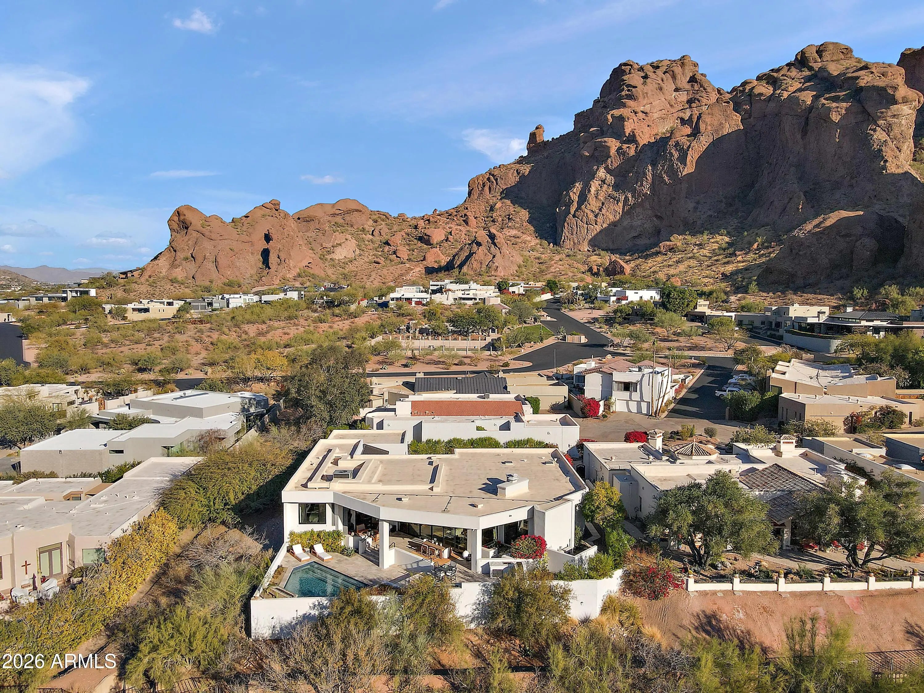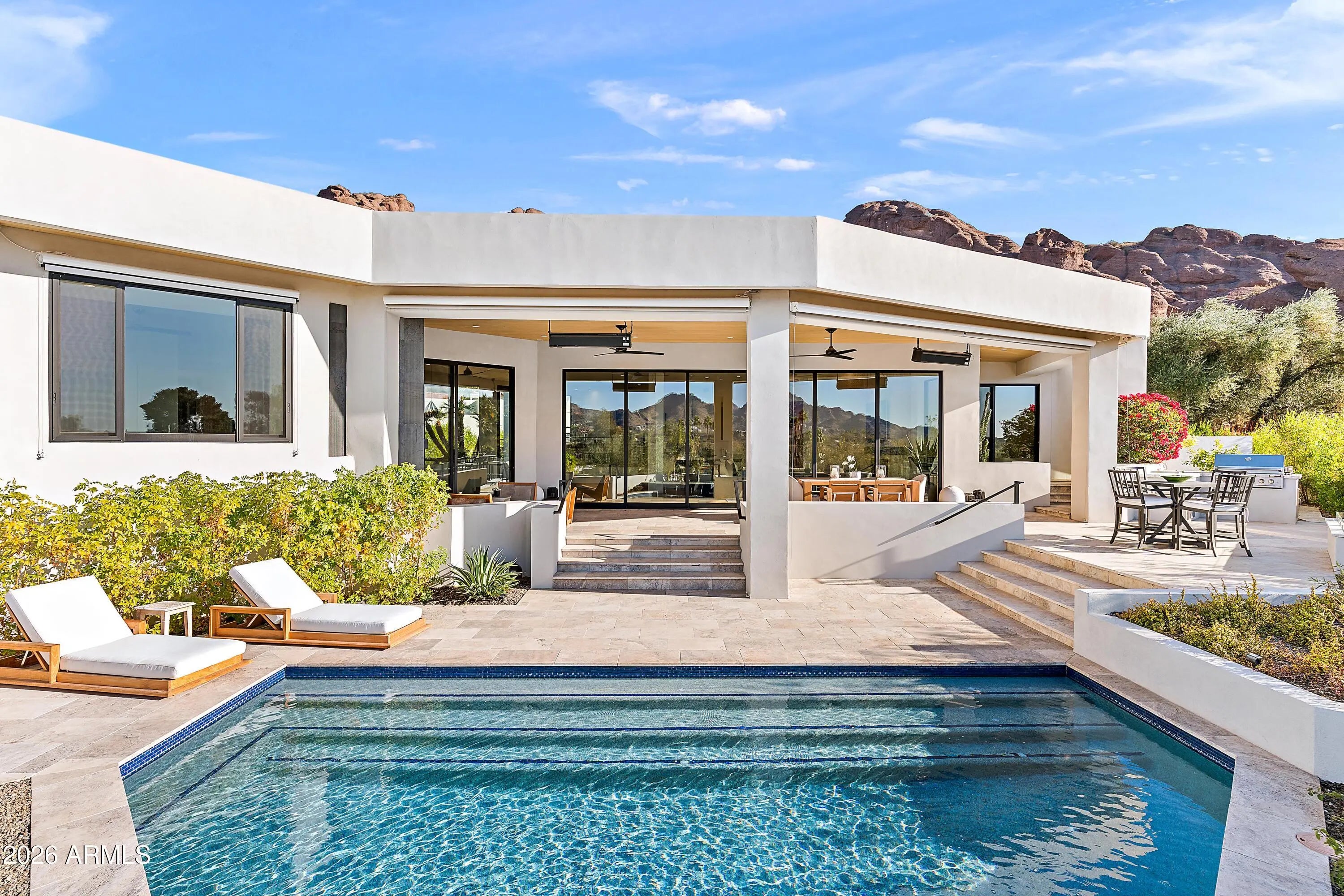 Introducing an unrivaled contemporary masterpiece by premier builder Bedbrock Development, meticulously reimagined from the ground up in 2022 with the finest luxury finishes and fixtures. This exclusive residence resides within the 24‑hour guard gated enclave of Echo Canyon, perched on a truly private 10,650‑squarefoot lot that backs directly onto pristine Natural Area Open Space (NAOS), guaranteeing unparalleled vistas and seclusion. From every room, sweeping mountain panoramas unfold, capturing Camelback's iconic Praying Monk, the serenity of Paradise Valley, the rugged silhouette of Mummy Mountain, Carefree's Black Mountain, the striking profile of Piestewa Peak, and, on clear days, the distant White Tank Mountains. A private oasis awaits outdoors, featuring a heated resort style pool, waterfalls, ambient lighting, and an expansive entertainment patio designed for both relaxation and lively gatherings. 5724 North Echo Canyon Drive stands alone as the sole gated home with its own private driveway, high-profile garage and storage space, dedicated guest parking for 7 vehicles, and a generous front yard, enhancing privacy while maintaining the community's elegant aesthetic. The resort style pool and shaded patio, built-in bbq kitchen set against the open NAOS backdrop, deliver an elevated living experience framed by expansive mountain scenery. This distinguished sanctuary is a must see, offering an exceptional blend of luxury, privacy, and natural beauty. Echo Canyon Private Residences comprise only 83 select lots within a professionally managed, guard gated community, offering resort style amenities such as tennis courts, illuminated nature trails, biking and walking paths, a heated pool/spa, and a soon to be extensively remodeled clubhouse and common area. Residents enjoy a secure, friendly and serene lifestyle of inspirational views and wonderment.