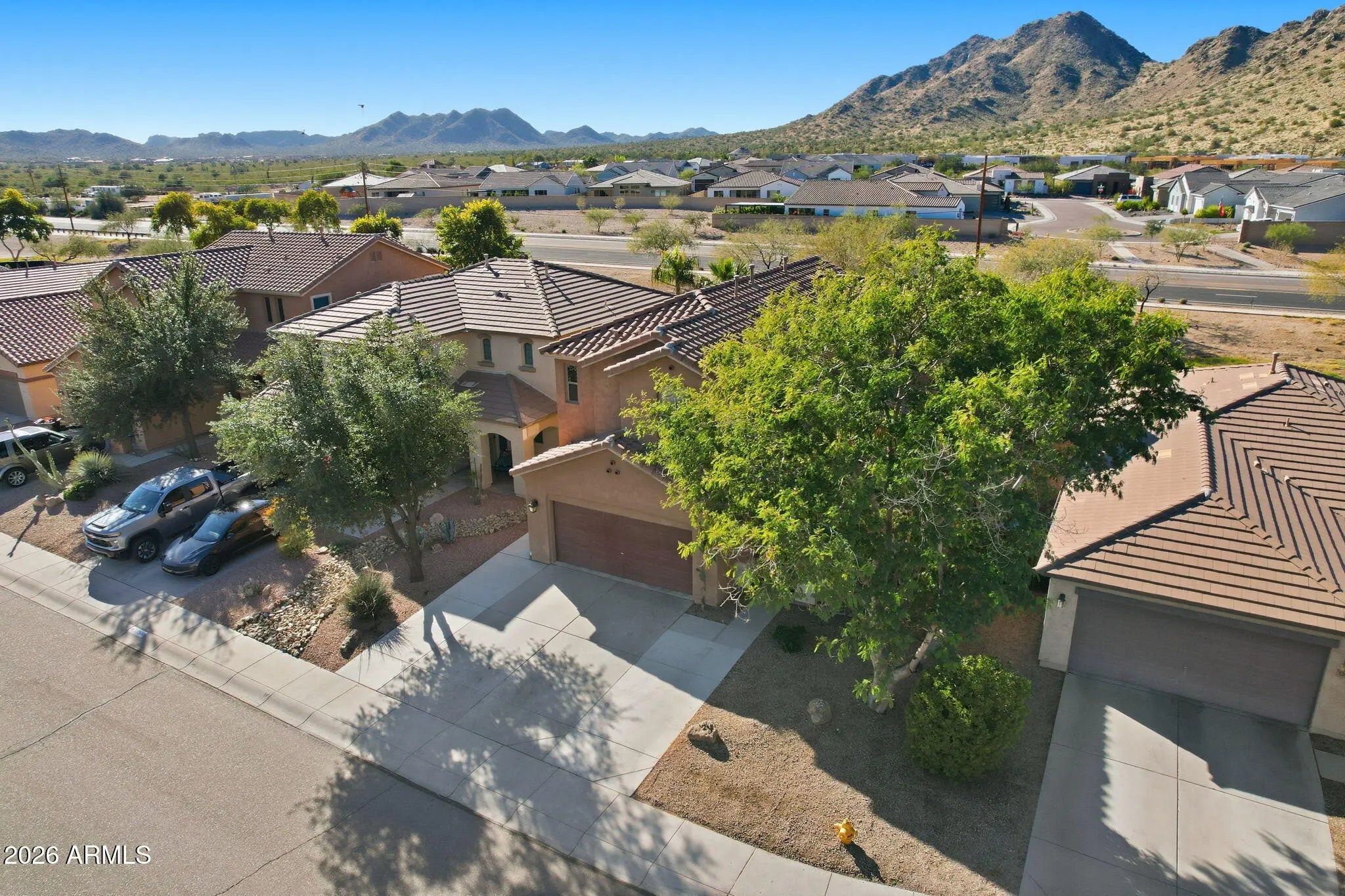 Enjoy San Tan Mountain views the moment you arrive at this well-designed San Tan Valley home. An extended driveway provides extra parking, and mature trees frame a welcoming front patio. Inside, the layout offers two living areas, a spacious kitchen with island and pantry, plus a downstairs den and half bath. All bedrooms are upstairs, including a large primary suite with dual vanities, a soaking tub, separate shower, and walk-in closet. Secondary bedrooms share a dual-sink shared bath, and the upstairs laundry adds everyday convenience. The backyard features a covered patio, extended concrete, artificial turf, and space for a gazebo-perfect for relaxing and enjoying sunset mountain views. Located minutes from San Tan Mountain Regional Park, with access to a resort-style community offering a pool, fitness center, walking paths, playgrounds, and sports courts.