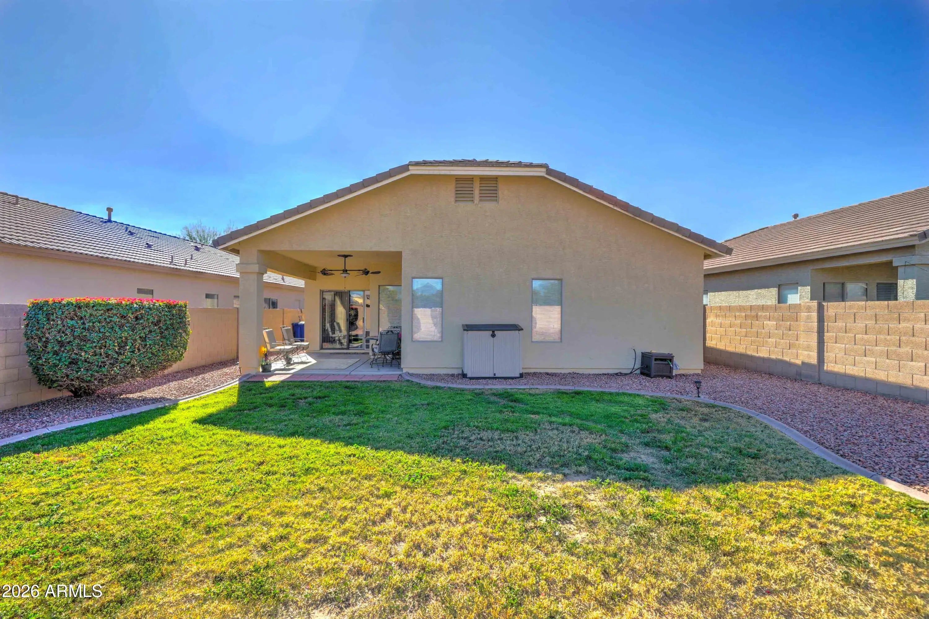 Welcome Home! This charming 3 bedroom, 2 bath home features a large great room floorplan, wonderful light & bright kitchen with breakfast bar, beautiful honey oak cabinets, plenty of counter space, chefs style gas range, built in microwave and nice pantry! You'll love the entertainment shelving, 9ft ceilings for natural light, neutral paint & ceiling fans in all rooms. Spacious master bedroom with dual sinks & walk-in closet. Split floorplan with guest bedrooms and full bathroom. Awesome big backyard, green grass, mature landscaping, large covered patio for relaxing & BBQ's and no properties behind because home backs to Hohokam Multi-Use Biking & Walking Trail! Almost new 2 year old HVAC unit, landscaping on drip system, inside laundry room, close to Wal-Mart & restaurants! HURRY!