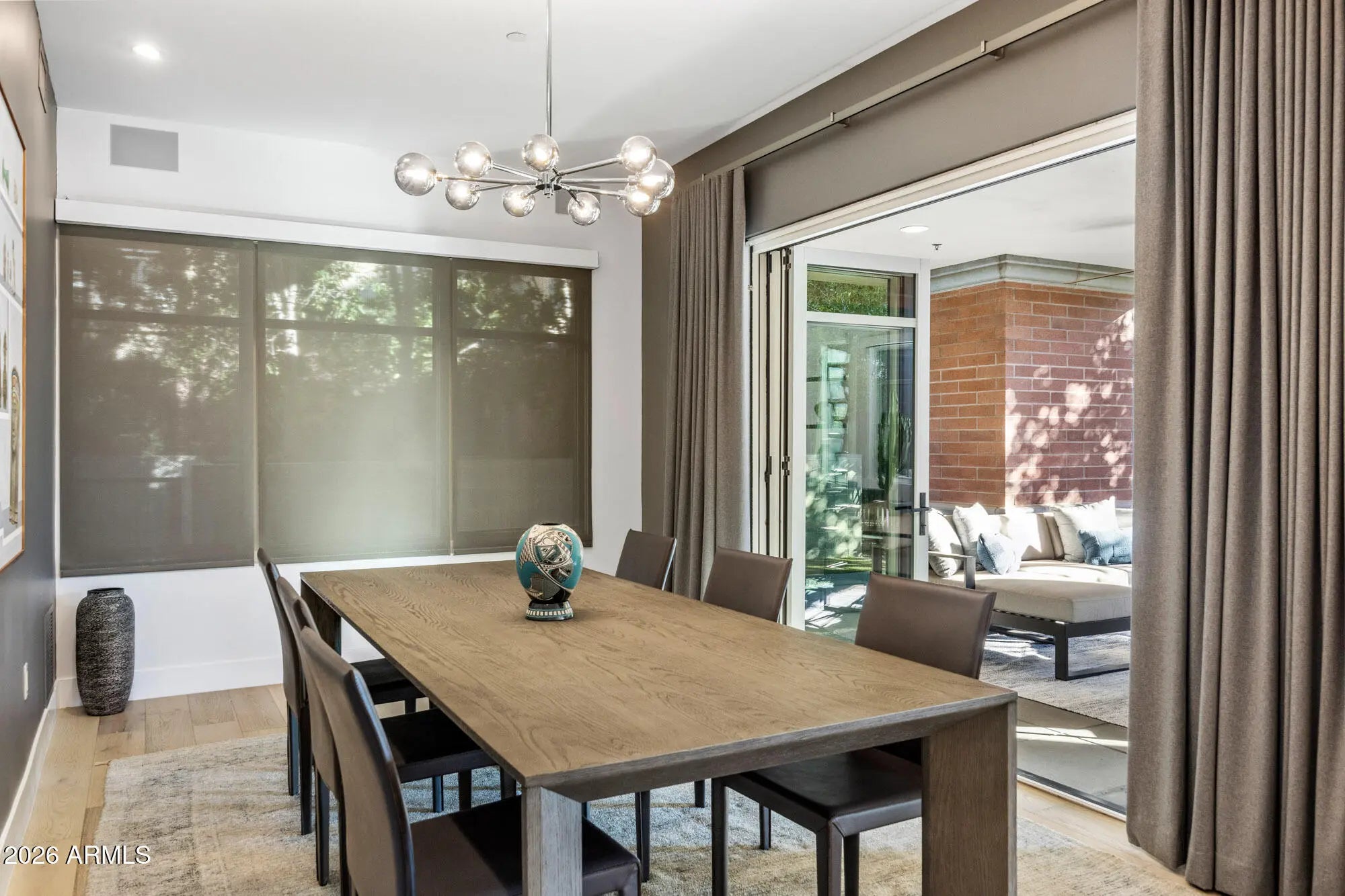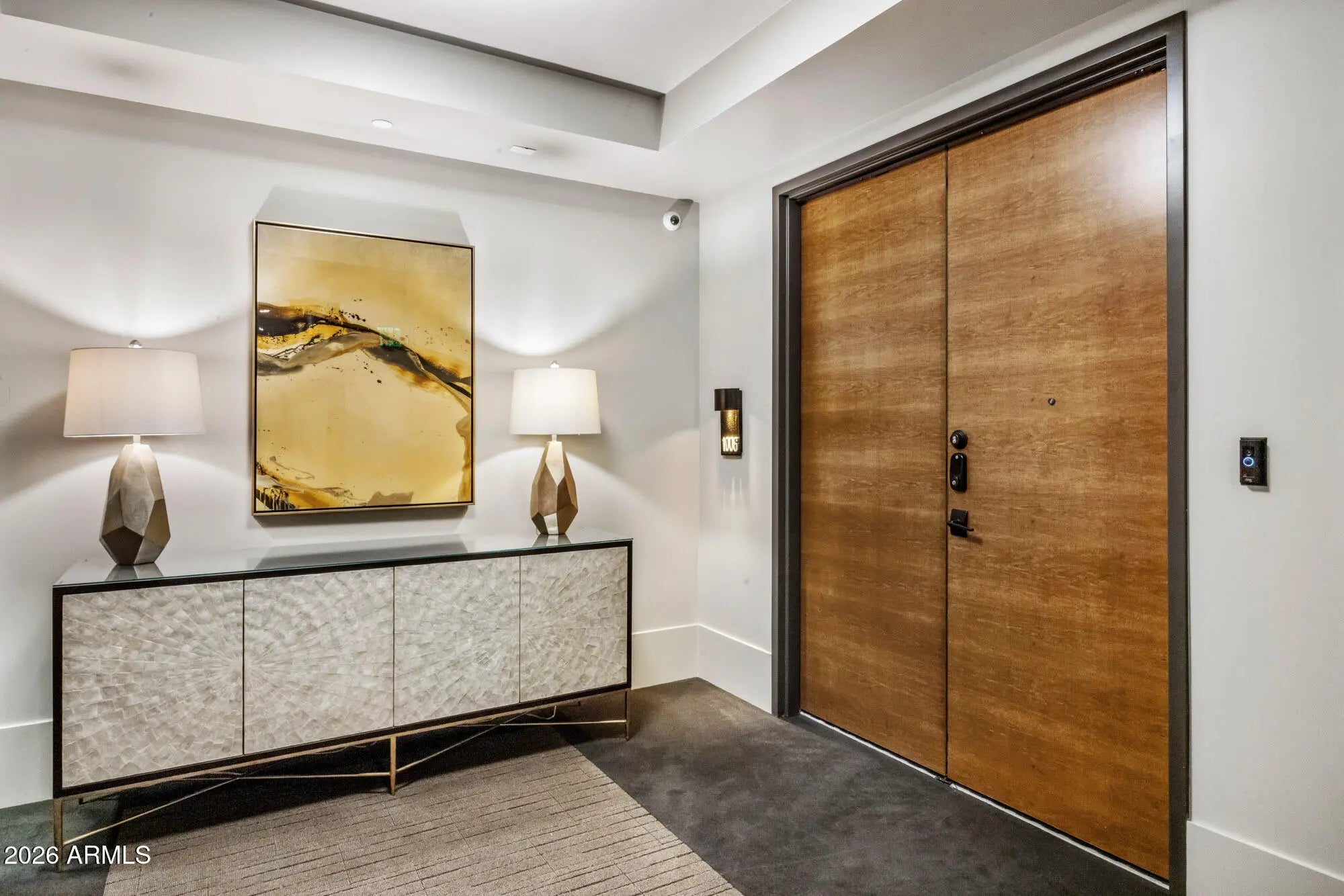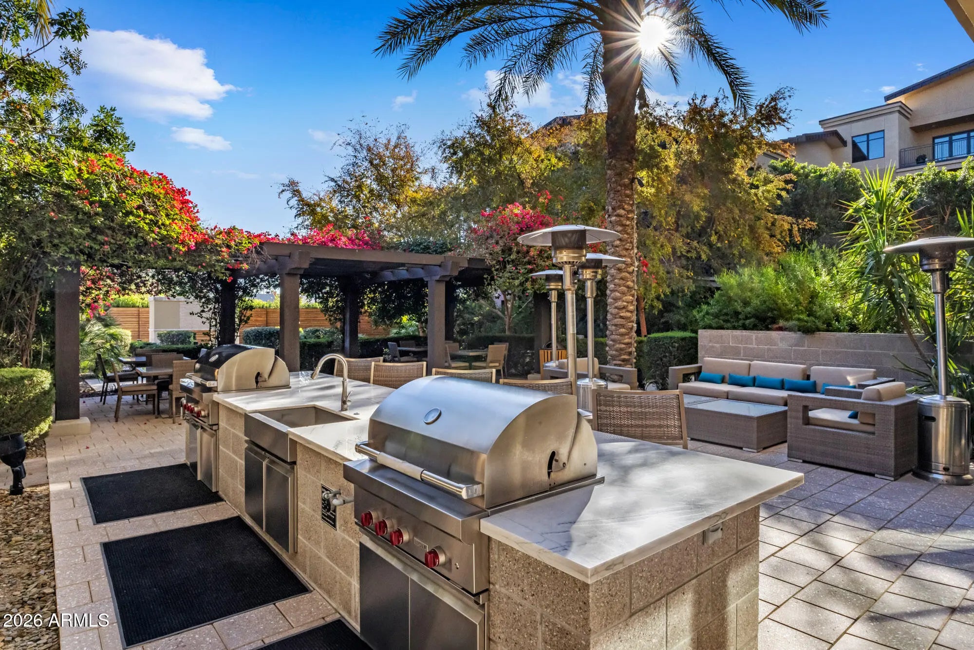 Luxury Living awaits at the exclusive Enclave at Borgata community, perfectly located in walking distance of the best Paradise Valley offers, and complemented by residents-only, resort-style amenities including a fitness center, pool, spa and dog park. Designed for an elevated lock-and-leave lifestyle with true indoor-outdoor ease, this stunning contemporary ground-floor residence offers an expansive open layout with premium finishes throughout. Bright, open-concept living is defined by a sophisticated neutral palette featuring wide-plank wood flooring and designer lighting. The chef's kitchen anchors the home with a dramatic statement backsplash, generous island seating, sleek cabinetry, 90-bottle wine chiller and premium Wolf & SubZero stainless appliances - perfect for effortless entertaining that flows from kitchen to dining to living. Walls of glass open to an expansive covered patio, complete with ceiling fan, lounge seating and a modern fire feature, all wrapped by a serene fenced yard that feels like a private courtyard. Thoughtful upgrades include a Creston smart-home system, enhanced soundproofing, custom closets and 4-person custom cedar sauna. Complete the experience with a private enclosed 4-car garage with Tesla charger, and enjoy convenient luxury living done right.
