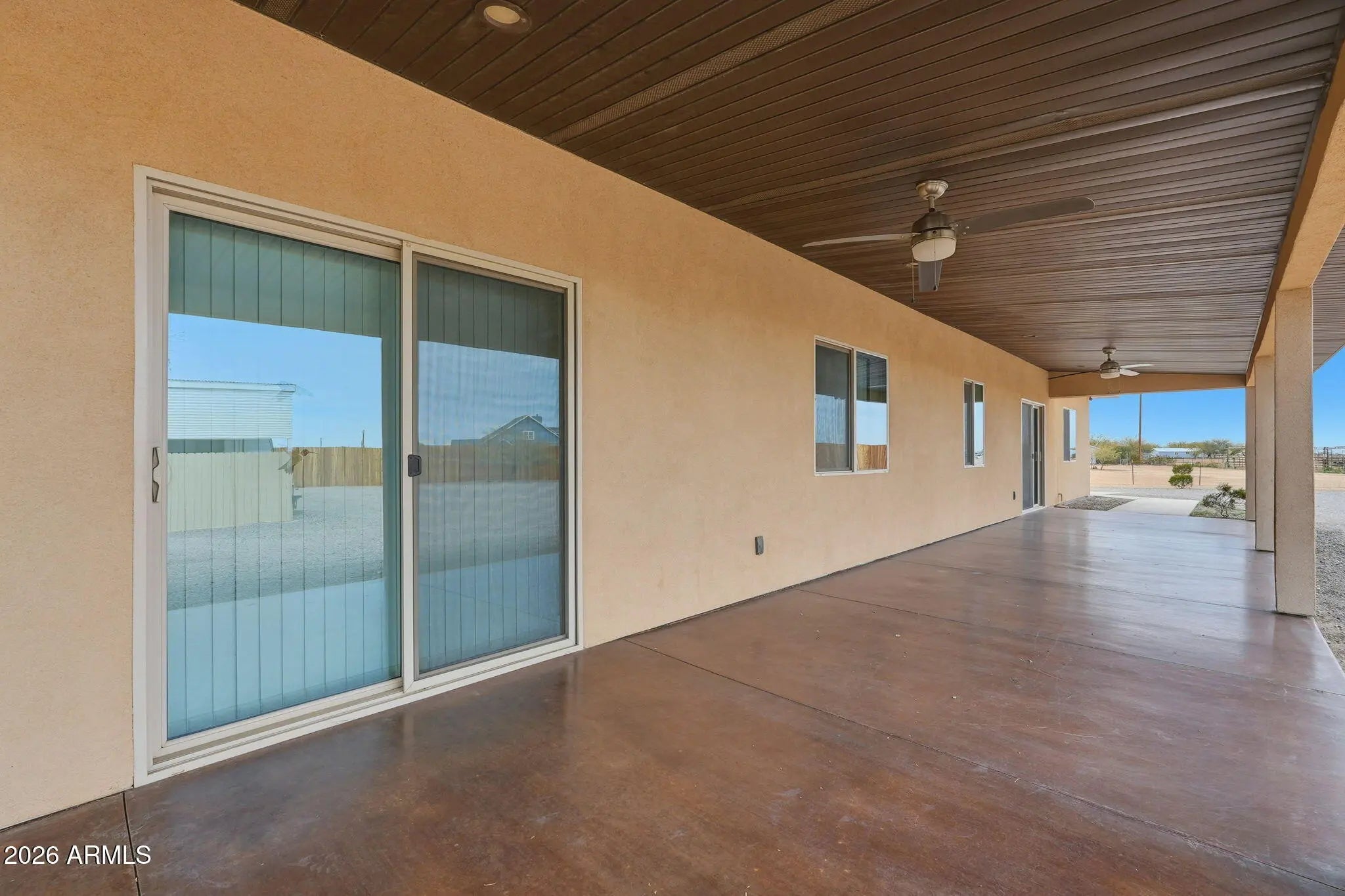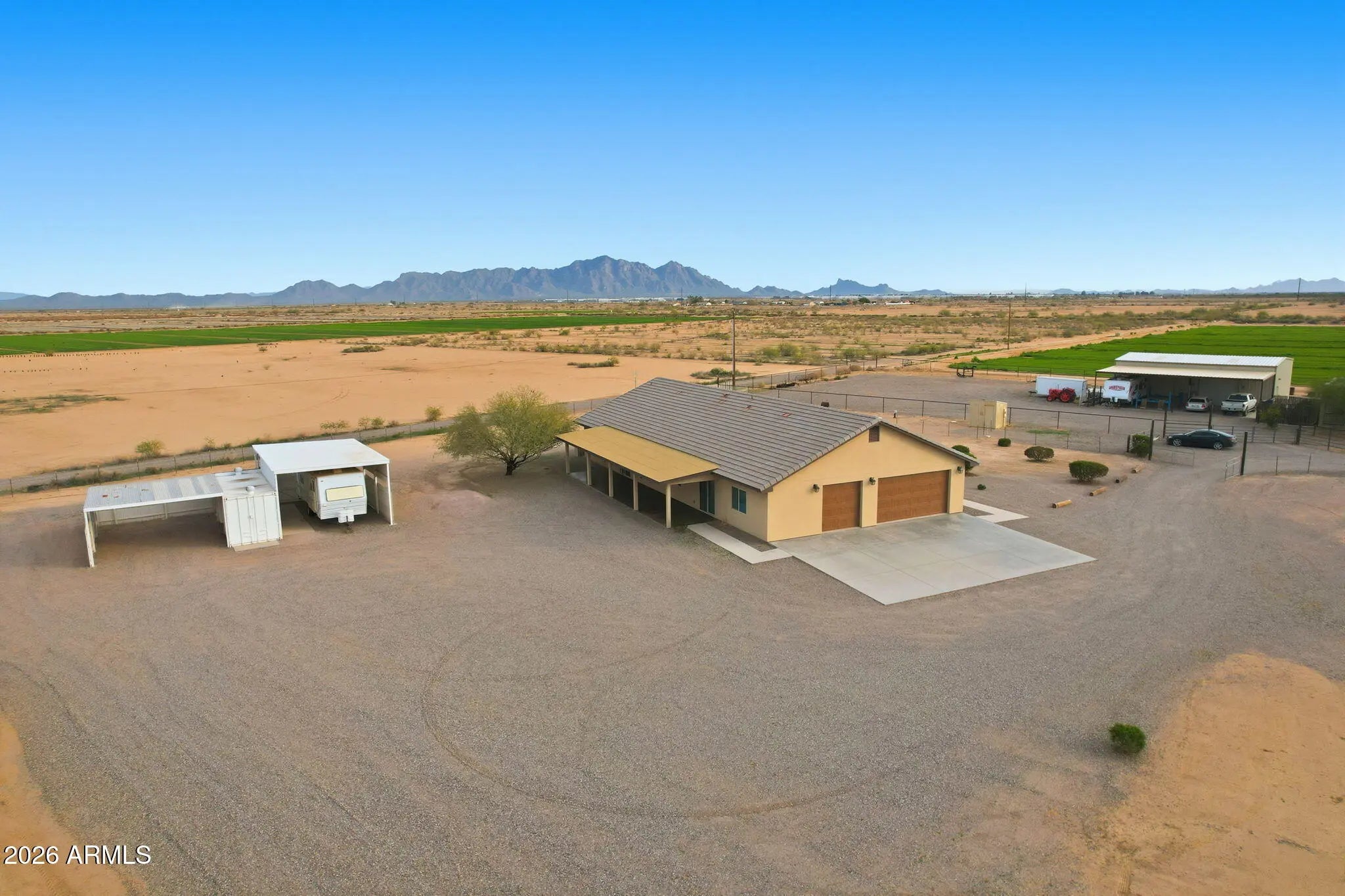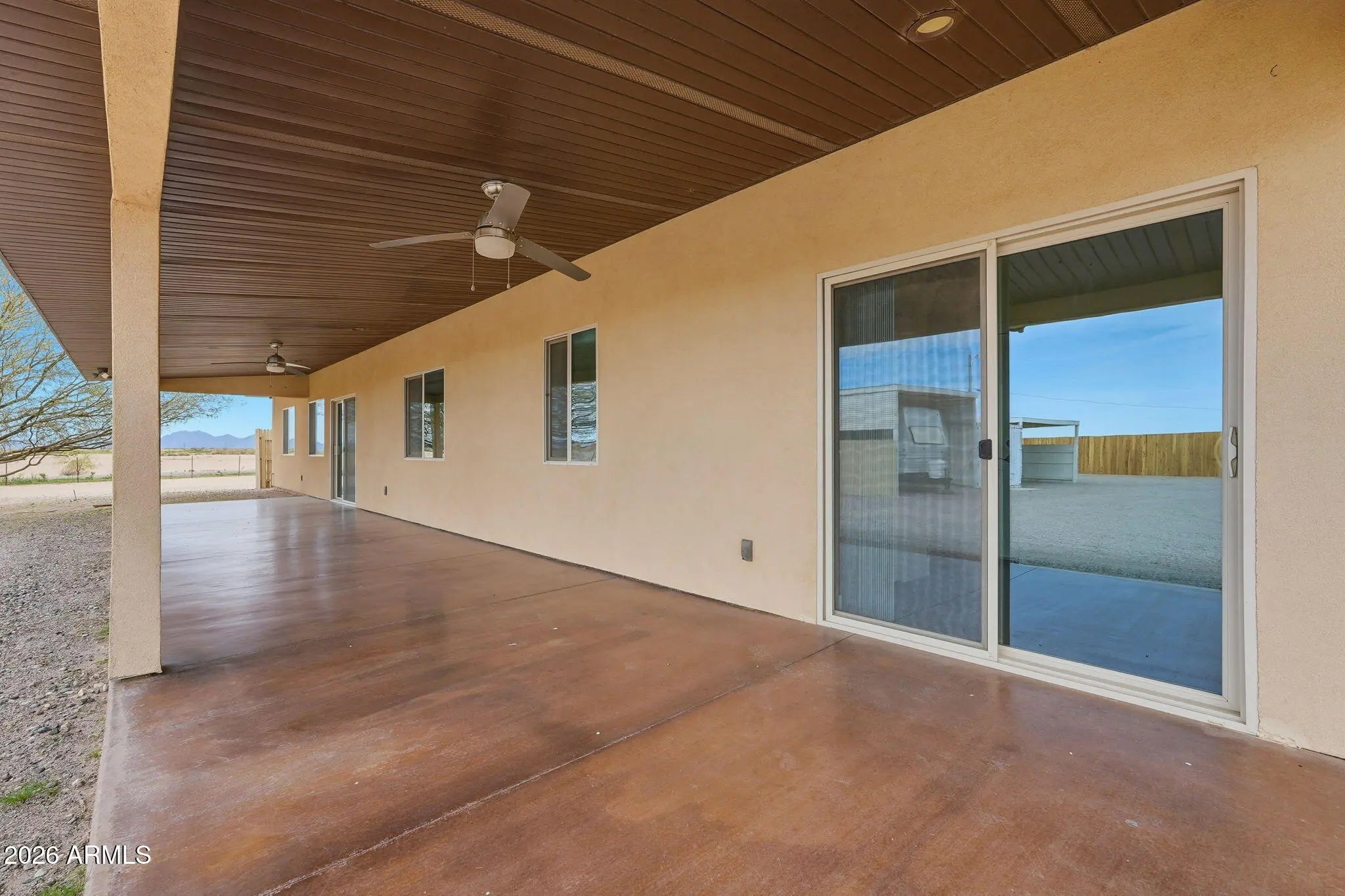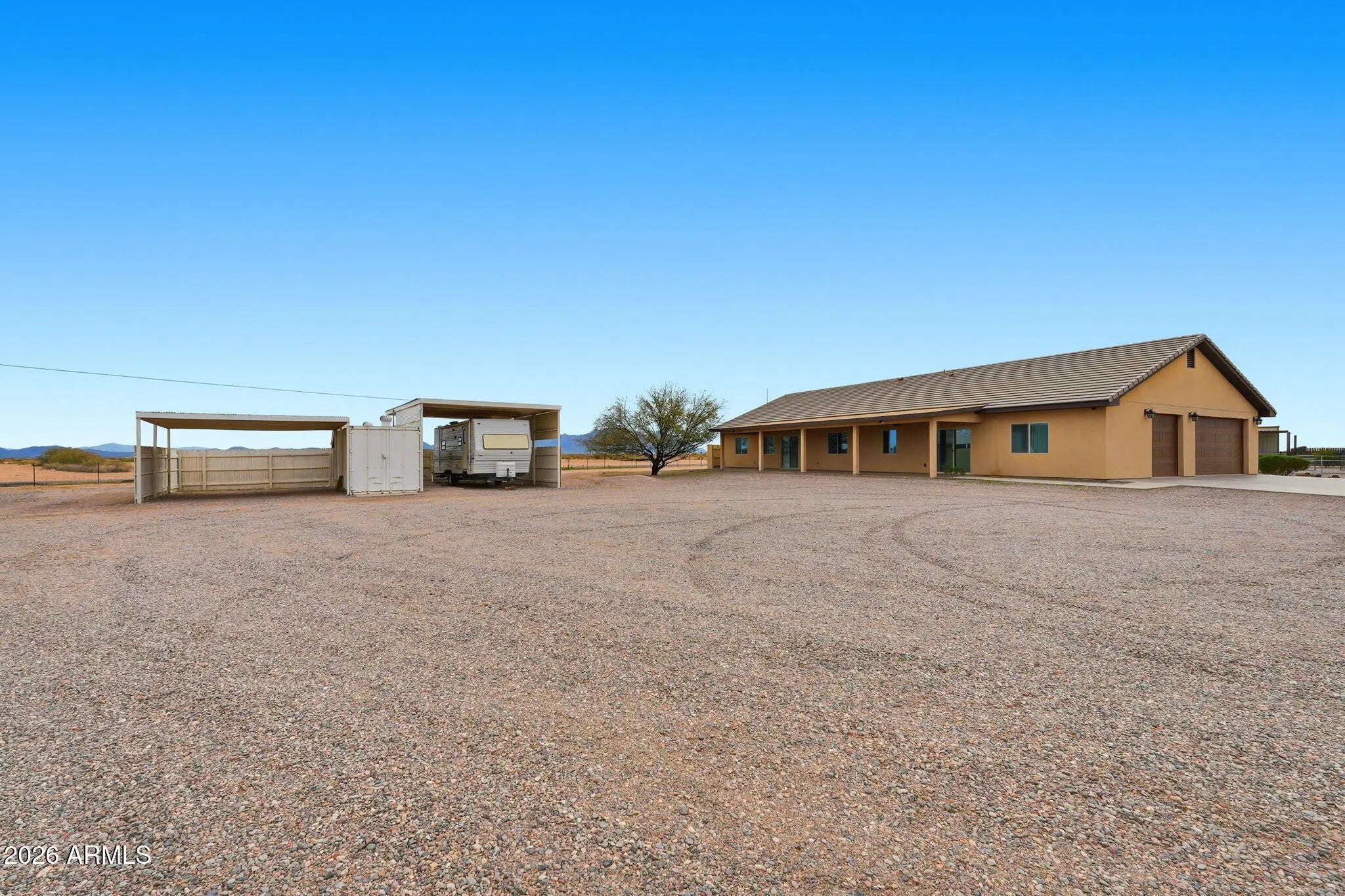 This 4-bedroom, 2-bath home sits on a generous 2.50-acre lot with front-row mountain views. Inside, vaulted ceilings create a bright, open feel throughout the main living areas, showcasing a thoughtful layout and quality craftsmanship. Flooring throughout the home and both front and back pattios have been acid stained with factory/warehouse sealer. Durable tile roofing adds lasting value and peace of mind. Don't forget the 2 a/c units and ceiling fans in each room to keep this home cool during those hot summer months! The primary suite provides a comfortable retreat, while two additional bedrooms and offering a flex room for family, guests, or a home office or hobby space/game room. There is a 3-car garage with 4 vehicles to park outside with additional covered parking as well. Enjoy ample parking and storage with a spacious 3-car garage featuring freshly epoxied floors. The property also includes a fully shaded RV hookup with laundry connections, plus an 8x20 storage container for added convenience. Yard has wire fencing with privacy wood fence across entire back yard. This is the perfect blend of space, functionality, and scenic surroundings