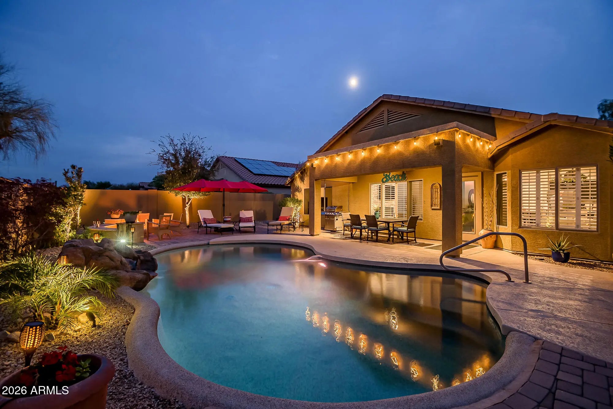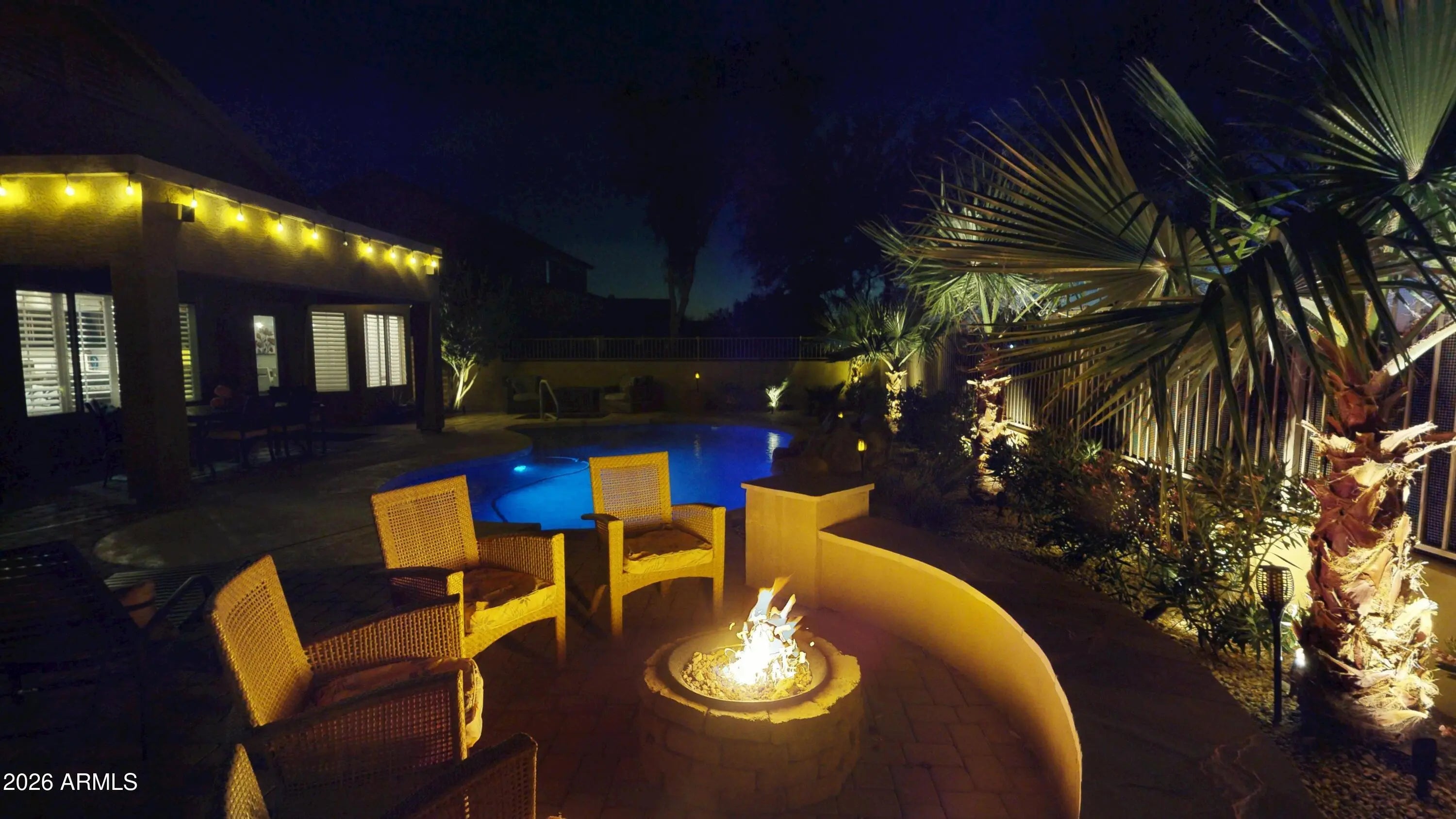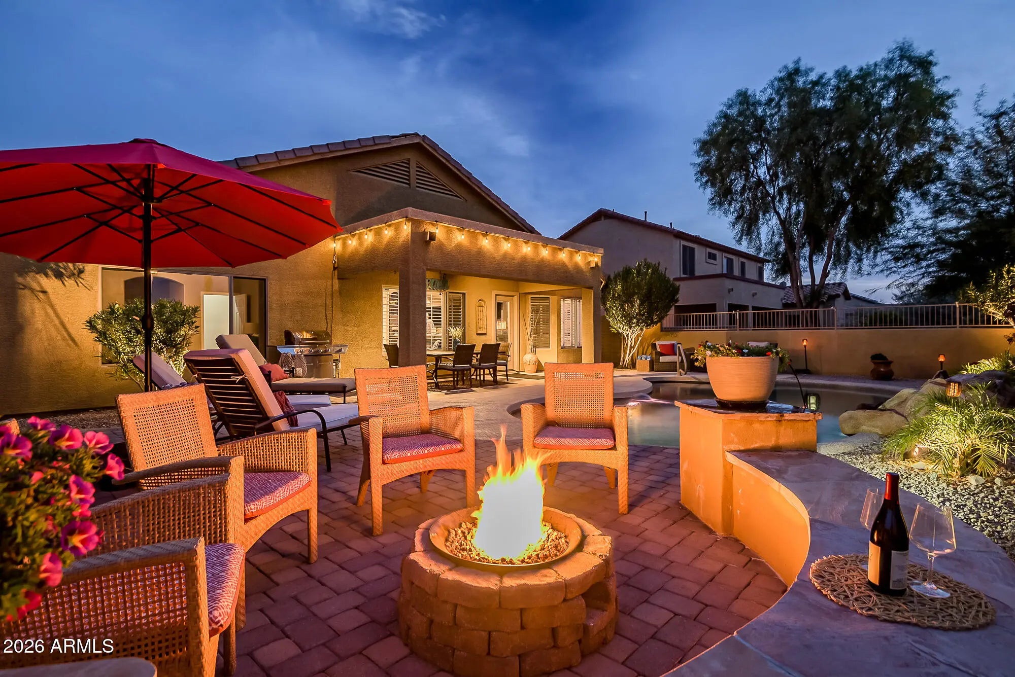Beautifully restored 3-bedroom, 2-bath masterpiece showcasing vaulted ceilings and abundant natural light throughout. The chef's kitchen features elegant granite countertops and custom window treatments, seamlessly flowing into open living spaces ideal for entertaining. Step outside to a resort-style backyard complete with a sparkling Pebble Tec waterfall pool, multiple outdoor fire pits, extended patio, and professionally landscaped yard—perfect for enjoying breathtaking sunset views. The home is enhanced by stone exterior trim, an extended garage, and the rare privacy of two sides backing to a serene greenbelt. A true indoor-outdoor retreat combining style, comfort, and exceptional outdoor living.