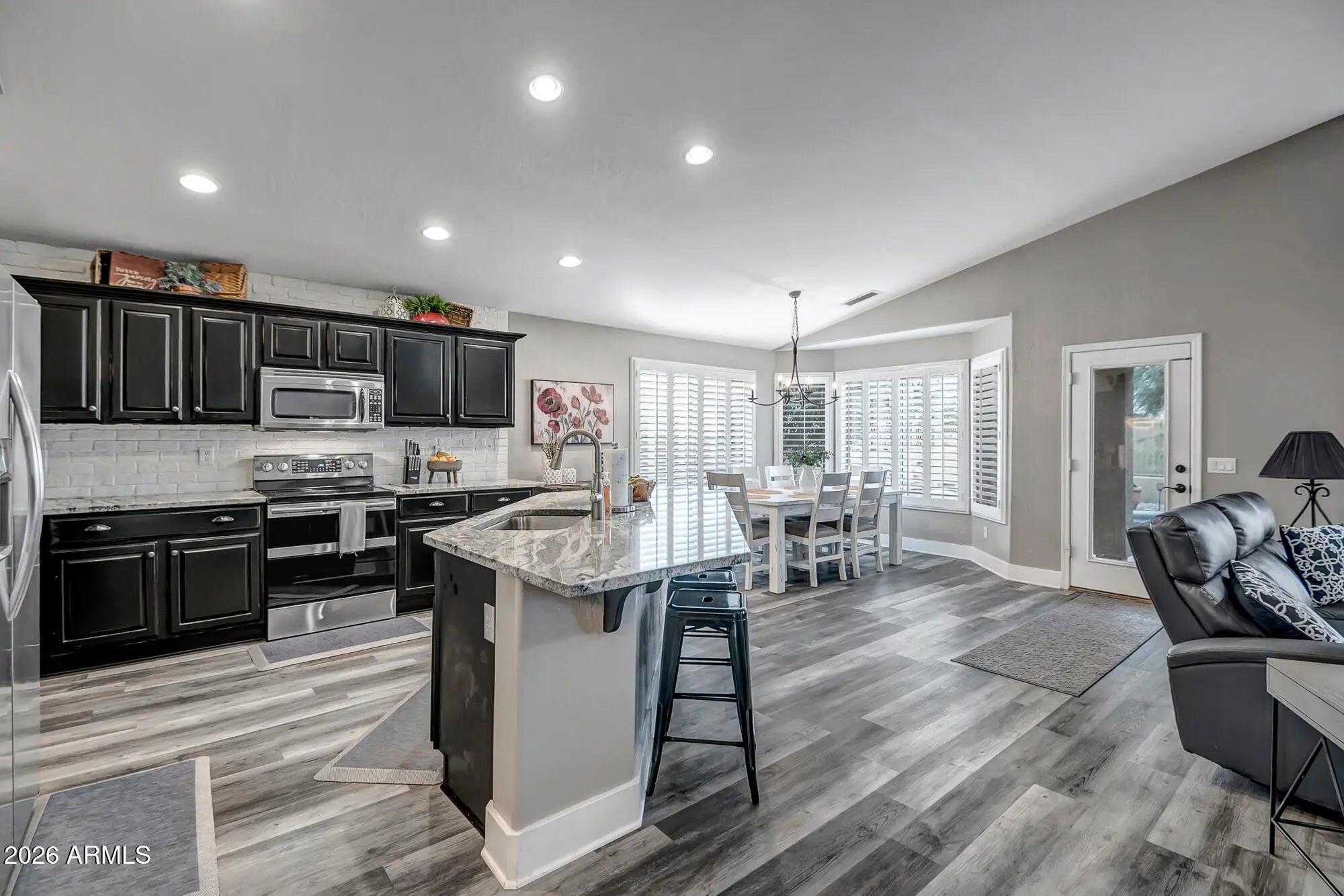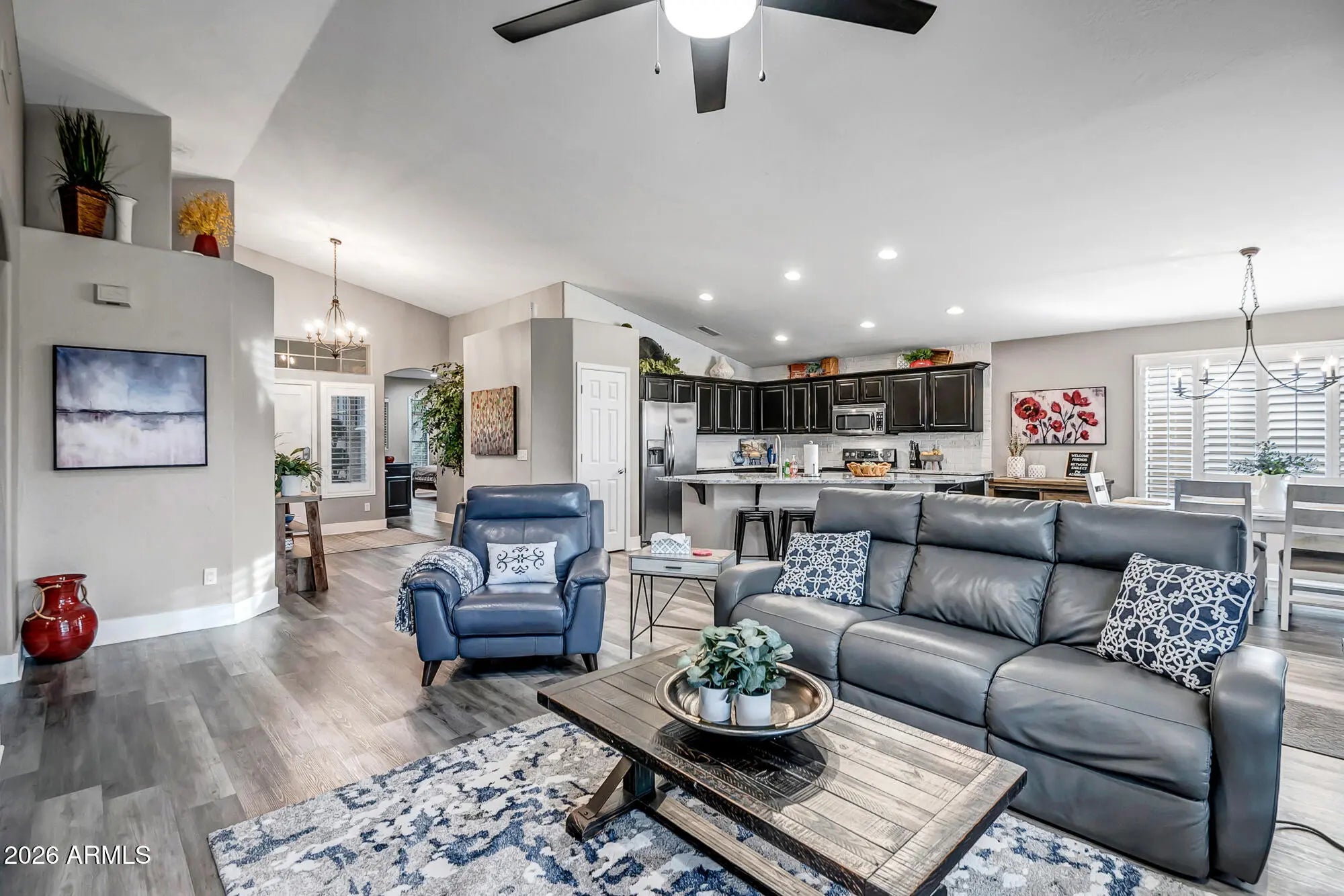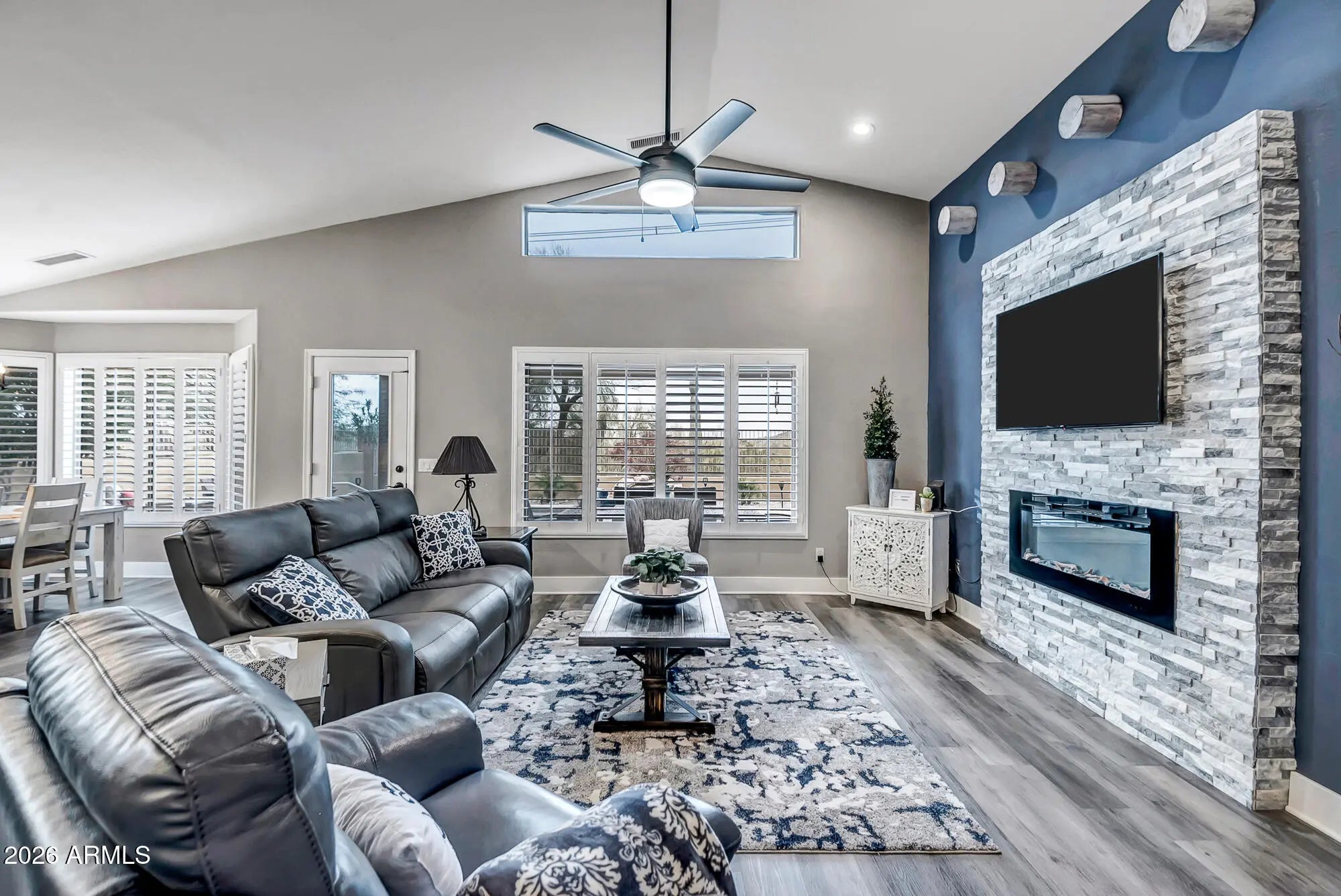 Beautifully restored 3-bedroom, 2-bath masterpiece showcasing vaulted ceilings and abundant natural light throughout. The chef's kitchen features elegant granite countertops and custom window treatments, seamlessly flowing into open living spaces ideal for entertaining. Step outside to a resort-style backyard complete with a sparkling Pebble Tec waterfall pool, multiple outdoor fire pits, extended patio, and professionally landscaped yard—perfect for enjoying breathtaking sunset views. The home is enhanced by stone exterior trim, an extended garage, and the rare privacy of two sides backing to a serene greenbelt. A true indoor-outdoor retreat combining style, comfort, and exceptional outdoor living.