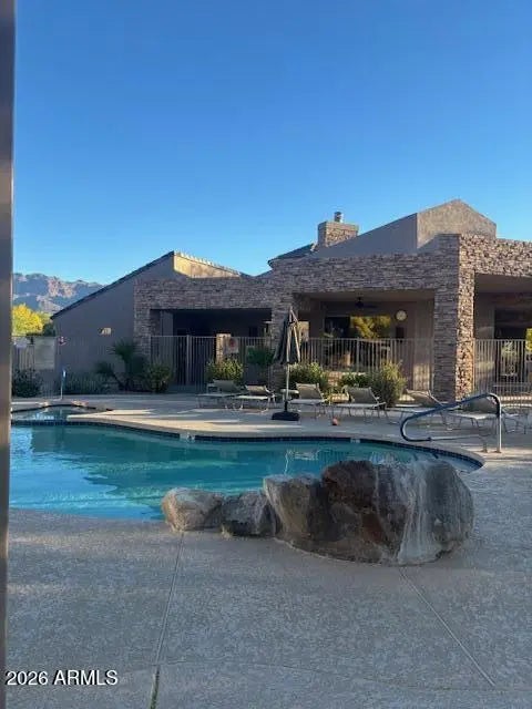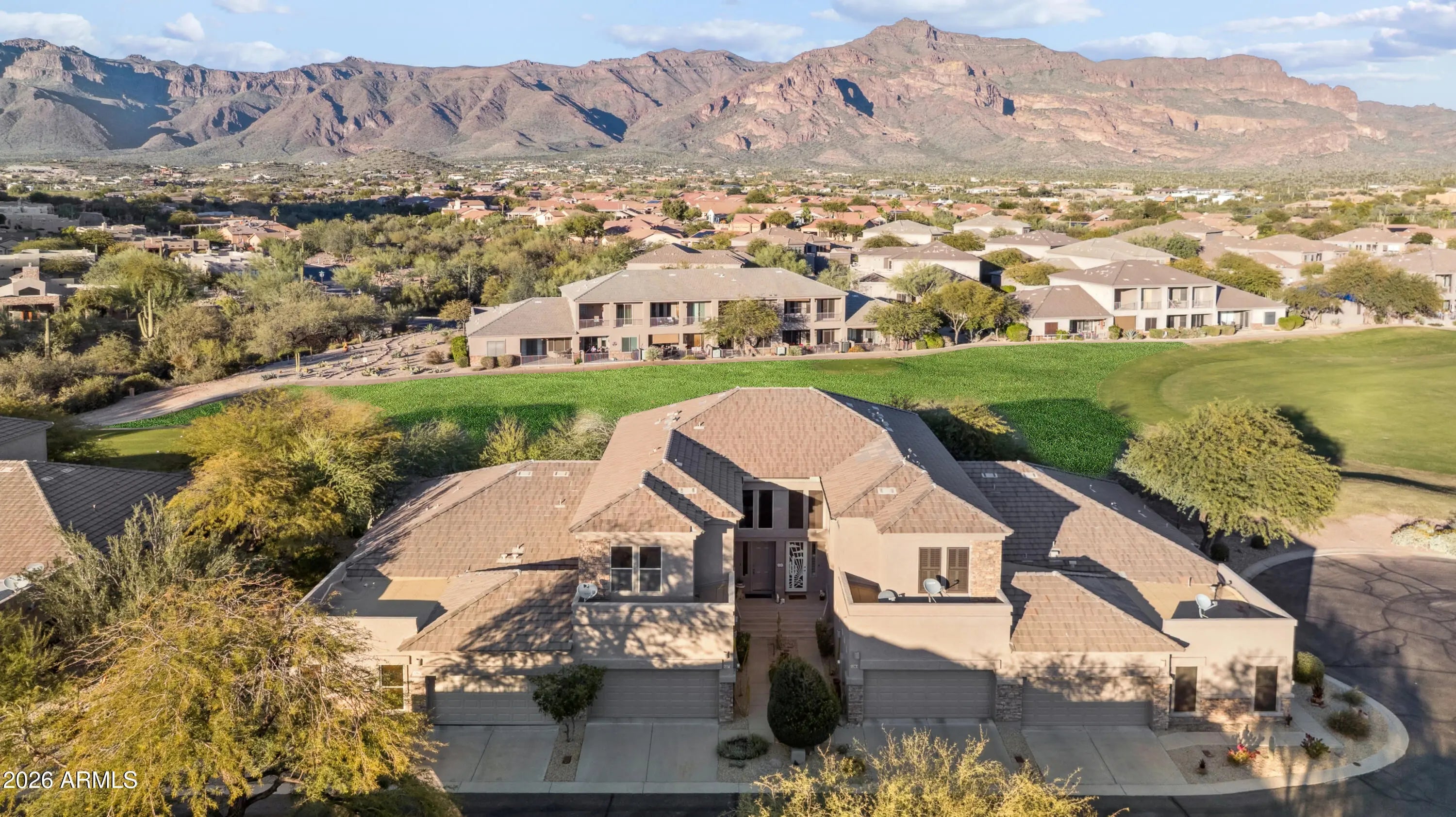 Immaculate 2-3 bedroom gated townhome located on the 3rd fairway of Sidewinder Golf Course in Tesoro. Enjoy some of the best Superstition Mountain views in Gold Canyon from this beautifully maintained home. The kitchen features new cabinets, laminate flooring, and updated appliances. New stackable washer and dryer upstairs. Versatile office or guest bedroom includes a Murphy bed. Covered brick patio plus a private balcony off one of the two primary suites, which offers a garden tub, separate shower, walk-in closet, and stunning golf course views. Clubhouse with heated pool, spa and exercise room. Great for vacation or full time rental. Offered partially furnished as a turn-key opportunity—this is a must see!