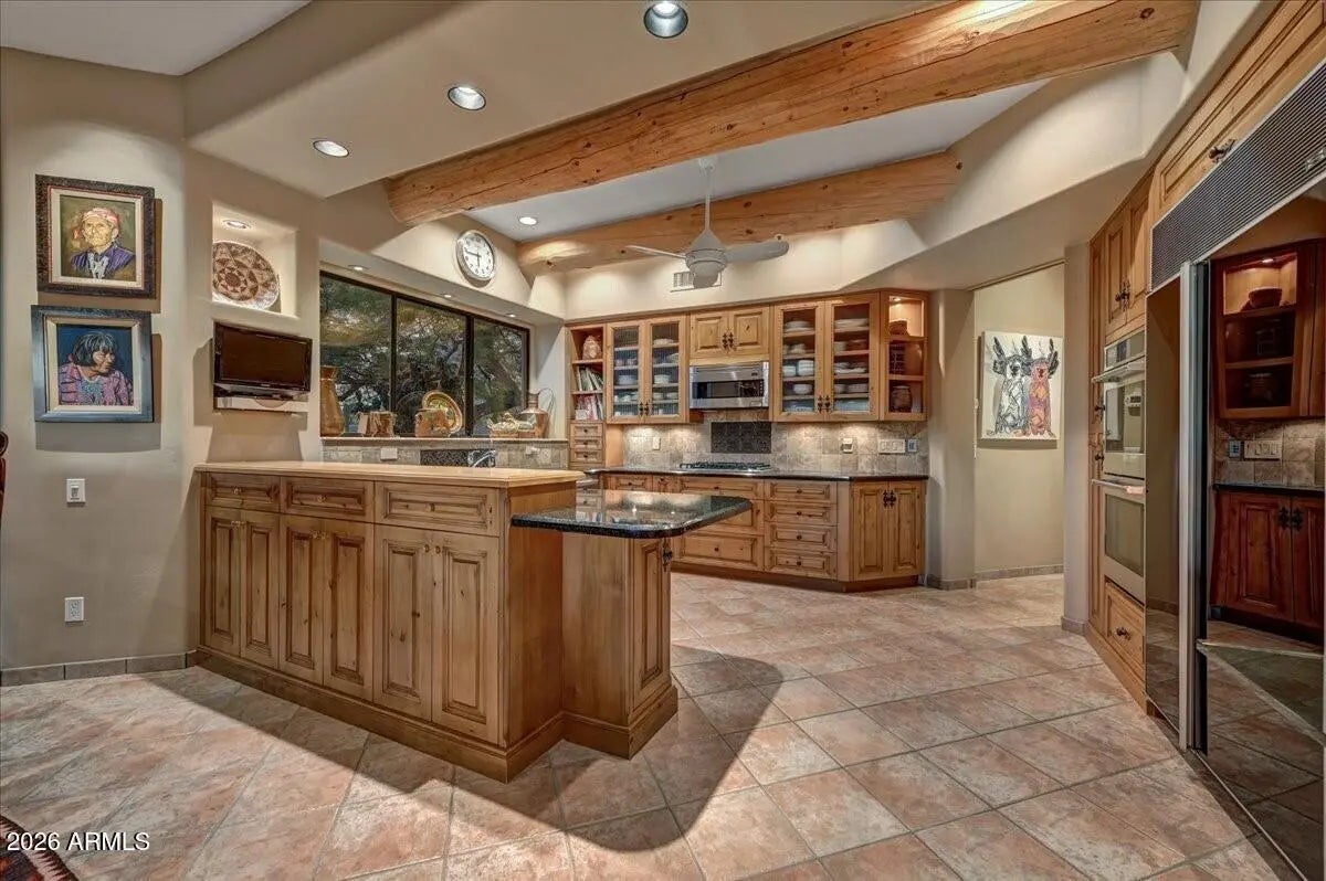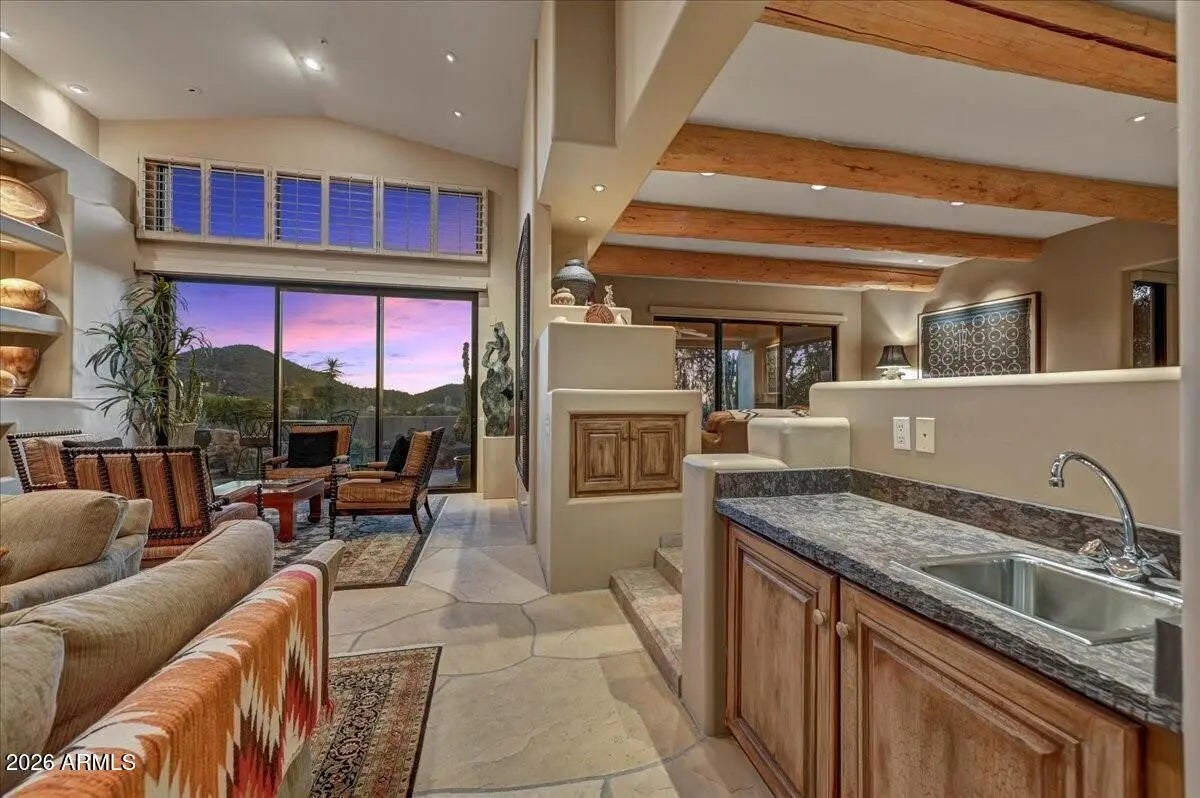 Nestled on a serene cul-de-sac street in the gated community of Quail Ridge at Troon Village, this exquisite home offers breathtaking city light and mountain views from every angle. This home perfectly blends sophisticated indoor elegance with an entertainer's dream backyard, offering a rare combination of luxury, comfort, and breathtaking natural beauty. A Saltillo tiled courtyard welcomes you through custom wood and iron doors, leading to a double door entry that opens into a grand living room with soaring ceilings, flagstone floors, a fireplace with a custom wood mantle, wet bar, and expansive sliding glass doors that seamlessly connect indoor living to the resort-style backyard and gorgeous mountain vistas. The gourmet kitchen features granite countertops, a designer tile backsplash, a Viking gas range, Sub-Zero refrigerator, LG dishwasher, and a breakfast bar with seating, flowing effortlessly into the dining room. The family room features a custom kiva fireplace, and built-in art niches all under elegant, beamed ceilings. A versatile den, (which can be converted into fourth bedroom), showcases custom wood shelving and a closet, while a powder room is pre-plumbed to accommodate a future shower. The primary suite exudes luxury with rich hardwood floors, a spa-inspired bath with dual sinks, walk-in shower, Jacuzzi soaking tub, and an expansive walk-in closet. All guest bedrooms are ensuite with wood shutters. Outdoors, the resort-style yard is a private oasis with a covered patio featuring built-in heating and surrounded with automatic screens on all sides as well as a wind sensor. Off the covered patio is an outdoor fireplace and a built-in BBQ, perfect for entertaining. The heated Pebble Tec pool features a rock waterfall and spa, and a raised deck for enjoying sunsets over city lights and mountains. The backyard sides a NAOS for added privacy and serenity. Additional features include three fireplaces, one is wood burning, custom self-closing cabinetry throughout, surround sound, both indoor and outdoor, and a security home system. There are sunscreens in the primary suite, living, and family rooms, along with a NUVO water filtration system, reverse osmosis, professionally landscaped with extensive exterior lighting both in front and back.