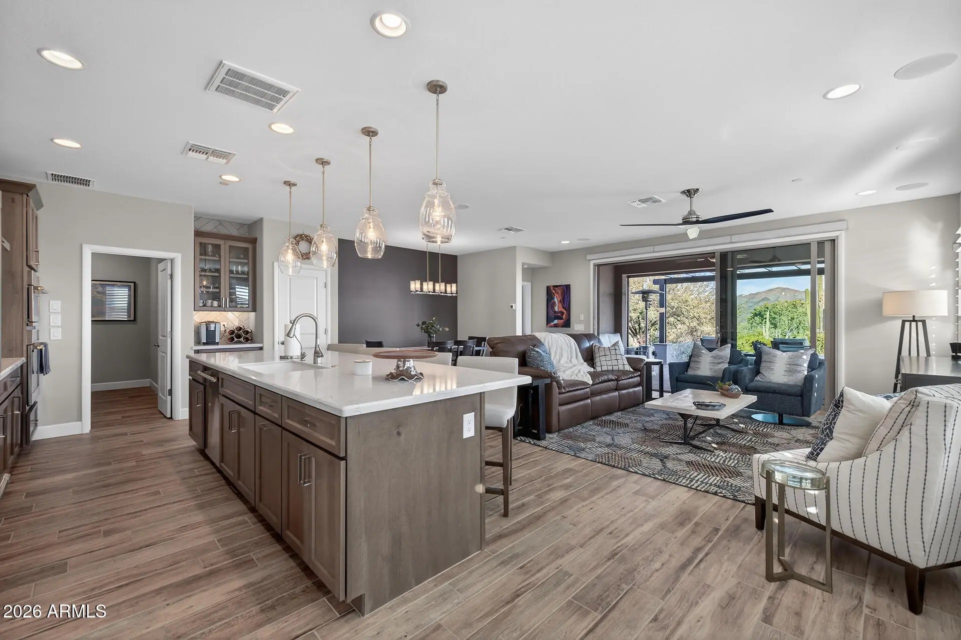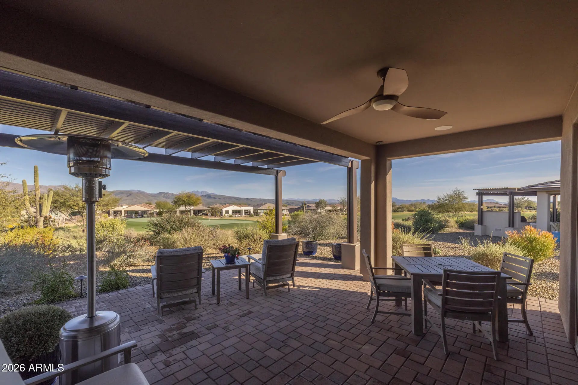 Set on a rare golf course lot, this stunning Evia floorplan offers elevated desert living with breathtaking mountain views from the back patio. Move-in ready with all appliances included! Designed for seamless indoor-outdoor enjoyment, the expansive great room features multi-length sliding doors that open directly to the course. The outdoor space is truly exceptional, showcasing a covered patio, extended pergola, and premium landscape lighting, perfect for sunset views over the fairway. Inside, the home is finished with neutral tones, plantation shutters, and elegant wood-look tile flooring throughout. The gourmet kitchen is a showstopper with built-in Monogram appliances and a spacious island ideal for entertaining. Additional upgrades include a reverse osmosis system, water softener tankless water heater. Do not miss your chance for a golf course living with a mountain view backdrop! The amenities at Verde River are World Class with Tom Lehman inspired eighteen-hole Golf course, tennis courts, 12 pickleball courts, and bocce ball, heated lap pool and Resort style swimming pool, hot tub, Afterburn fitness center, Helen's demonstration Kitchen for cooking classes and a 7.5 acre dog park. The community center has casual poolside dining at Eddy's Diner and gourmet dining at award-winning Needle Rock Kitchen and Tap, Alvea Spa with full-service Salon and Spa amenities, Art Loft and events center. Trilogy at Verde River is adjacent to the Tonto National Forest and is situated in the middle of miles and miles of hiking and biking trails.