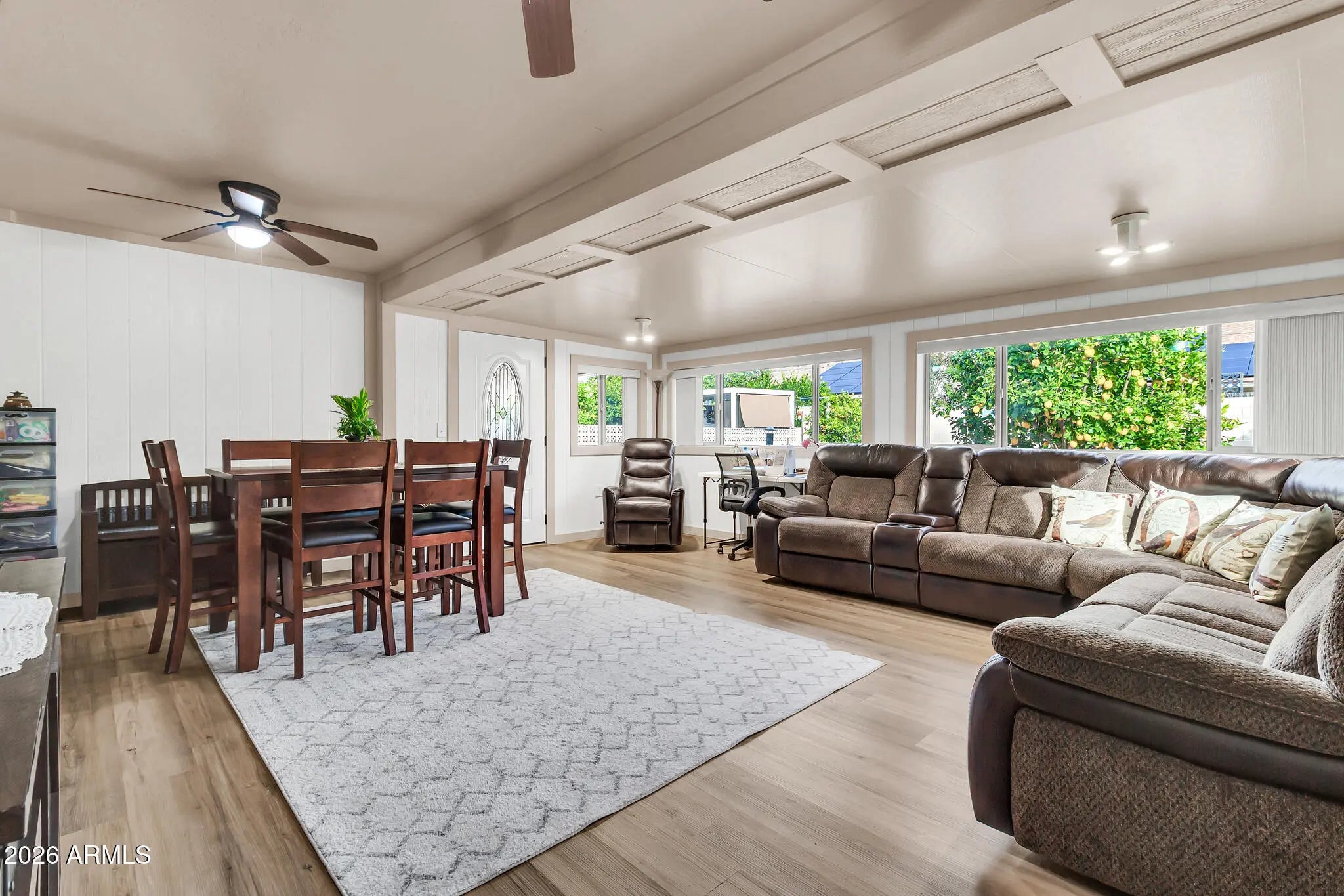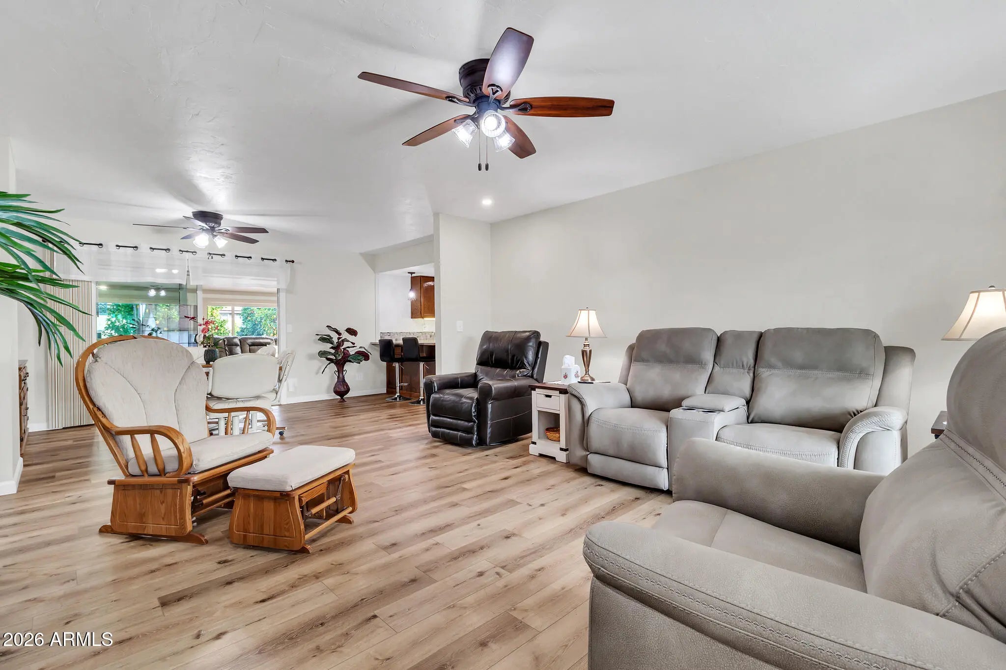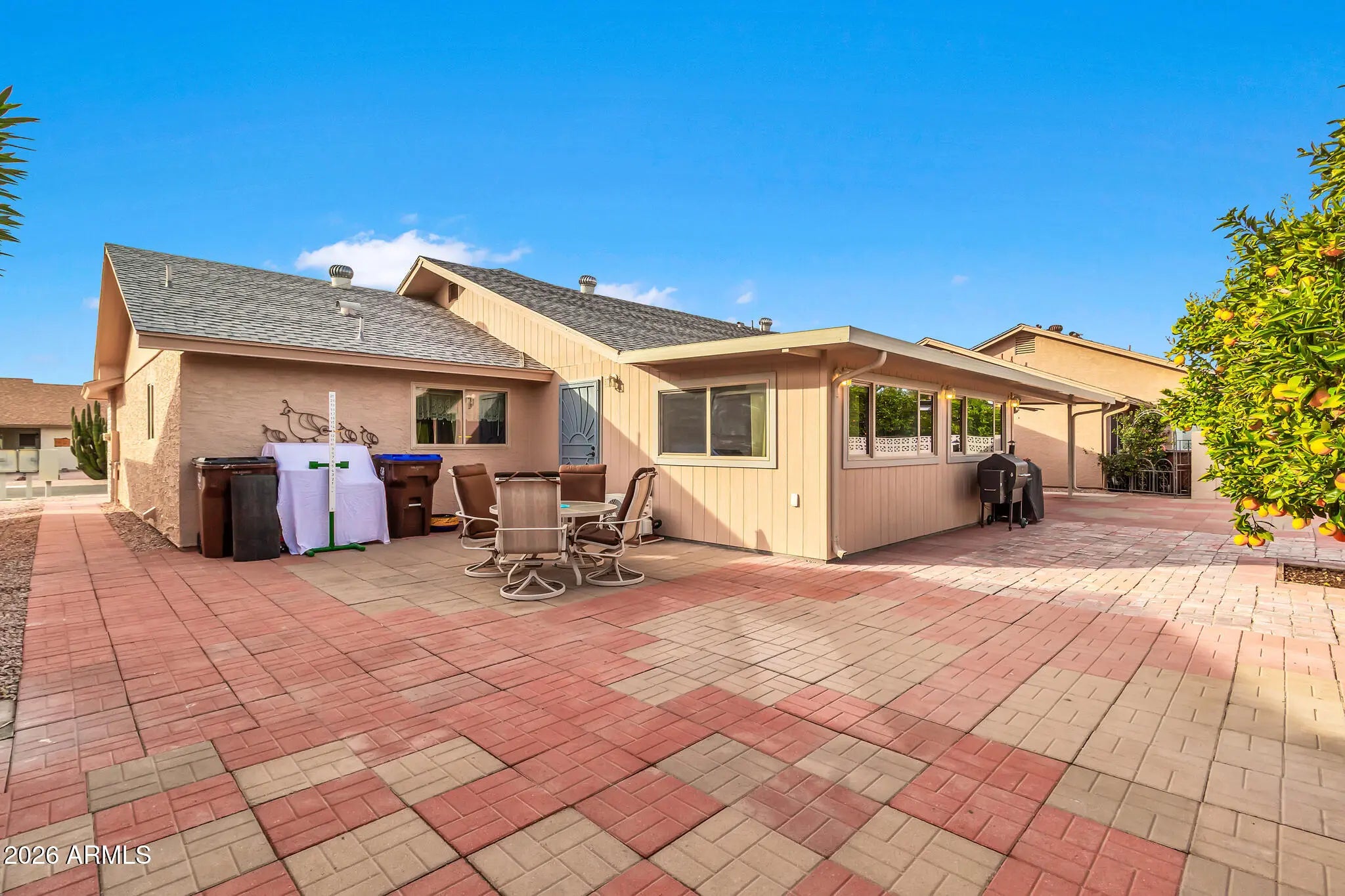 Charming and beautifully updated 2-bedroom, 2-bath home located in a gated Mesa 55+ community offering resort-style amenities. The interior features beautiful wood laminate flooring throughout and a well-appointed kitchen with tiled granite countertops, matching backsplash, wood cabinetry, and black stainless steel appliances. Oversized 350 sqft climate controlled Arizona/Bonus room. Great for sewing or crafts. Step outside to a spacious backyard featuring expansive patio areas, lush landscaping, and mature citrus trees including three orange and two grapefruit trees. Perfect for relaxing or entertaining. Residents enjoy access to a community clubhouse, fitness center, pool, and golf course, making this home a must-see for those seeking comfort, convenience, and an active lifestyle